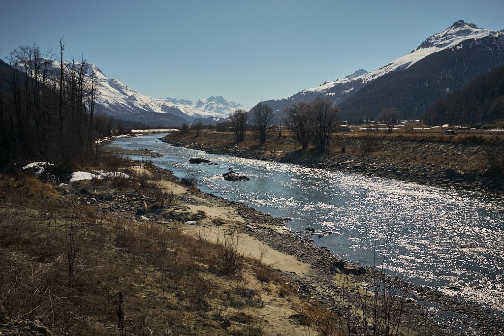 Die Fahrt durchs Oberengadin kam mir heute zäh und unendlich langsam vor, was sicher auch dem lästigen Malojawind von vorne geschuldet war. Es ging eine gefühlte Ewigkeit, bis ich an Zuoz vorbeikam und nochmals eine bis La Punt und Bever. Seit Zuoz war ich wieder auf dem geteerten Radweg neben der Strasse unterwegs, der sich ab La Punt dann aber leider in eine Schlammpiste verwandelte. So verliess ich ihn bei Bever und fuhr dort stattdessen ins Dorf hinein, um auf den Seitenstrassen weiter nach Samedan, Celerina und St. Moritz zu gelangen. In Celerina wurde ich durch eine Baustelle abgelenkt, verpasst dadurch den richtigen Weg und landete erneut auf einer Radweg-Schlammpiste, die beim St. Moritzersee und in unmittelbarer Nähe vom Bahnhof endete.