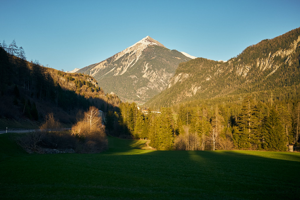 Endlich im Dorf Bivio angekommen, erblickte ich das Postauto nach Tiefencastel mit montierten Biketrägern. Dies wäre meine zweite Chance auf eine problemfreie Heimkehr heute gewesen, aber ich liess auch sie verstreichen. Stattdessen fuhr ich im Eiltempo im immer schattiger werdenden Tal vorbei am Marmorera-Stausee, an Sur und Rona, bis sich die Landschaft wieder öffnete und den Blick auf Savognin und die vertrauten Bergüner Stöcke freigab. Von hier war es nicht mehr weit bis nach Tiefencastel (wenngleich ich froh war, den mir unheimlichen Autotunnel kurz davor in Abwärtsrichtung und schnell durchqueren zu können). Weiter ging es mit Blick auf die immer noch in der Sonne liegende Muchetta durchs Albulatal nach Alvaneu Bad und Dorf. Diesen letzten Teil kannte ich auswendig und hatte ihn auch schon mal völlig erschöpft und in der Dunkelheit befahren, sodass ich jetzt nicht ganz so erschöpft und noch im Tageslicht entspannt und stressfrei heimwärts kurbeln konnte.