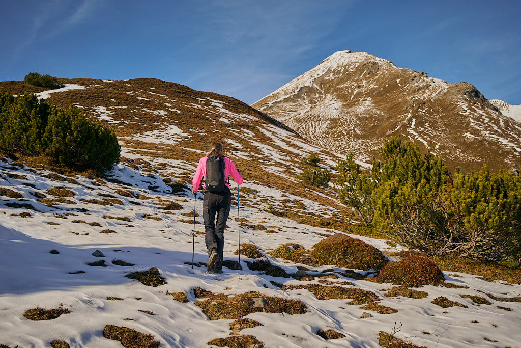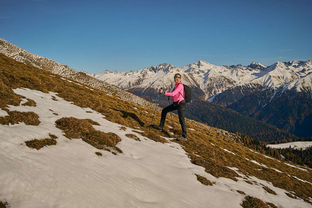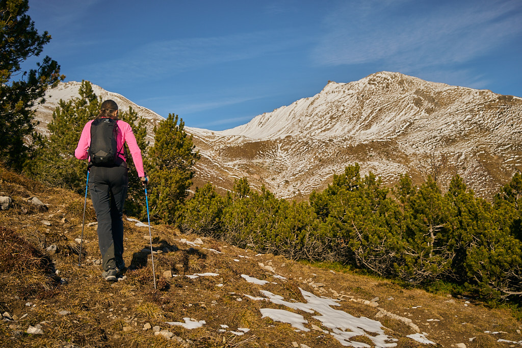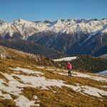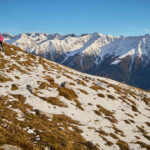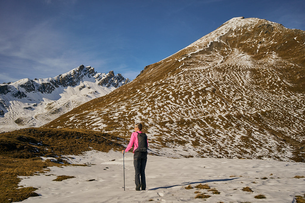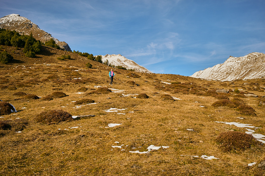 Mit dem Bike zur Schmittner Alp und Alp Afiein, dann zu Fuss weiter zum Hubel und Richtung Tiaun, bis 1000 Höhenmeter erreicht waren. Noch ein Stück westwärts, um einen Blick auf die bereits zugeschneiten Erzgruben und den Chegelplatz zu bekommen. Auf dem Rückweg Abfahrt über Pardela.
