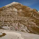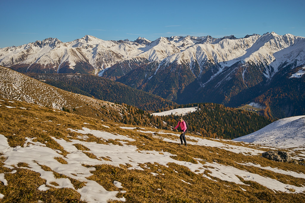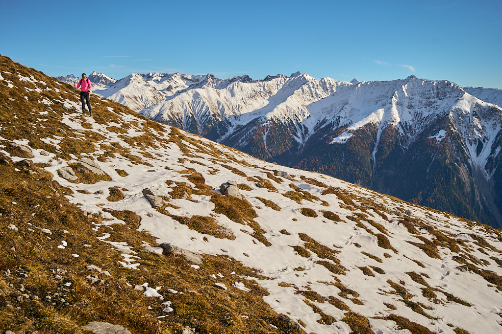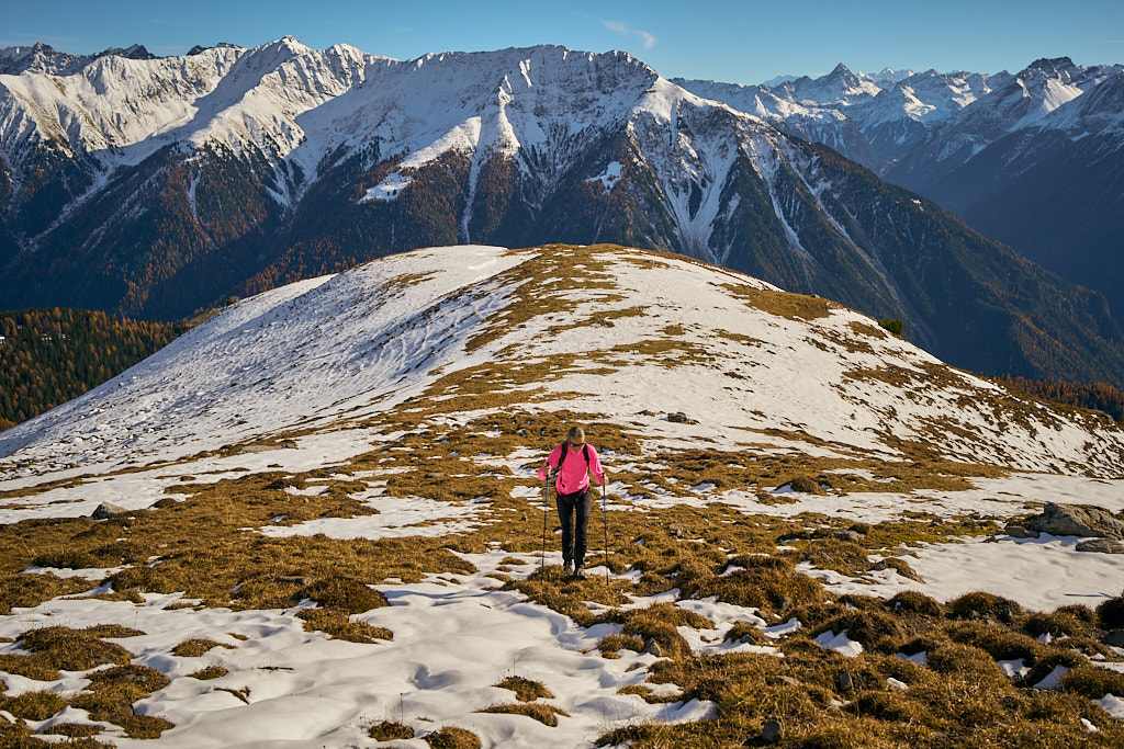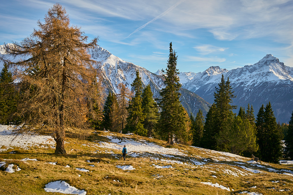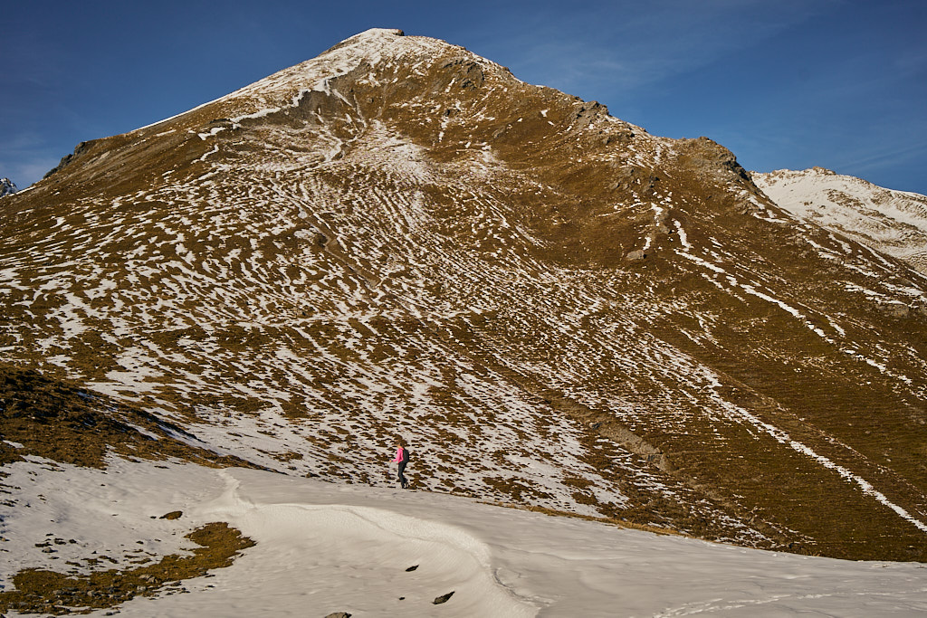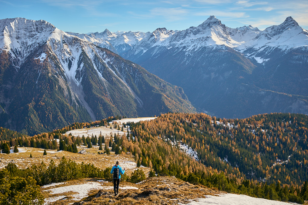 Mit dem Bike zur Schmittner Alp und Alp Afiein, dann zu Fuss weiter zum Hubel und Richtung Tiaun, bis 1000 Höhenmeter erreicht waren. Noch ein Stück westwärts, um einen Blick auf die bereits zugeschneiten Erzgruben und den Chegelplatz zu bekommen. Auf dem Rückweg Abfahrt über Pardela.