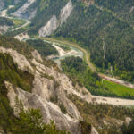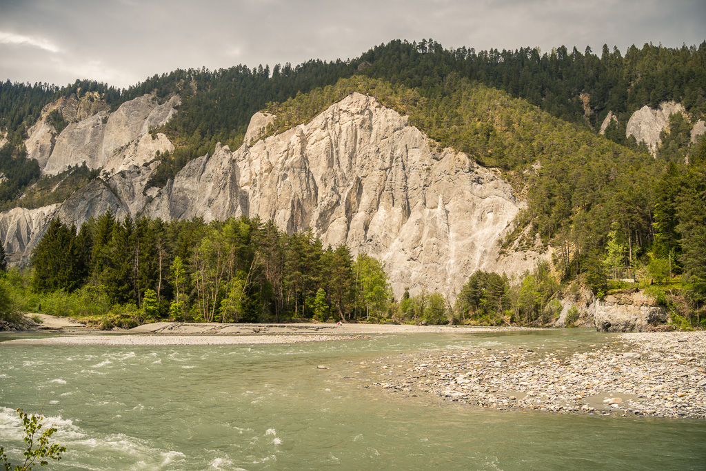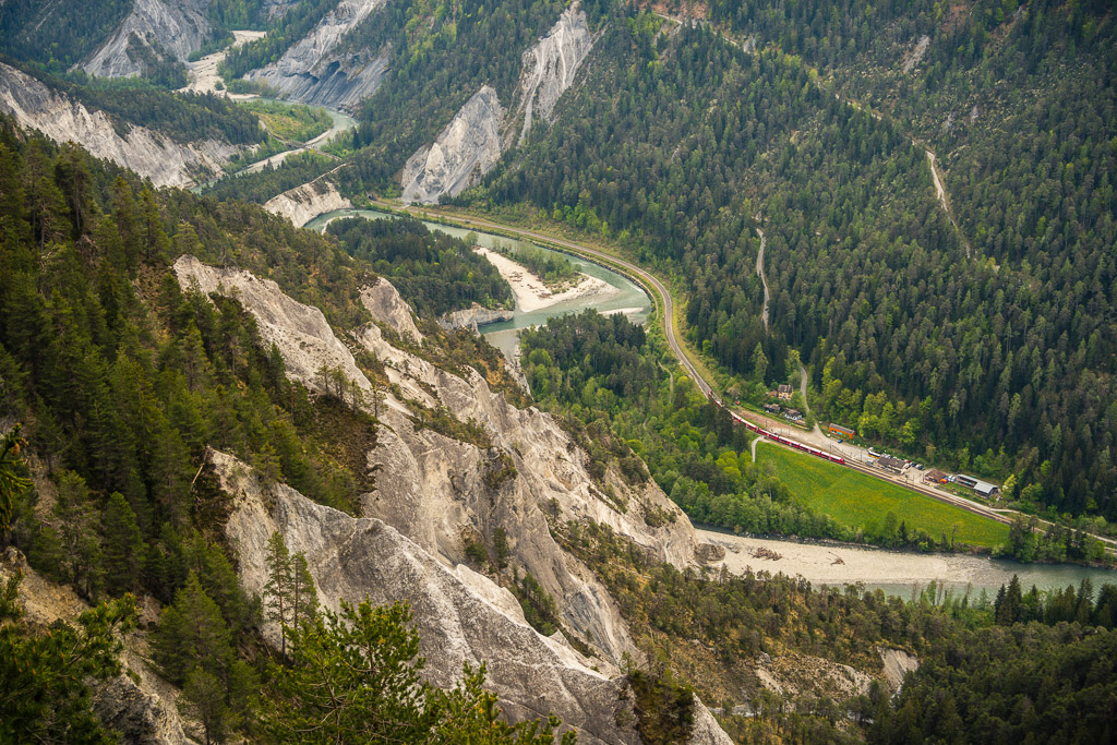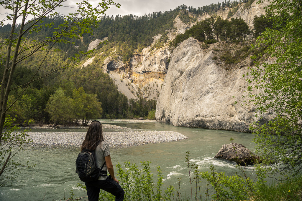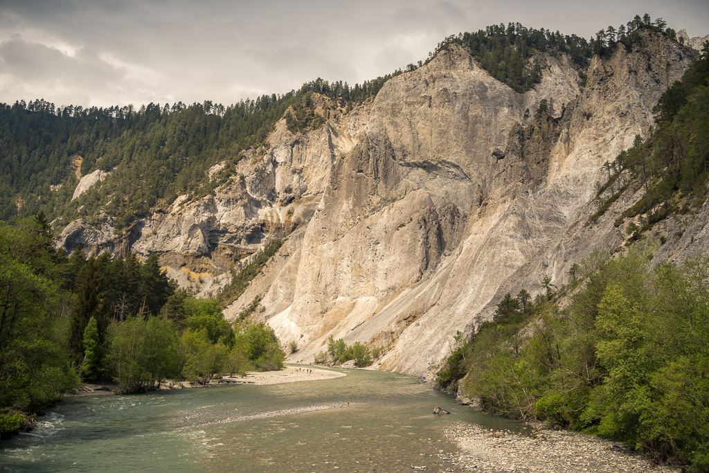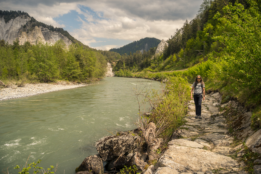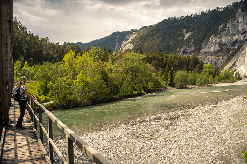 Der Weiterweg führte nun durch den Wald nach Ransun, wo ein steiler Abstieg in die Rheinschlucht bis auf die Höhe des Hinterrheins begann. Unten angekommen, überquerten wir den breiten Fluss auf einer Eisenbahnbrücke und gelangten auf einem schönen Uferweg dem Rhein entlang bis zum Bahnhof von Versam-Safien, von wo aus ein stündlicher Zug der Rhätischen Bahn uns wieder zurück zum Bahnhof Chur brachte.