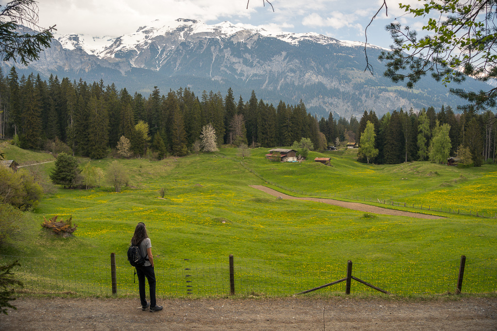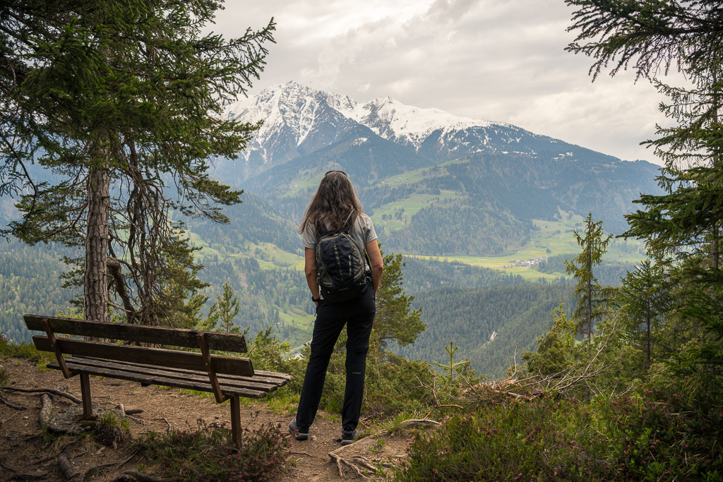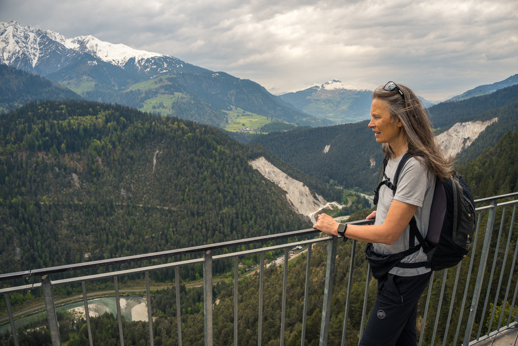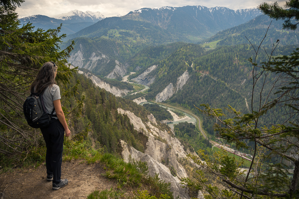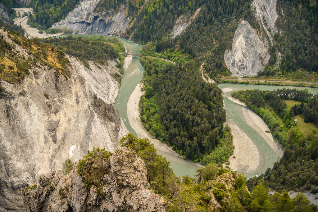 Vom Caumasee wanderten wir weiter nach Conn, einer grossen Lichtung im Wald mit Viehweiden, einigen Hütten und einer grossen Grillstelle. Etwas dahinter kamen wir zu einem grossen Aussichtsturm, der einen herrlichen Tiefblick auf die Rheinschlucht und ihre skurrilen Felsabbrüche und Formationen bot.