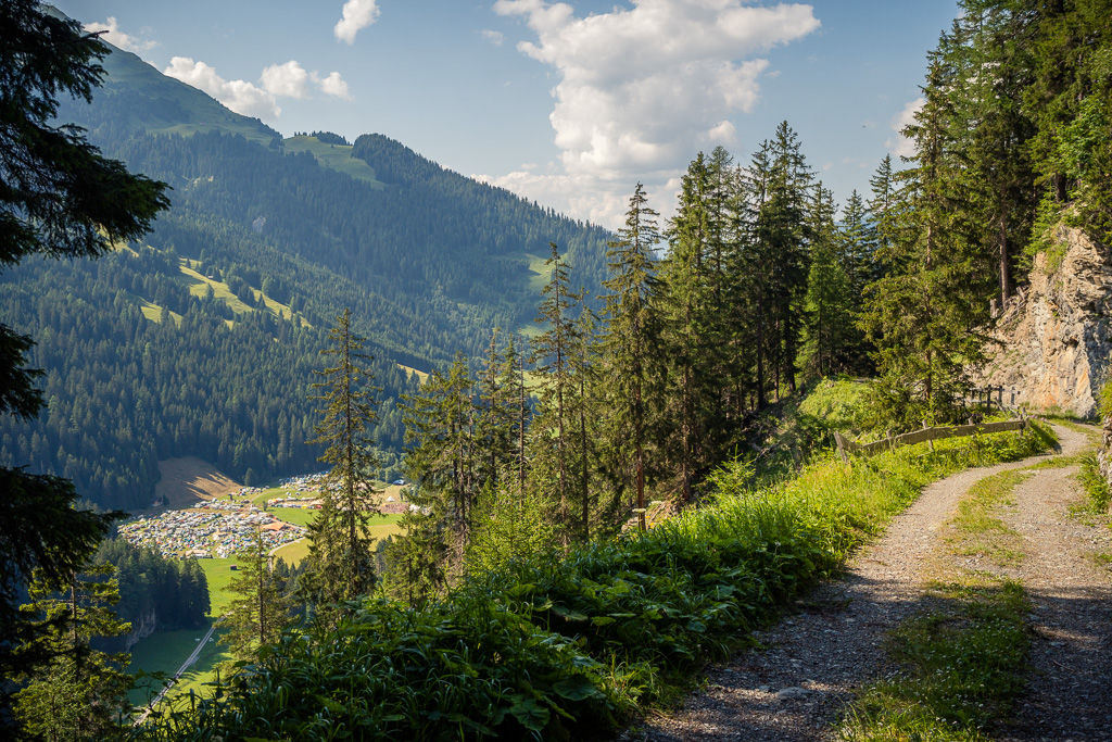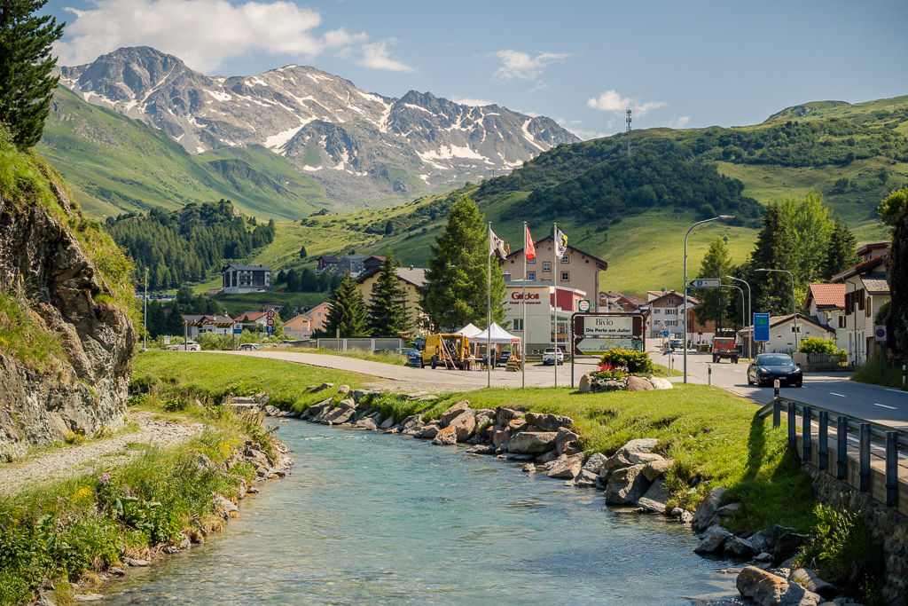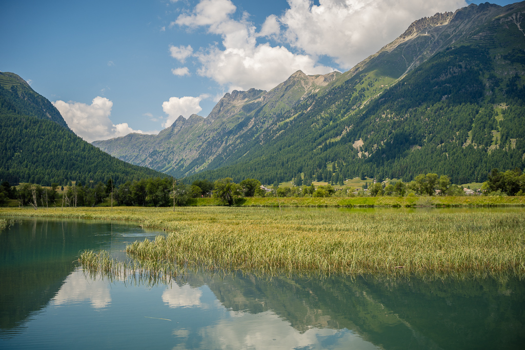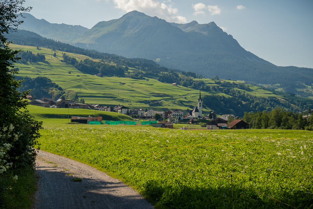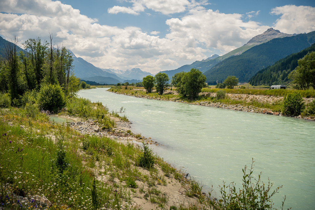 Danach fuhr ich über die Hauptstrasse und am Campingplatz vorbei weiter nach Tinizong. Diesen Weg kannte ich schon von meinem kürzlichen Fotoausflug zum Irontrail Savognin und in rasanter Fahrt erreichte ich Tinizong und fuhr am Ufer der Gelgia entlang nach Savognin. Auch beim kleinen Badesee dort stiess ich auf ein wahres Getümmel und fröhliches Treiben. Hier hatte die Erholung für mich allerdings ein vorläufiges Ende, da hinter dem See dann erneut ein mühsamer Aufstieg nach Salouf und Mon bevorstand.