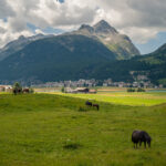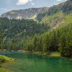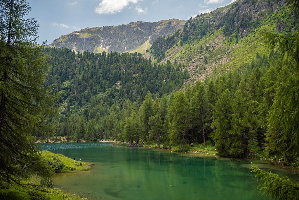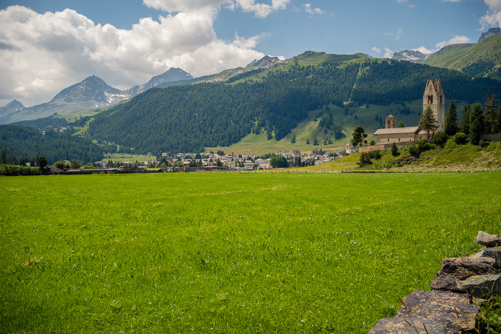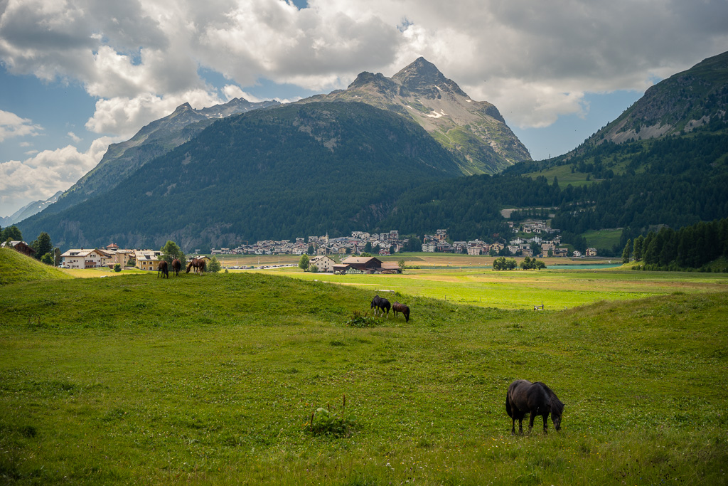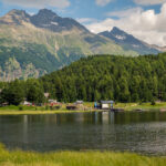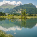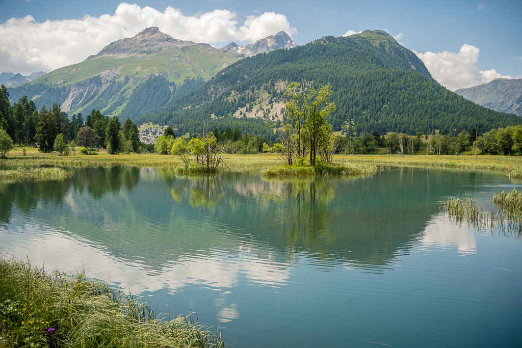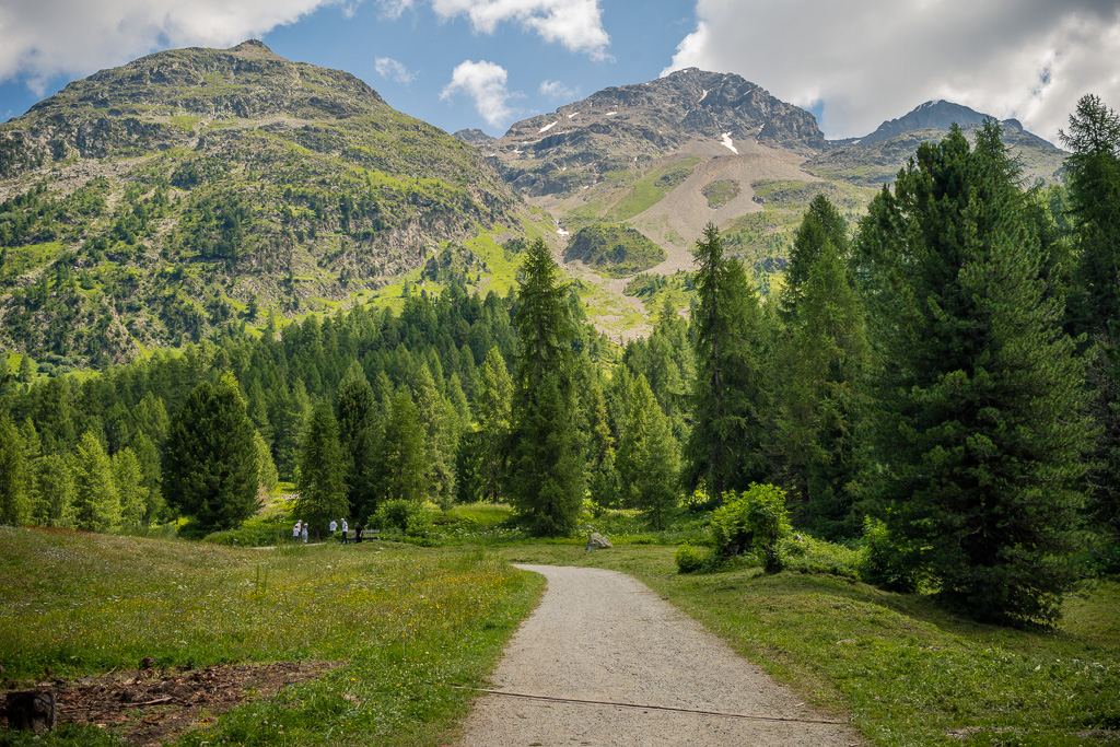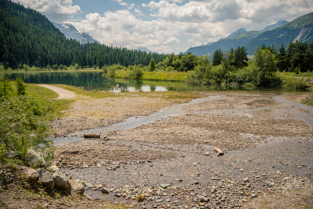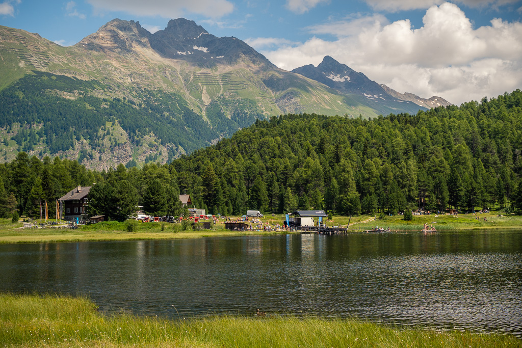 Im Engadin war die Luft deutlich kühler als noch im Albulatal und der Wind kam für einmal auch nicht von vorne. Die Fahrt auf dem Inn-Radweg der Inn entlang nach Punt Muragl war deshalb sehr angenehm und entspannt. Auch auf diesem Rad-, Wander- und Spazierweg waren sehr viele Leute unterwegs; der Campingplatz und die Grillplätze beim kleinen Lej da Gravatscha waren voll belegt. Bei Punt Muragl, wo sich die Radwege nach Pontresina, Celerina und St. Moritz trennen, fuhr ich in den Wald hinein und an vielen Spaziergängern vorbei zum Lej da Staz. Diesen Bergsee hatte ich bisher eigentlich nur idyllisch und ruhig daliegend in Erinnerung. Heute aber war reges Baden am Ufer mit Strandkörben, Restaurantbetrieb usw. im Gang, wie ich es bestenfalls aus städtischen Freibädern im Sommer kannte.