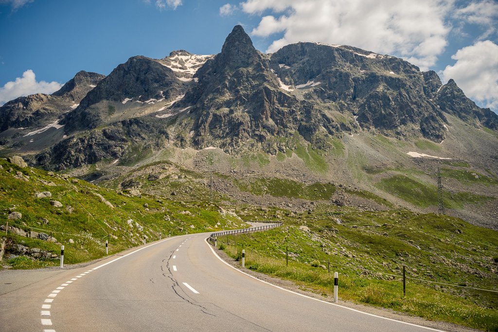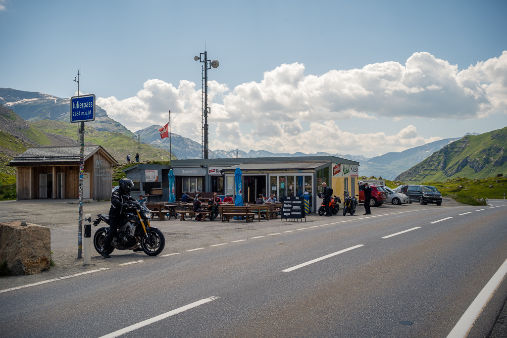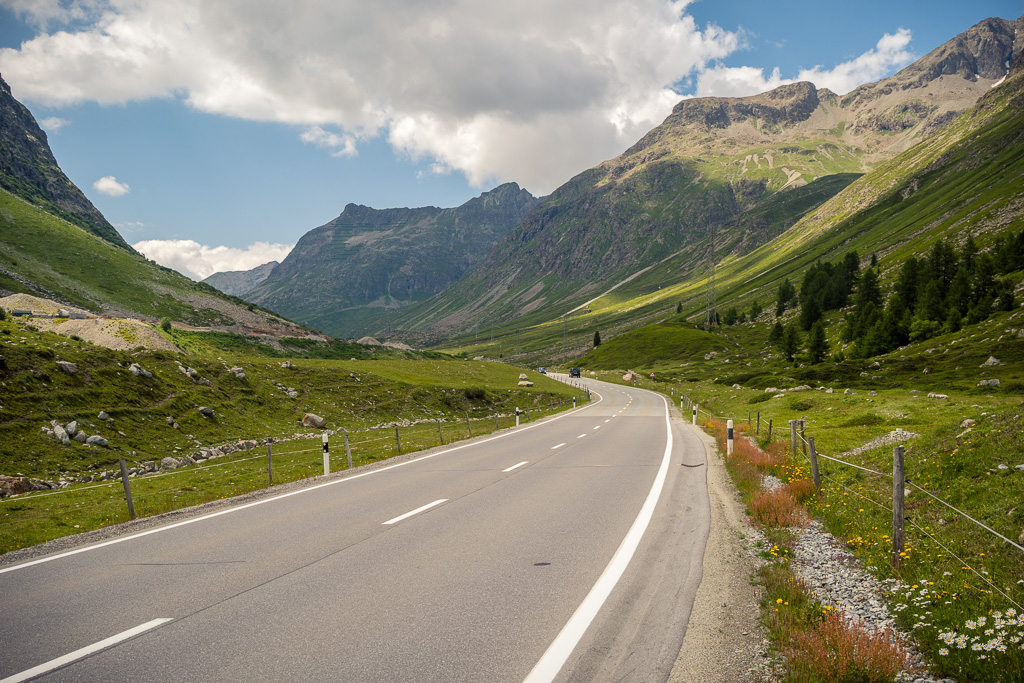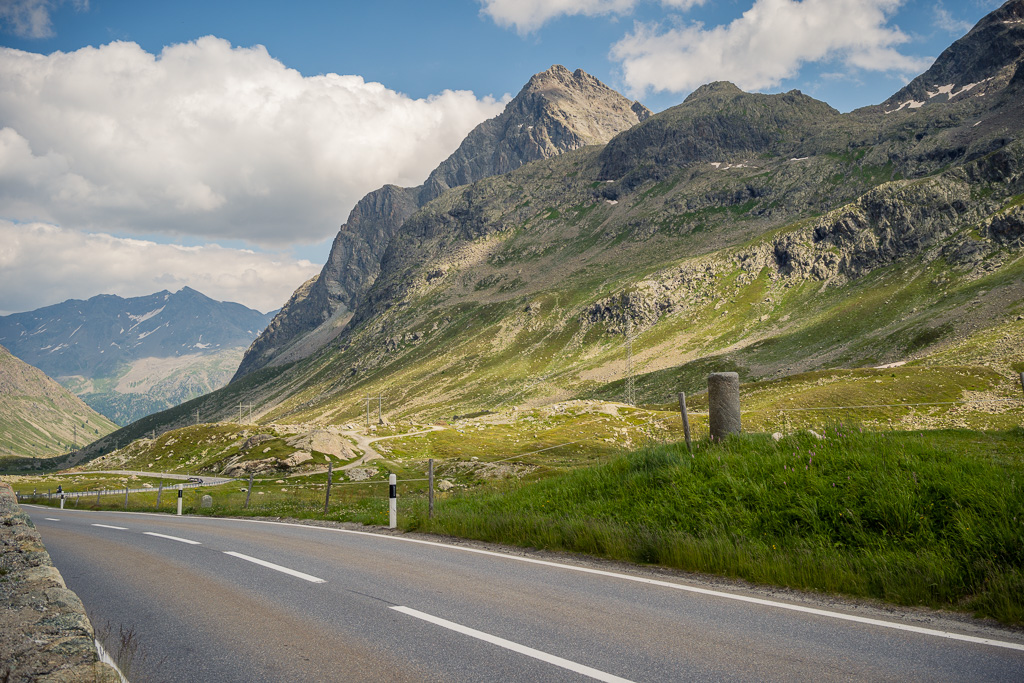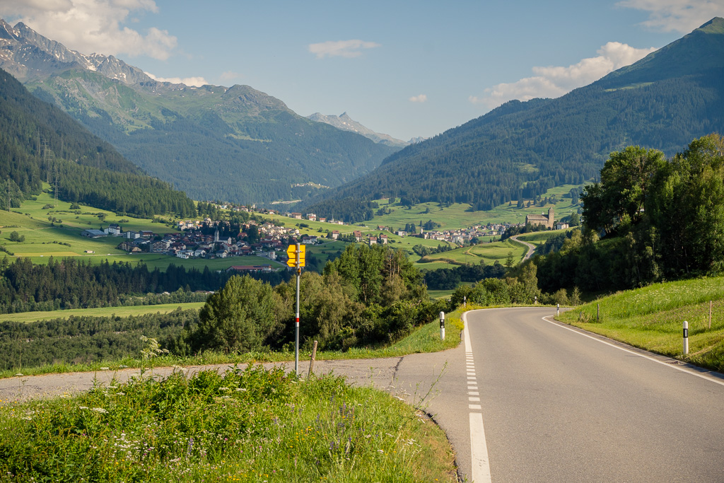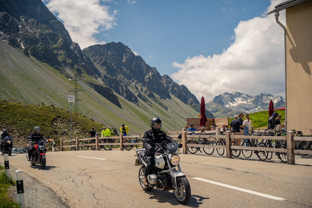 Von der Fahrt über den Albulapass gab es nichts Besonderes zu vermelden – ausser dass ich auf ein sonniges Wochenende mit sehr viel Verkehr auf zwei und auf vier Rädern traf. Wie üblich konnte ich mich beim Anblick der zahlreichen Rennradfahrer auf dem Weg zum Albulapass nicht zurückhalten, überholte dementsprechend ganze Gruppen von Radfahrern und hatte auf der Passhöhe wieder einmal mehr Energie verbraucht, als in Anbetracht der enormen verbleibenden Fahrstrecke ratsam gewesen wäre.