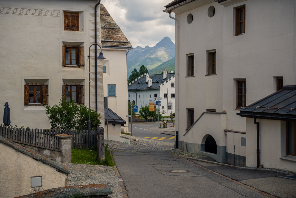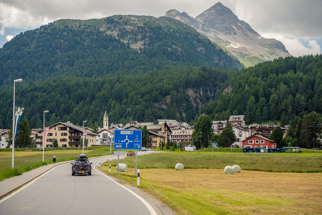 Hinter dem See bog ich dann auf einen Waldweg nach St. Moritz-Bad ab, kam dort kurz in Tuchfühlung mit den Wohnblöcken am Ortsrand und verschwand dann aber schon bald wieder im Wald in Richtung Silvaplana. Die Abfahrten beim letzten Mal auf diesem Teilstück verwandelten sich hier in einige kurze, knackige Anstiege, die mich im Hinblick auf den nahenden Julierpass wieder ein bisschen zuviel Kraft kosteten. In Silvaplana überquerte ich die Landbrücke über den See, fuhr in das Dorfzentrum hinauf und über einen für Autos gesperrten Abschnitt zur Einmündung in die Julierpassstrasse hinauf.