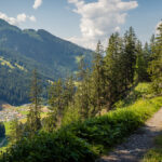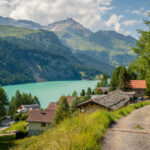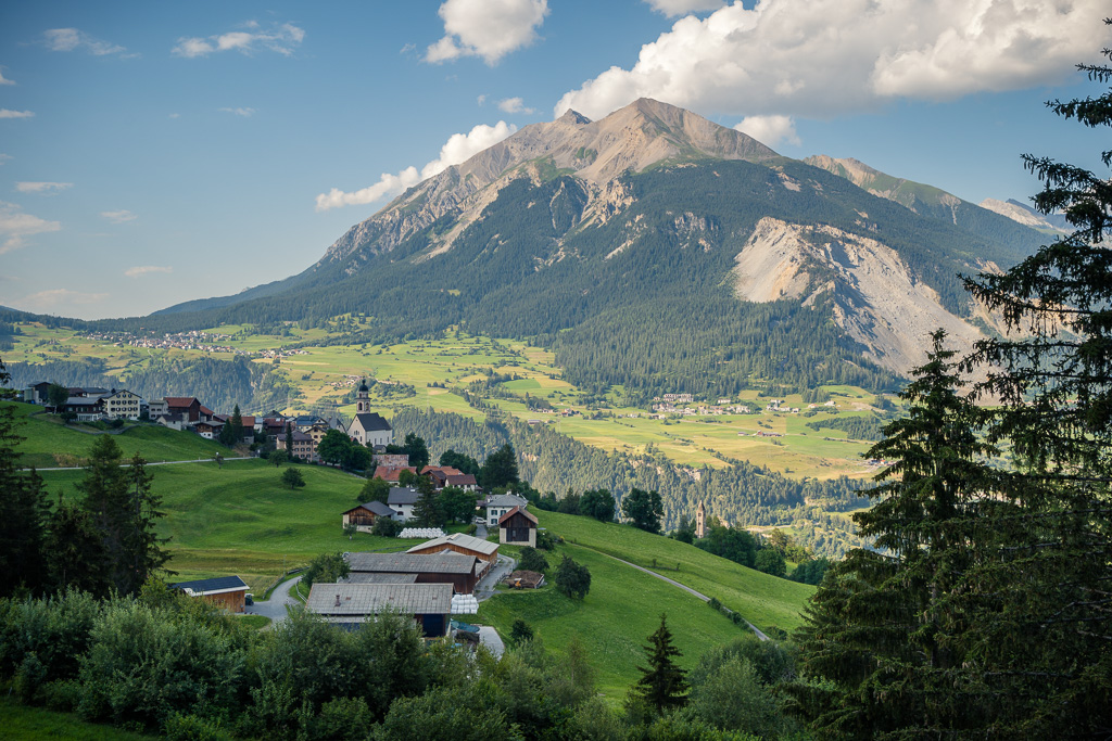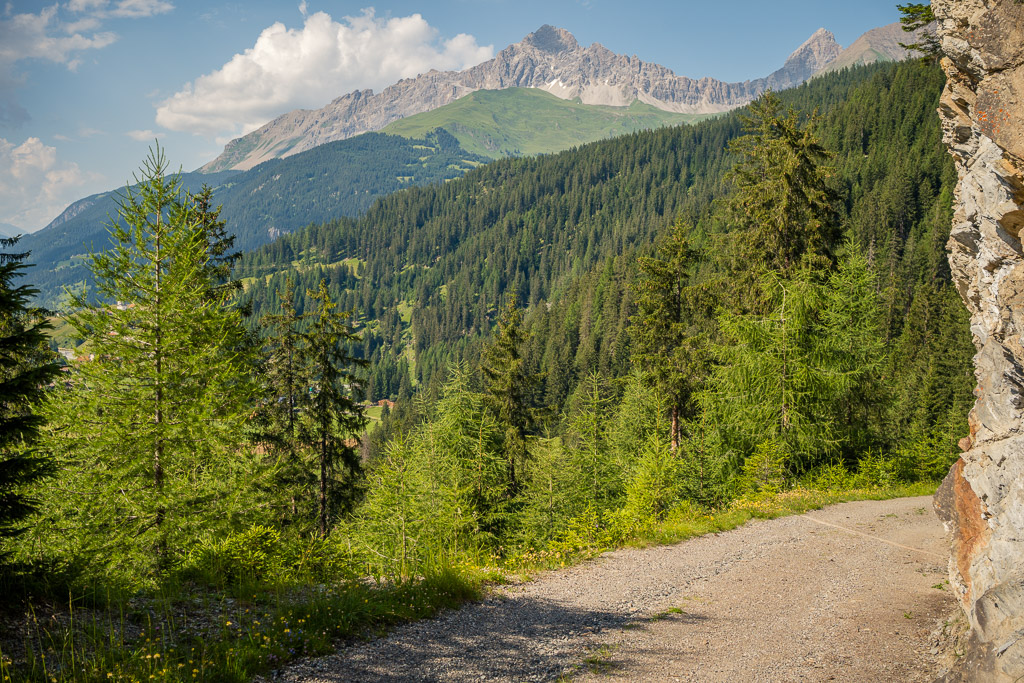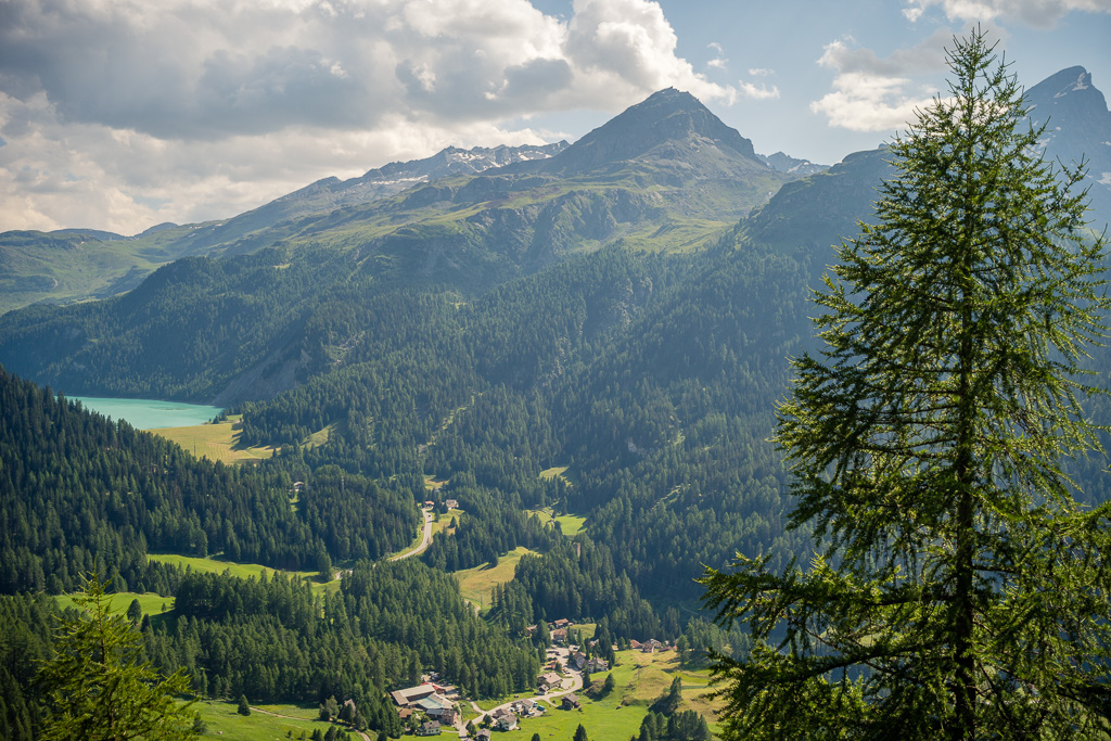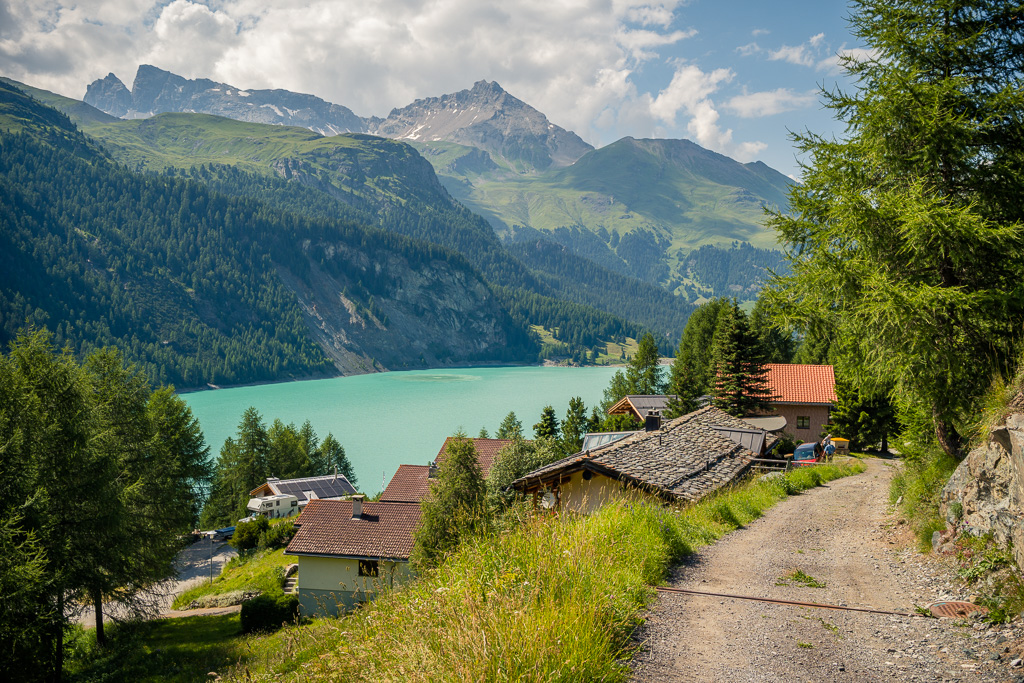 Abseits vom Verkehr wurde es auf einen Schlag still. Das erste Teilstück bis zum Marmorera-Stausee verlief in leichtem Auf und Ab unter schattenspendenden Bäumen. Beim Dorf Marmorera dann eine herrliche Aussicht über die Hausdächer auf den türkisblauen Stausee, die man natürlich beim Aufstieg in die Gegenrichtung so nicht hat. Beim Brunnen am kleinen Friedhof konnte ich Wasser nachfüllen. Danach ging es für eine kurze Strecke wieder auf der Durchgangsstrasse am Stausee entlang bis zu seinem Ende bei Scalotta, wo ich erneut abbiegen und abseits der Strasse durch den Wald hinunter bis nach Rona fahren konnte. Ganz so einfach liess sich dieser Teilabschnitt aber nicht bewältigen. Zum einen ging es zunächst bergauf bis zur Einmündung des Wegs in die Alpstrasse von Sur nach Alp Flix. Auf dieser musste ein halber Kilometer in der Sonne überwunden werden, bis ich die Fortsetzung vom Waldweg wieder erreichte. Auch die lange Abfahrt von Pale Radonda nach Rona hatte es in sich: der Weg war relativ grob und von zahlreichen holprigen Holzschwellen durchsetzt, sodass ich ständig Vorsicht walten lassen musste und am Ende ziemlich durchgeschüttelt und mit verkrampften Schultern und Handgelenken in Rona ankam. Ich konnte die erneute Nachfüllpause am Dorfbrunnen aber etwas zum Entspannen nutzen.