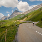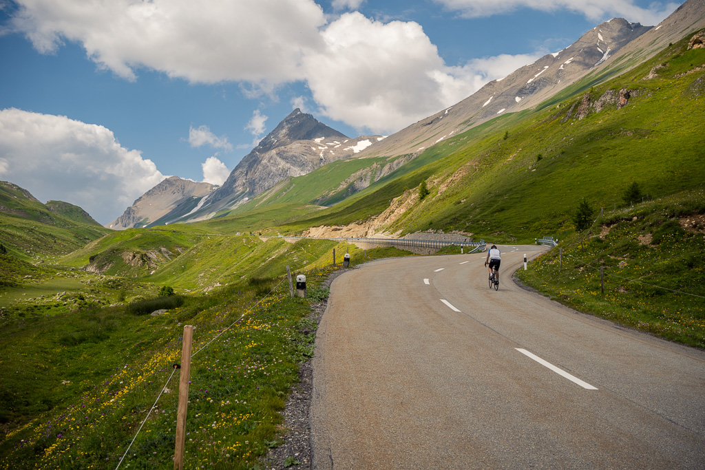Mit schon etwas müden Beinen nahm ich die Steigung zum Julierpass in Angriff. Der Aufstieg von Silvaplana zum Pass erschien glücklicherweise nicht ganz so anstrengend wie in der anderen Richtung von Bivio her. Nach den ersten Serpentinen folgten bis zur Passhöhe langgezogene, flache Abschnitte. Eine Radfahrerin bewegte sich als rosaroter Fixpunkt ständig etwa 500m vor mir und war unmöglich einzuholen, da meine Durchschnittsgeschwindigkeit im Vergleich zum Albulapass inzwischen ziemlich nachgelassen hatte. Bis zur Passhöhe konnte ich den Abstand noch auf 200m verkürzen, danach war sie verschwunden (ein Effekt, das ich auch vom Indoor-Radtraining her kenne: wenn man die Avatare nicht bis zum Ende der Steigung einholen kann, sind sie weg).