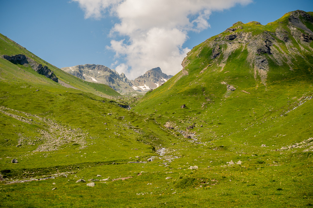 Der Verkehr über den Julierpass war noch dichter als auf dem Albulapass. Ich hatte die Tour eigentlich in der Überzeugung geplant, dass der Grossteil des Urlauberverkehrs sich heute von Bivio her zur Anreise ins Engadin bewegen würde. Wenn ich gewusst hätte, wie falsch ich mit dieser Annahme lag, hätte ich mir die Tour wahrscheinlich von Beginn weg für einen anderen Tag vorgenommen. Sehr schön allerdings die Ausblicke von unterwegs, besonders auf den Aufstieg zum Piz Julier, den unteren Teil meiner Skitour zum Piz Lagrev und das Val d’Agnel am Anfang der Tour zum Piz Surgonda und mit dem zu Fuss bestiegenen Piz d’Agnel am Horizont.