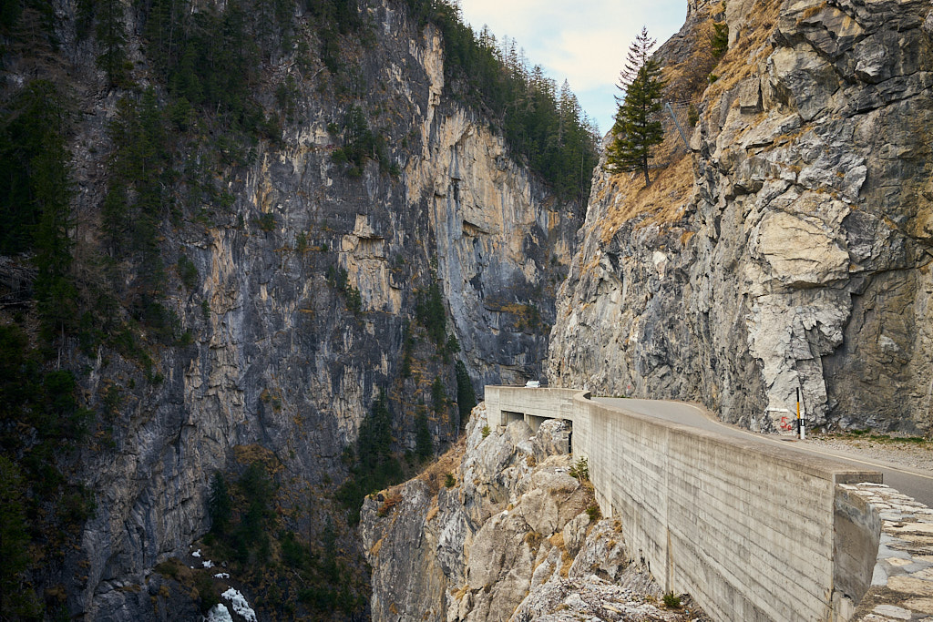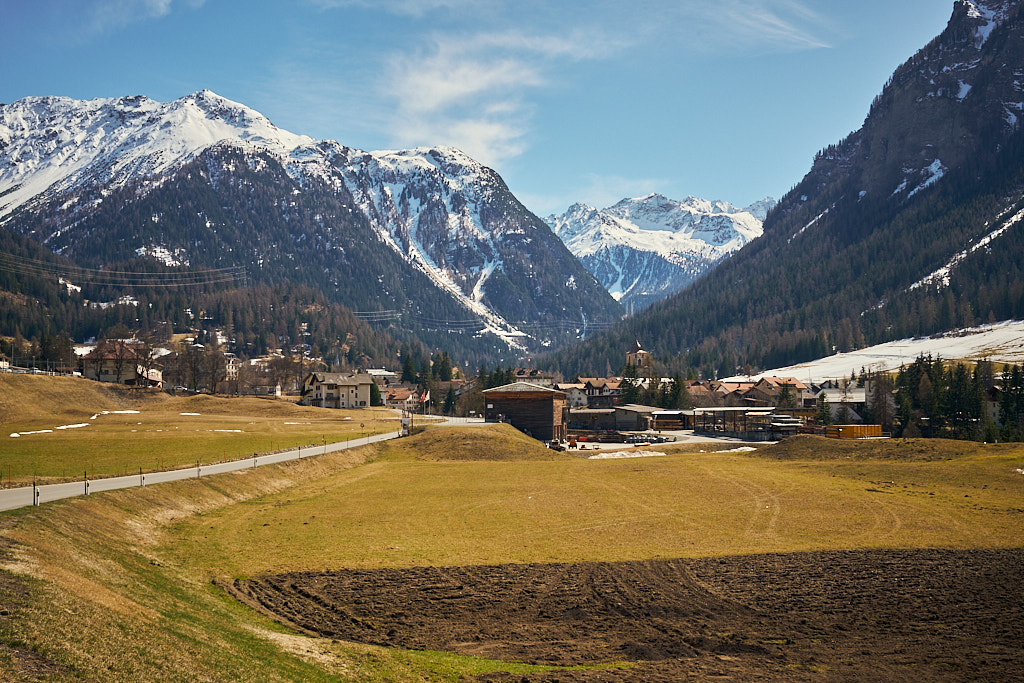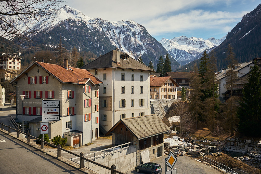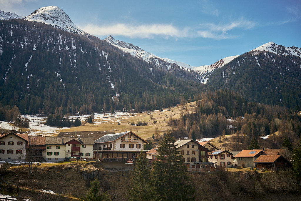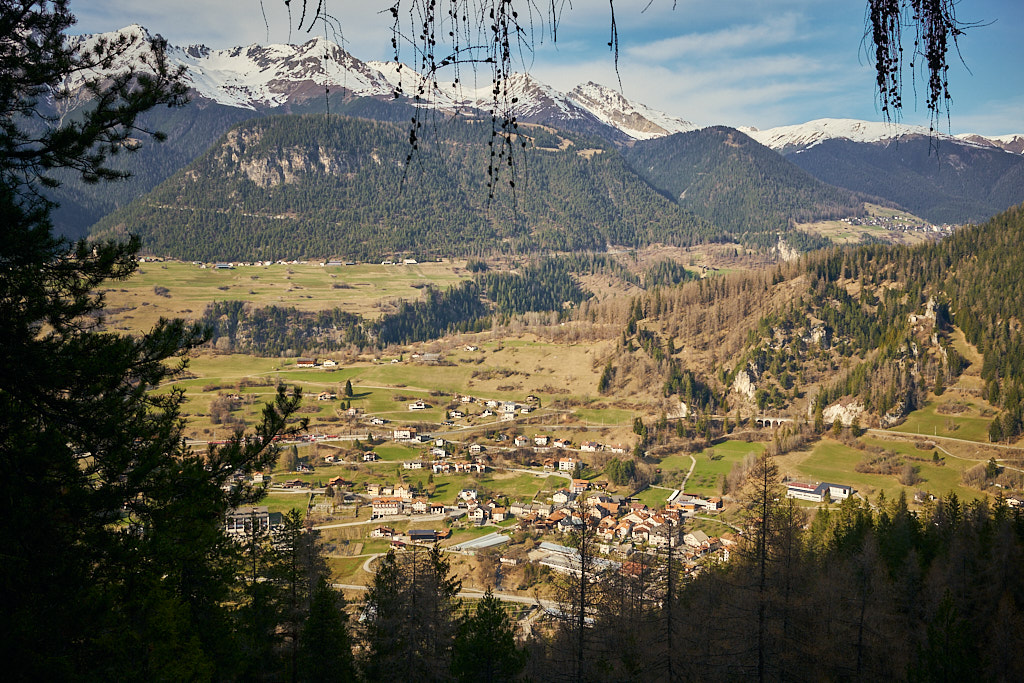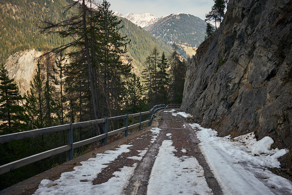 Von Bergün ging es wieder schnell und steil hinab in Richtung Filisur, wobei ich die Strasse bei Bellaluna verliess und zur südlich der Albula verlaufenden Forststrasse abbog. Dieser folgte ich bis zum Anfang der Alpstrasse nach Pradatsch und zur Ela-Hütte. Einem spontanen Impuls folgend, kurbelte ich rund 400 Höhenmeter hoch, bis ich beim Felsentor bei Sela auch hier wieder auf eine geschlossene Schneedecke auf der Strasse stiess. Nach der anschliessenden Abfahrt nach Filisur machte ich noch einen Abstecher zum Biohof Las Sorts, um meinen Rucksack mit Energienachschub in Form von Bergkäse und Eiern aufzufüllen. Derart beschwert, stand mir nur noch der Aufstieg aus dem Albulatal nach Alvaneu Dorf bevor. Mit etlichen Höhenmetern schon in den Beinen war diese Etappe zum Abschluss dann auch die anstrengendste des Tages.