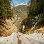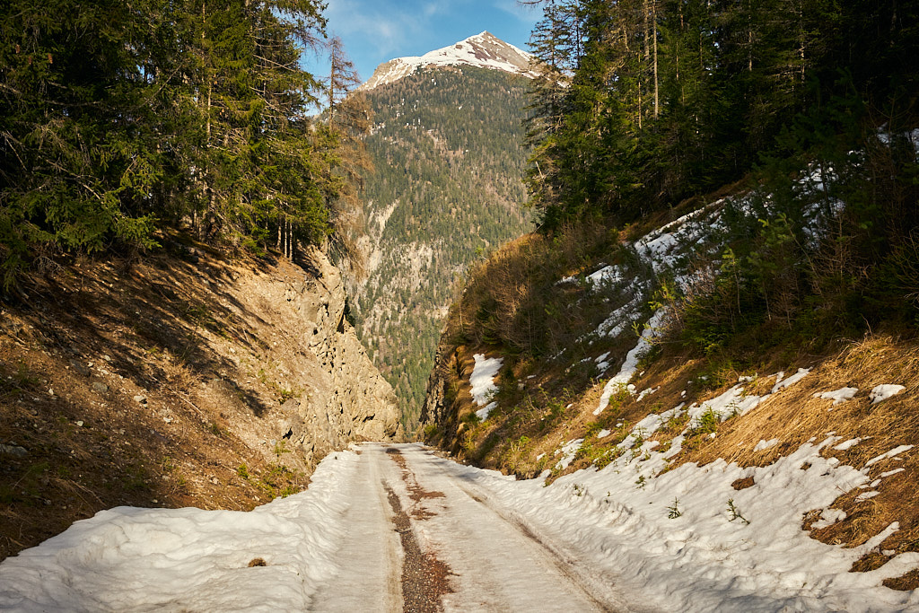 Auf dem Rückweg fuhr ich in Bergün beim Bahnhof hinauf nach Latsch. Von dort ging es auf der anderen Seite wieder hinunter bis zur Abzweigung der Strasse ins Val da Tuors. Weit kam ich in diesem Seitental allerdings nicht, denn nach einigen Hundert Metern versperrte eine Schneedecke auf der Strasse auch hier die Weiterfahrt. Also kehrte ich um und fuhr weiter nach Bergün zurück.