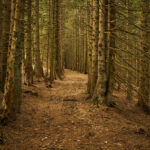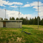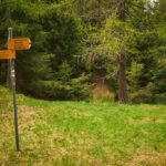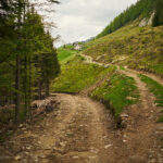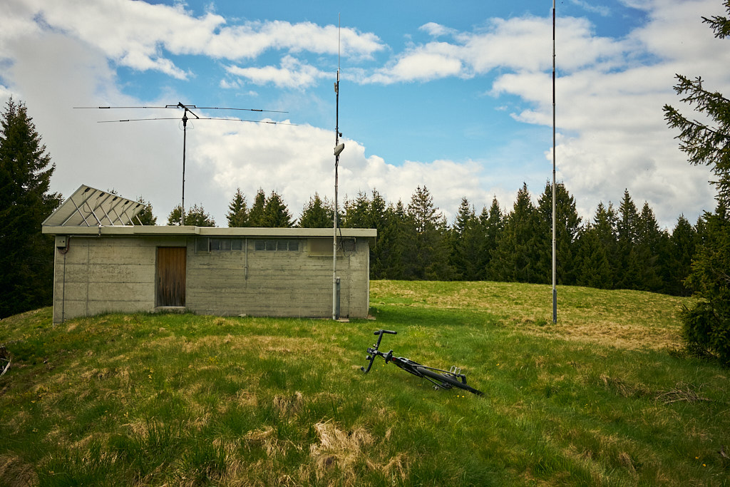 Der Weg wurde nun zu einem blockigen Karrenweg zwischen dichten Bäumen, der mit dem Gravelbike schwierig zu befahren war. Auf einer Lichtung mit einem Wegweiser fand ich eine unscheinbare Markierung, die die letzten hundert Meter zum Motto d’Arbino wies. Am Gipfel erwartete mich jedoch eine Enttäuschung: Statt der erhofften weiten Aussicht fand ich nur eine Graslichtung, umgeben von dichtem Wald, der jeden Blick versperrte, sowie ein unschönes Betongebäude mit Funkmast. So kehrte ich also ohne neue Erkenntnisse auf demselben mühsamen Weg wieder in Richtung Alpe della Costa zurück.