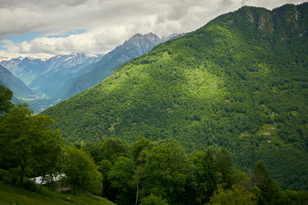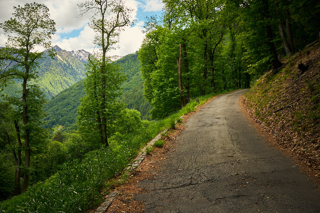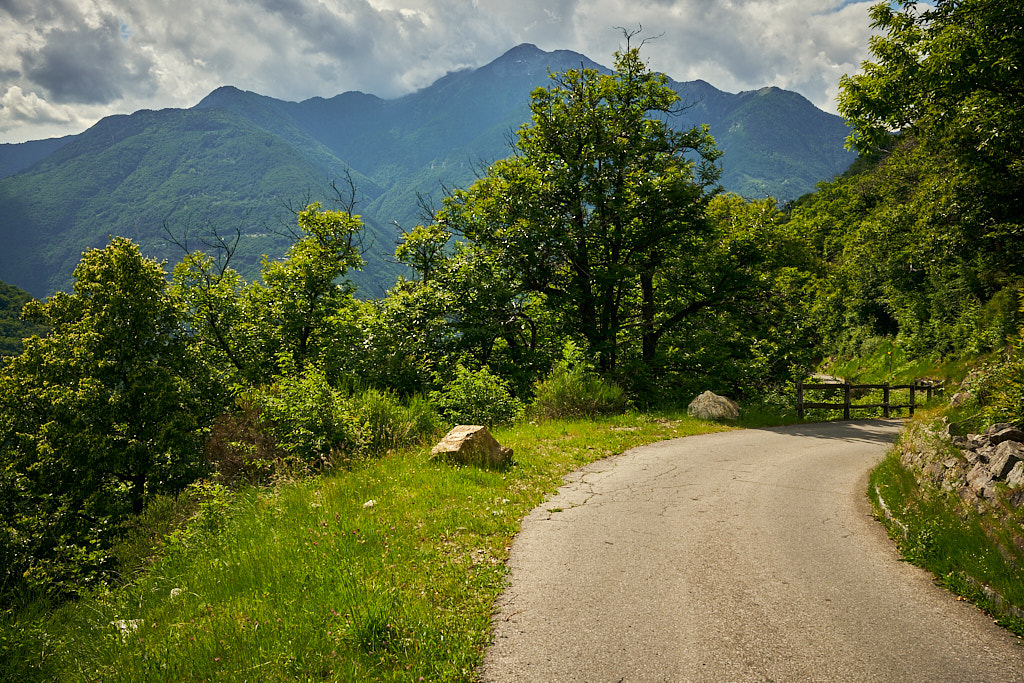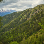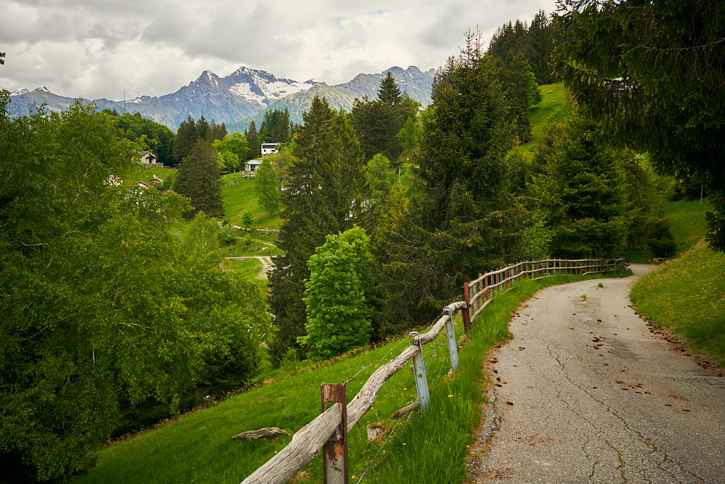 Die Tour begann in Grono auf dem Radweg, der auf einer ehemaligen Bahnlinie nach Roveredo führt. Von dort ging es durch Roveredo zum Waldrand, wo eine schmale Bergstrasse nach Laura beginnt. Diese Strasse war wegen Bauarbeiten gesperrt, doch dank der Mittagspause konnte ich unauffällig passieren. Der Aufstieg nach Laura über die ersten 1.000 Höhenmeter verlief auf einer ruhigen Waldstrasse mit gelegentlichen Blicken ins Tal und auf die bewaldeten Hänge des Val Traversagna, wo vereinzelte Hütten verstreut liegen.