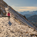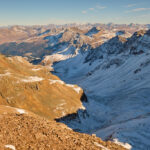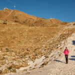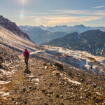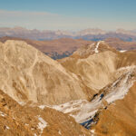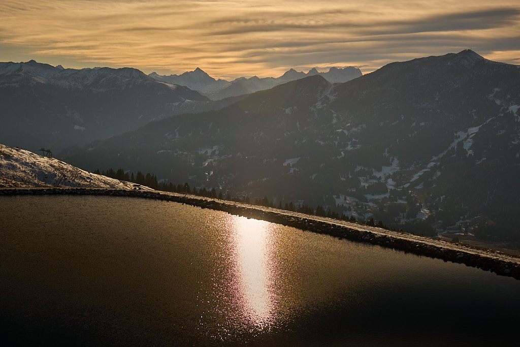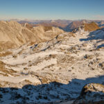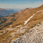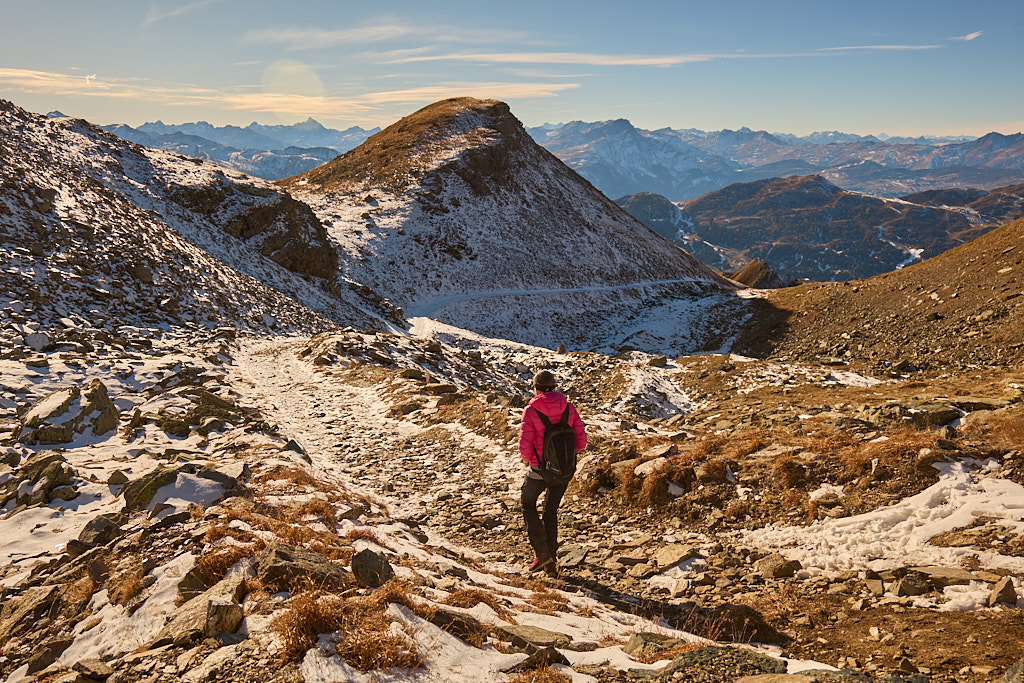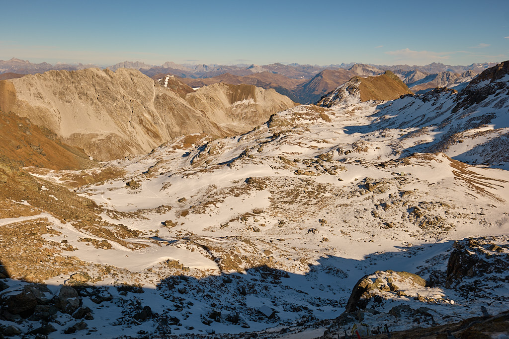 Aufgrund der Schnee- und Sonnenlage beschlossen wir, auf der noch sonnigen Westflanke des Rothorns zur Mittelstation bei der Alp Scharmoin zu wandern. Der breite Geröllweg (im Sommer eine Bikeroute) führte vom Gipfel zunächst abwärts zu einer Wegkreuzung bei P.2630, wo der Wanderweg zur Alp Sanaspans (inzwischen im Schatten gelegen) nach links abzweigt. Wir gingen nach rechts weiter in Richtung Scharmoin, überquerten den Gratrücken von Foil Cotschen und stiegen in weiten Kurven zum Speichersee und an den Hütten der Alp Scharmoin vorbei weiter zur Mittelstation ab.