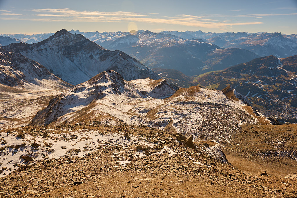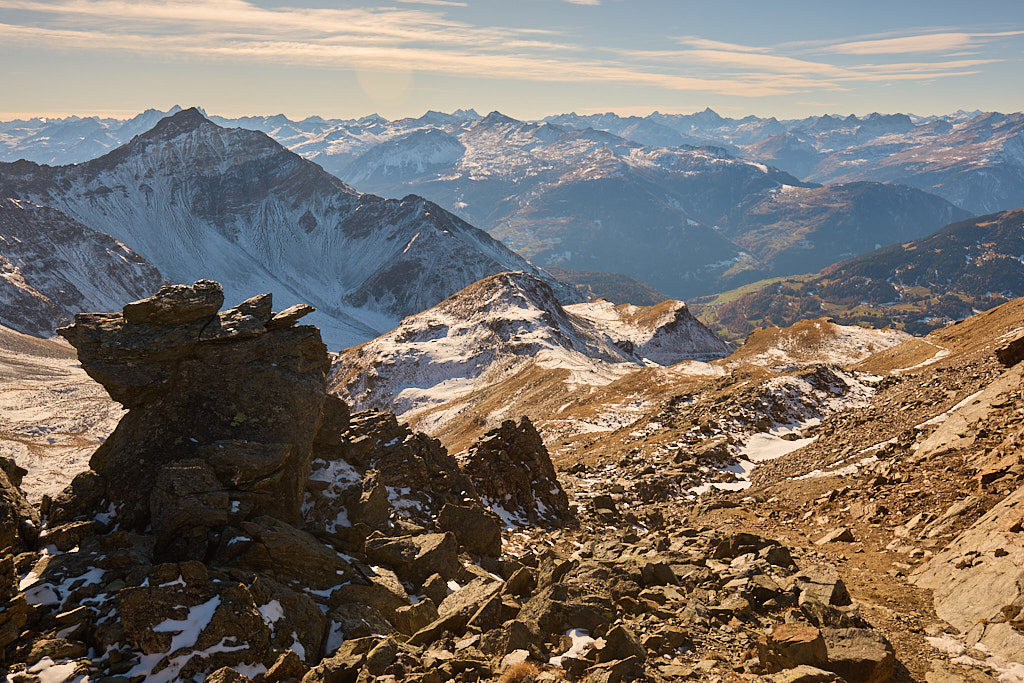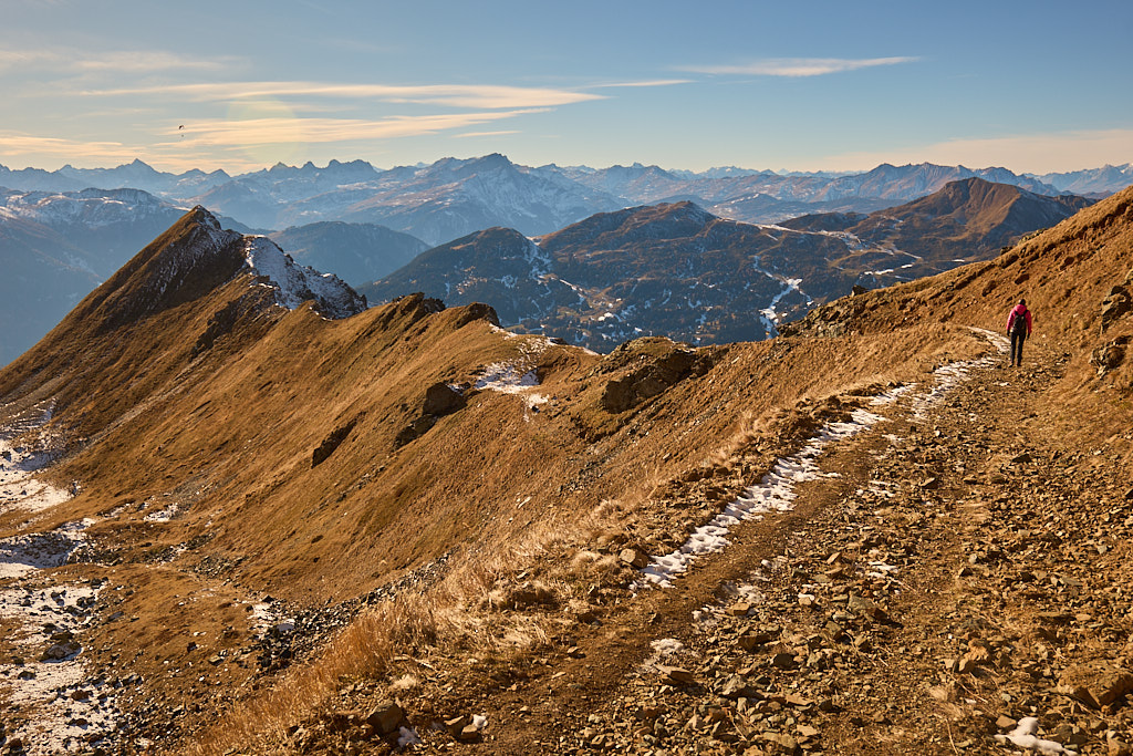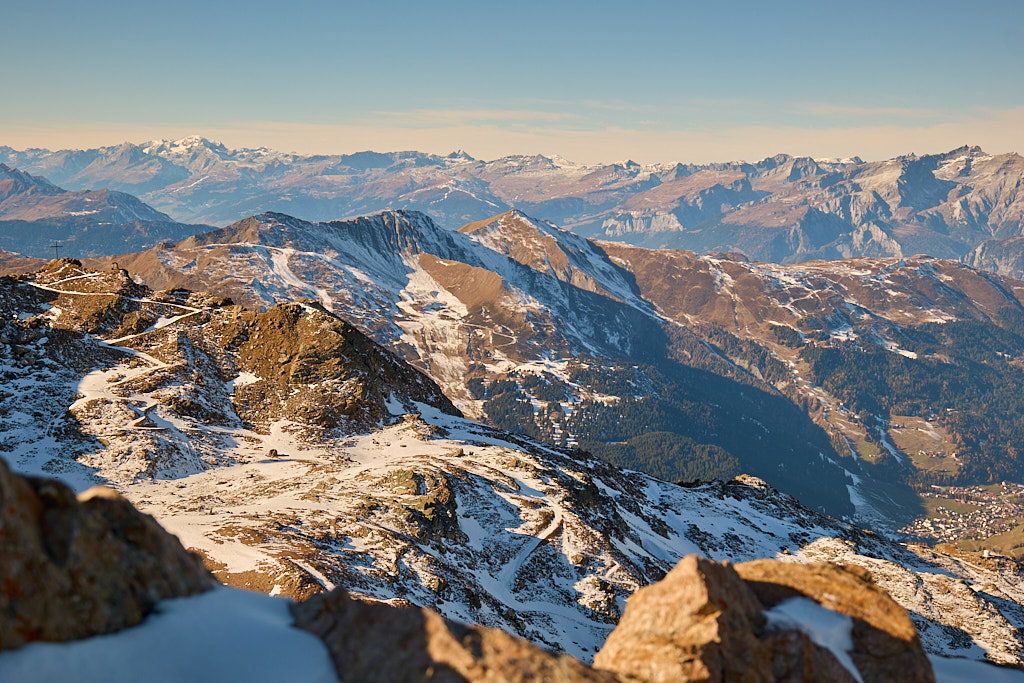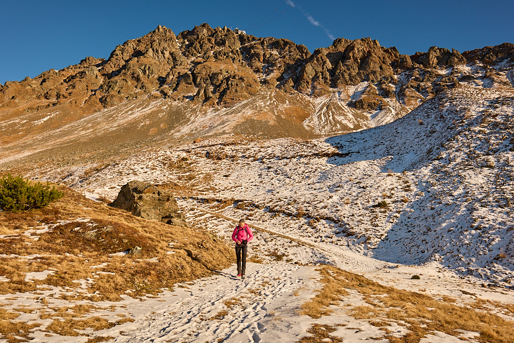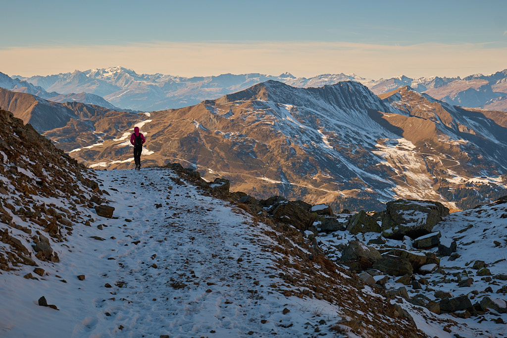 An diesem Wochenende war die Rothornbahn in der Lenzerheide für Fussgänger in Betrieb. Wir nahmen dies zum Anlass, einen Sonntagsspaziergang vom Rothorngipfel aus zu unternehmen. Nach der Bergfahrt zum Gipfel wanderten wir zunächst das kurze Stück hinüber zum Ostgipfel des Rothorns, um uns von dort einen Überblick zu verschaffen.