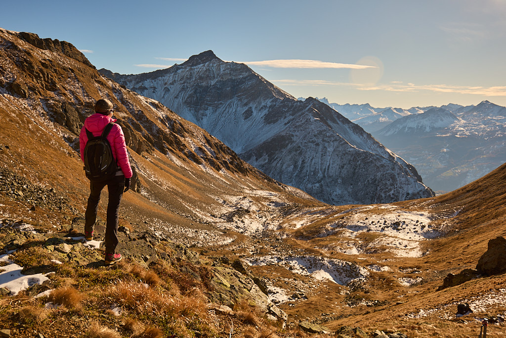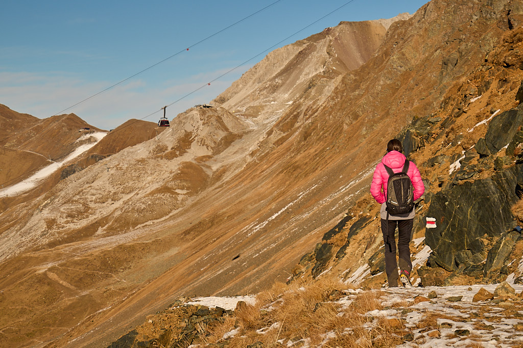 Der Weg war im oberen Teil über weite Strecken mit wenigen Zentimetern Neuschnee schneebedeckt, aber griffig und gut zu begehen. Aufpassen mussten wir eher im unteren Teil, wo unser Weg die Piste vom Urdenfürggli kreuzte, die schon künstlich beschneit wurde. Der Kunstschnee auf dem Weg dort war hart und an einigen Stellen glatt gefroren.