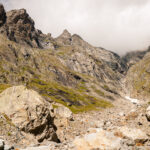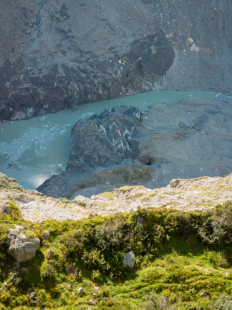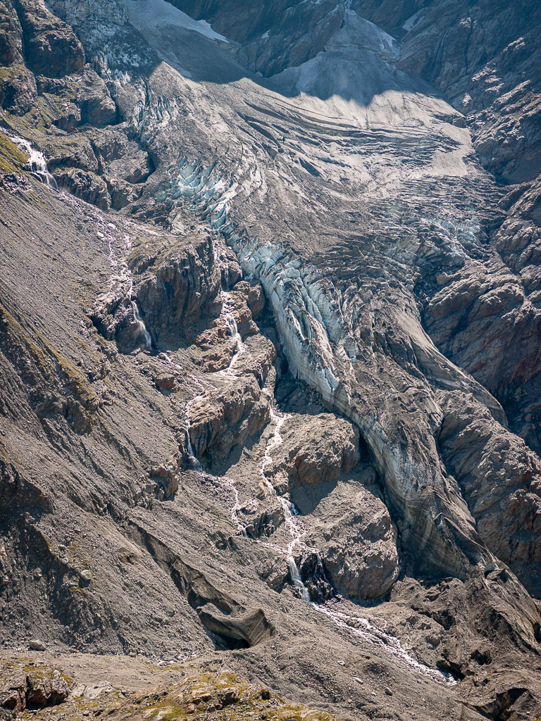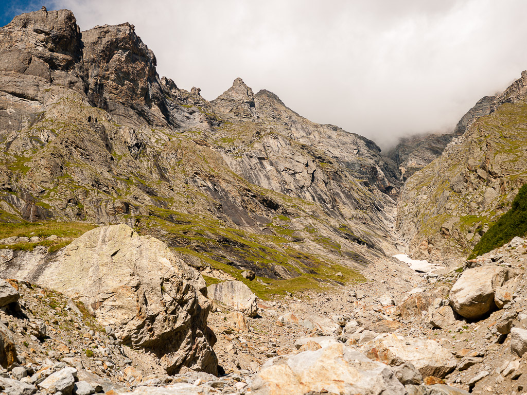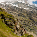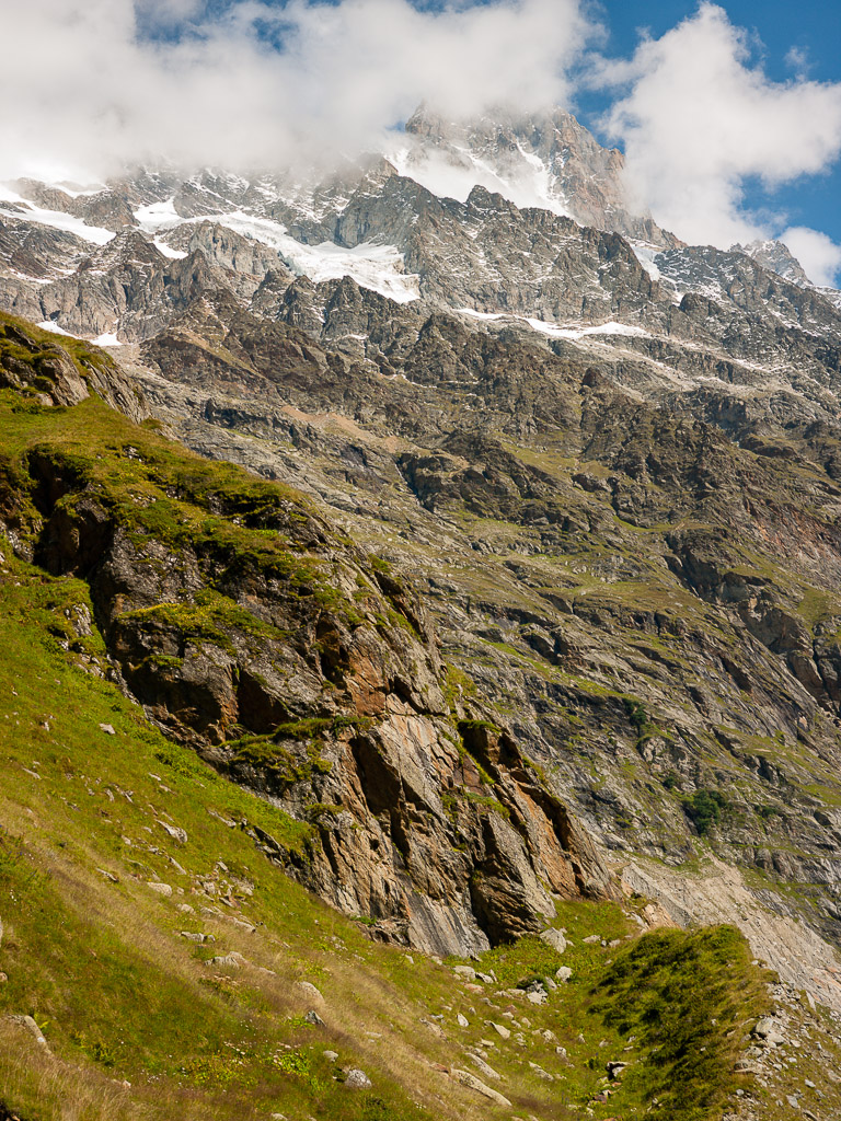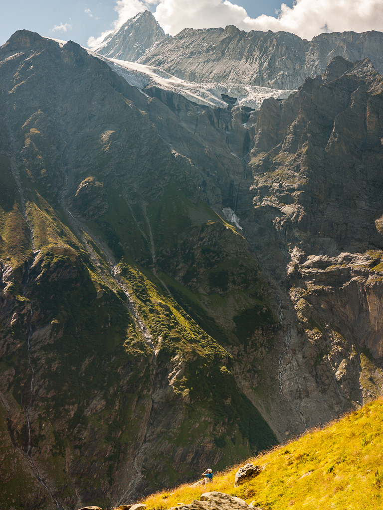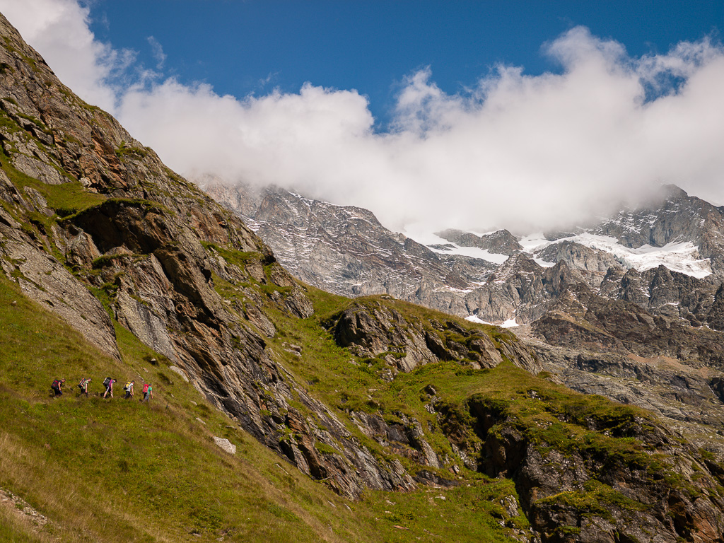 Der Wanderweg führt nun weiter dem Hang entlang über den Gletscherabbrüchen des Ischmeer bis zur Schreckhornhütte SAC, wobei eine Stelle („Rot Gufer“) etwas anspruchsvoller zu begehen ist (Drahtseilsicherungen und Eisenstifte). Unsere Tour ging jedoch nur bis Bänisegg, wo sich zahlreiche große Felsblöcke optimal als Sitzplatz zum Sonnenbaden und zum Genießen der Aussicht anboten.