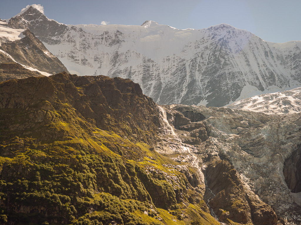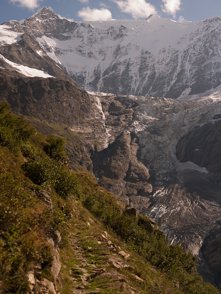 Der aktuelle Weg überquert das erodierte Gelände und eine große Schuttrinne etwas höher. Danach gelangt man absteigend, eine Weile flach und zum Schluss etwas ansteigend zur Geländekante von Bänisegg. Von hier aus bietet sich eine umfassende Aussicht auf die verschiedenen Gletscher und Eisabstürze von Ischmeer, Fiescherwand und den Überresten des Unteren Grindelwaldgletschers. In der Tiefe erkennt man einen durch die Felsmassen des Bergsturzes aufgestauten Gletschersee, dessen kontrollierter Abfluss durch eine aufwendige Tunnelbohrung sichergestellt werden musste, um Sturzfluten und Überschwemmungen von Grindelwald zu verhindern. Auf den Grashängen von Zäsenberg und Challi erkennt man mit etwas Glück einige verfallene Wegspuren; von hier aus war früher der Zustieg über die Gletscherhänge zur hoch oben gelegenen Berglihütte SAC und den Oberen Eismeer beim Eiger möglich.