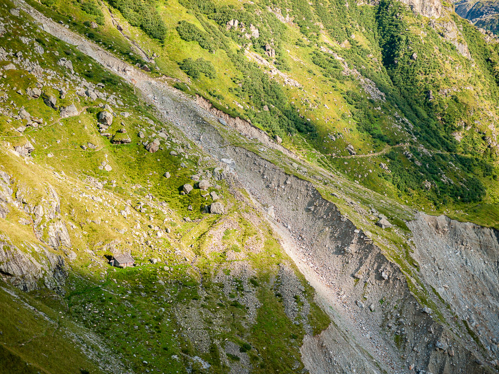 Vor dem Gasthaus Bäregg (bewirtschaftet) steigt der Weg in Kehren steil an. Der Weg verlief hier früher flach dem Hang entlang, bis ein gewaltiger Bergsturz im Jahr 2006 den Hang in die Tiefe riss. Beim Weiterweg vom Gasthaus um eine Geländekante herum sieht man gut die Überreste der alten Bäregghütte weiter unten, sowie Spuren des alten Hüttenwegs.