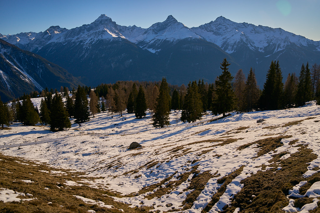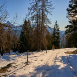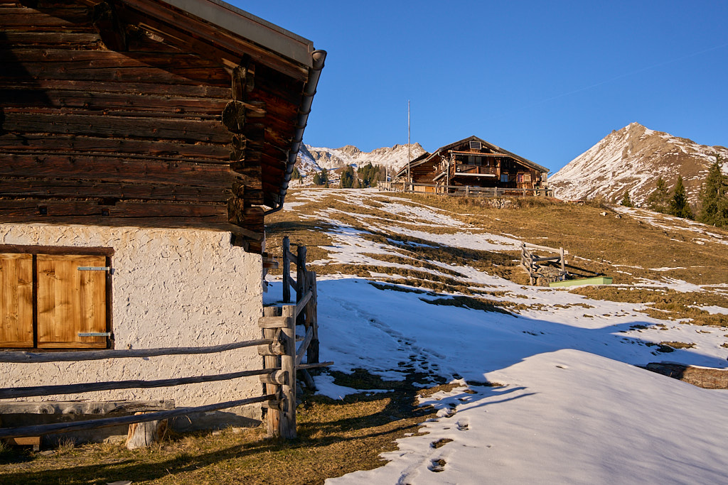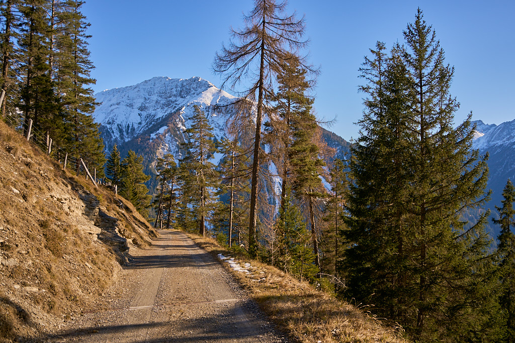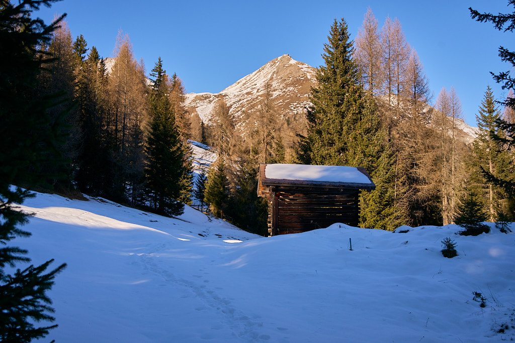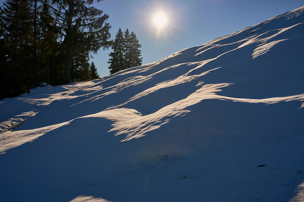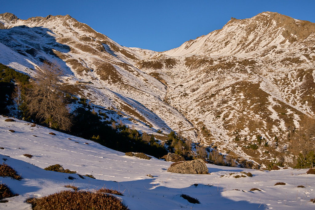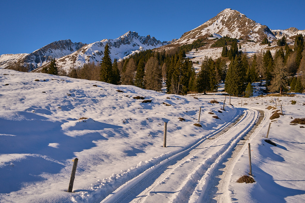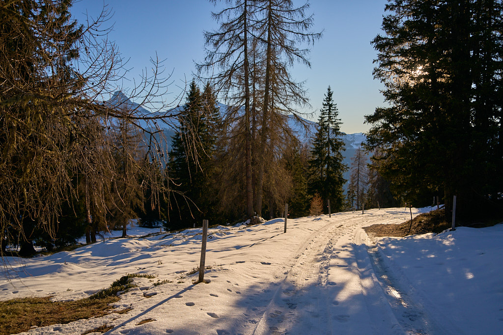 Die Steigung ab Grünwald war völlig schneebedeckt, sodass ich stattdessen nach Pardela weiterfuhr, das Bike an der Abzweigung beim Schriberskopf zurückliess und zu Fuss zur Schmittner Alp aufstieg. Ich lief dann noch weiter bis zu den Weiden über der Alp Afiein, von wo aus ich die Schneelage in Richtung Sandhubel und Tiaun begutachtete. Danach kehrte ich zum Bike zurück und fuhr über den schnee- und eisfreien alten Pardelaweg ab.
