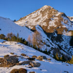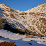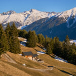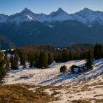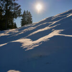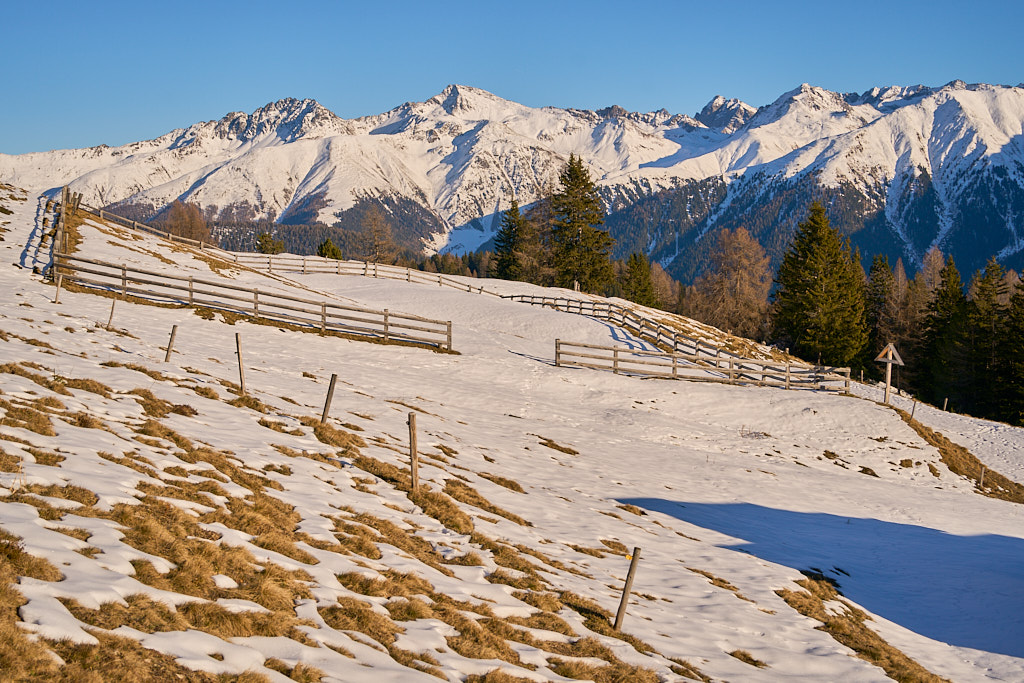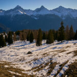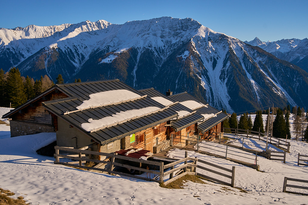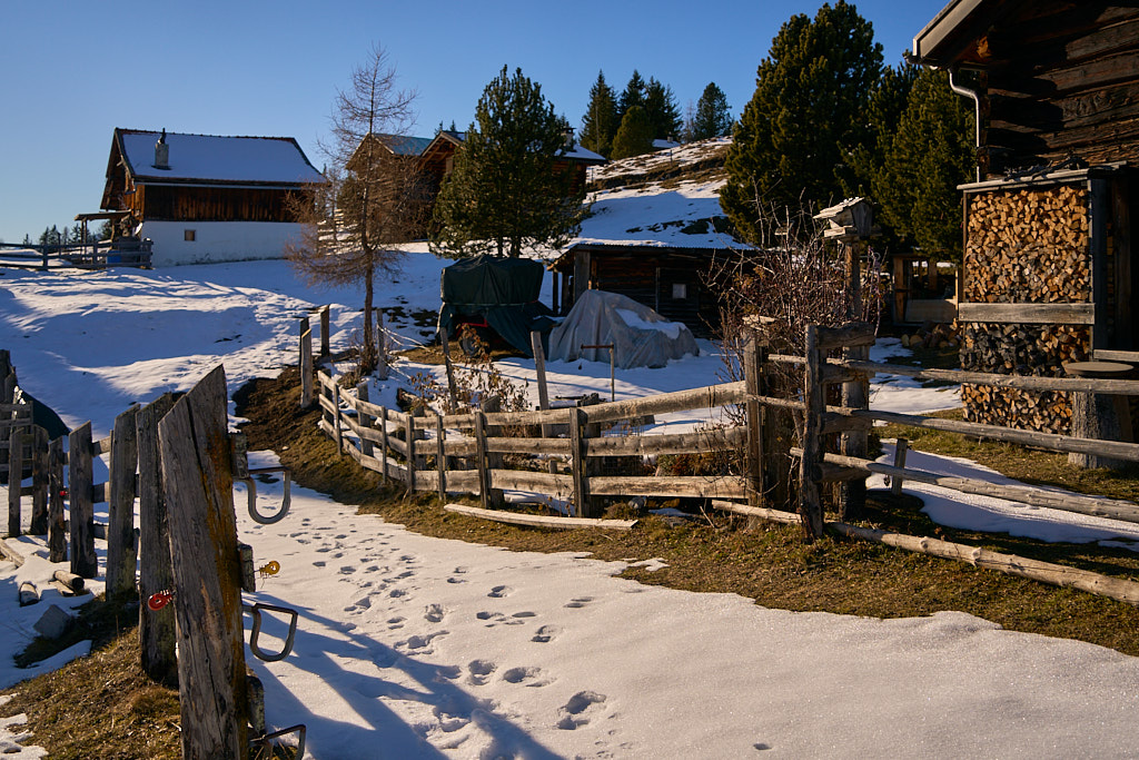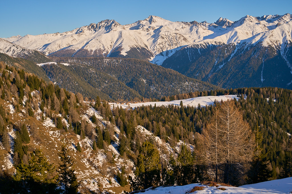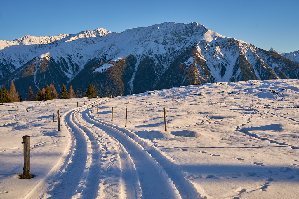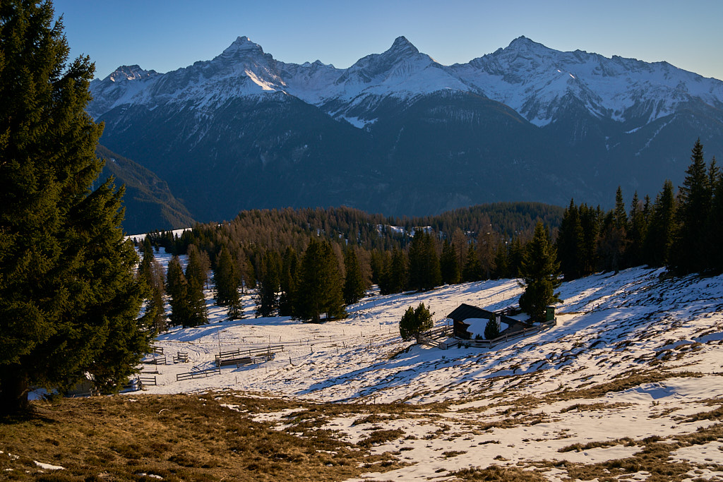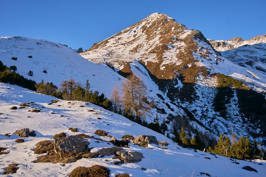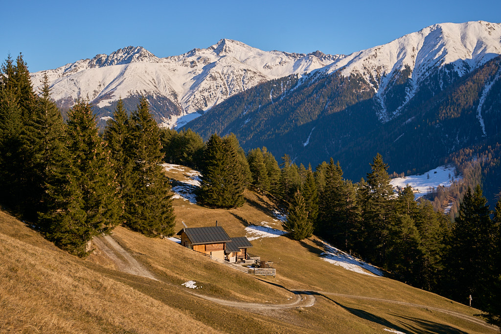 Die Steigung ab Grünwald war völlig schneebedeckt, sodass ich stattdessen nach Pardela weiterfuhr, das Bike an der Abzweigung beim Schriberskopf zurückliess und zu Fuss zur Schmittner Alp aufstieg. Ich lief dann noch weiter bis zu den Weiden über der Alp Afiein, von wo aus ich die Schneelage in Richtung Sandhubel und Tiaun begutachtete. Danach kehrte ich zum Bike zurück und fuhr über den schnee- und eisfreien alten Pardelaweg ab.