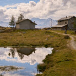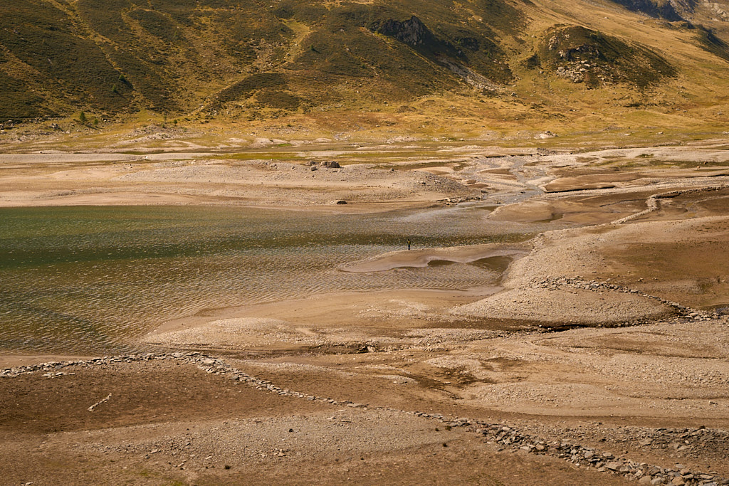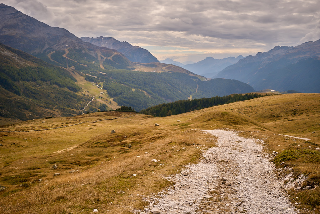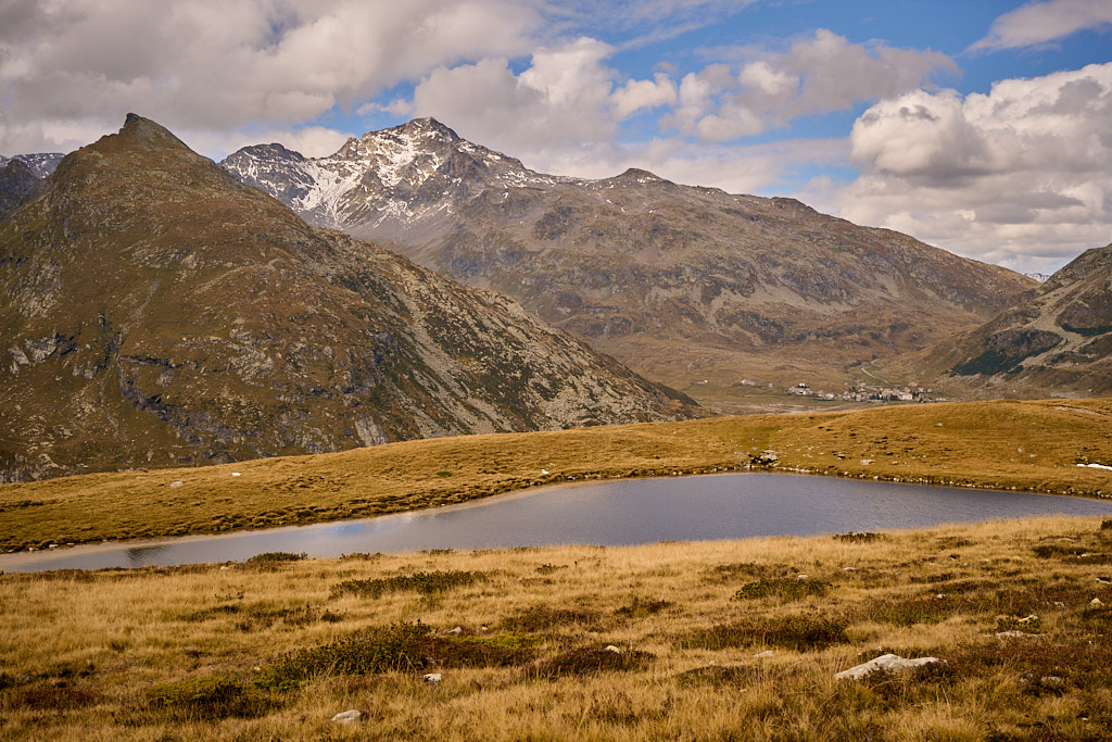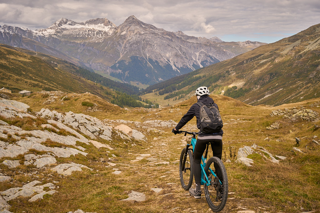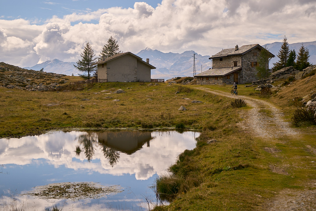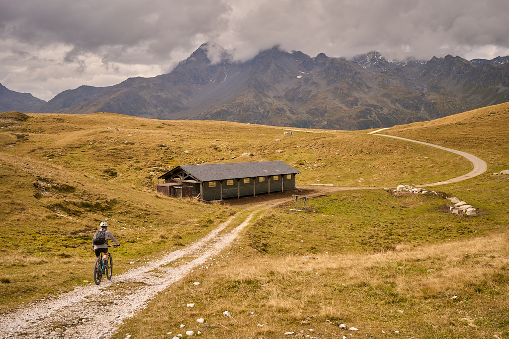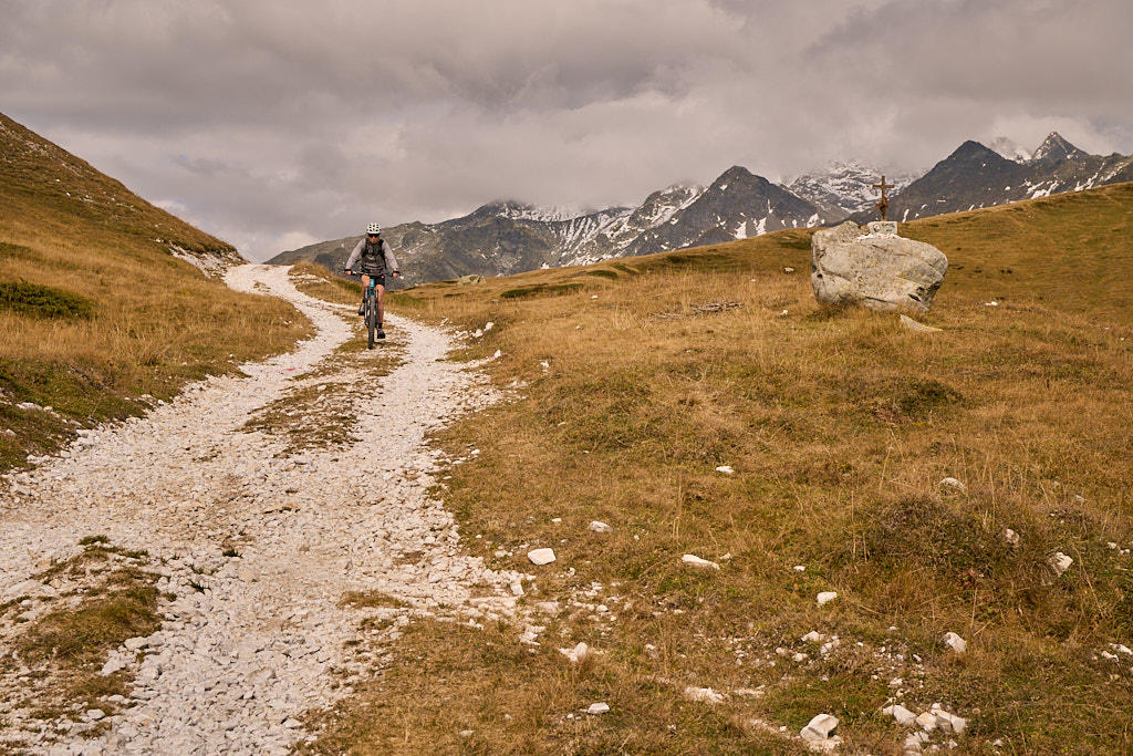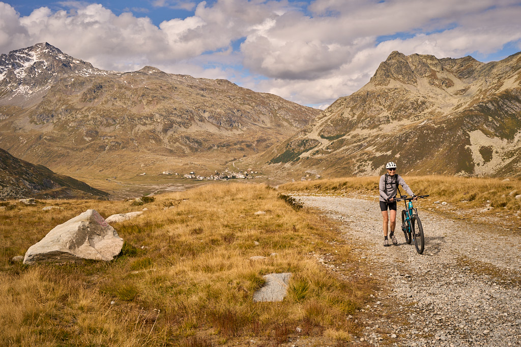 Auf der Anhöhe angekommen, genossen wir weitab der Passstrasse in einsamer Landschaft einen herrlichen Rundblick auf die Berge rund um Montespluga. Wir holperten nach Süden weiter zum kleinen See Laghi degli Andossi und von dort hinunter nach Stuetta, einem kleinen Weiler südlich der Staumauer vom Lago di Montespluga. Inzwischen waren dunkle Wolken aufgezogen, sonst hätten wir uns vielleicht noch zur weiteren Abfahrt nach Andossi und über Madesimo nach Pianazzo durchringen können, was allerdings mit einem beträchtlichen Aufstieg zurück zur Staumauer und zur Passhöhe verbunden gewesen wäre. Jedenfalls gibt es hier in der Gegend südlich vom Splügenpass noch ein weites Netz von Mountainbike-Trails zu entdecken.