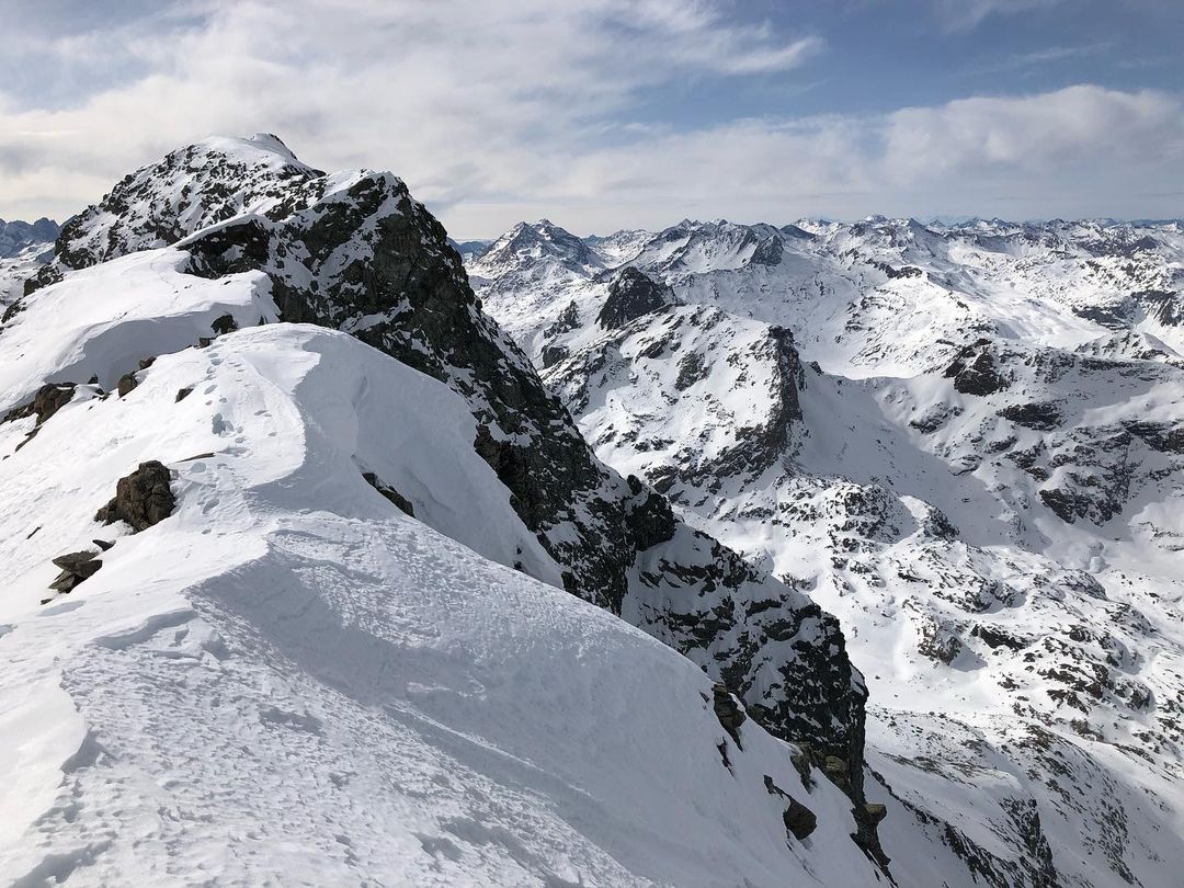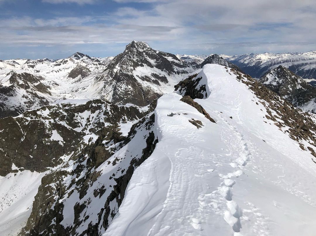 Von der Alp Güglia an der Julierpassstrasse zum Piz Lagrev. Ungünstige Schneeverhältnisse, einige sehr steile Hangabschnitte und Couloirs, aber trotzdem ein faszinierendes und spannendes Erlebnis.
