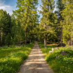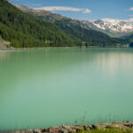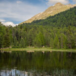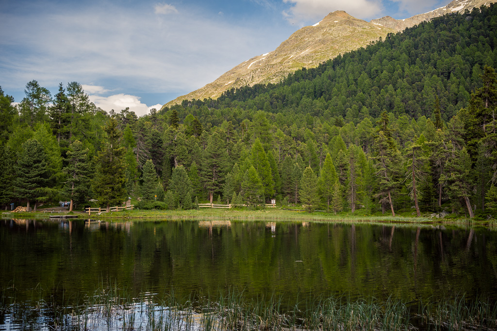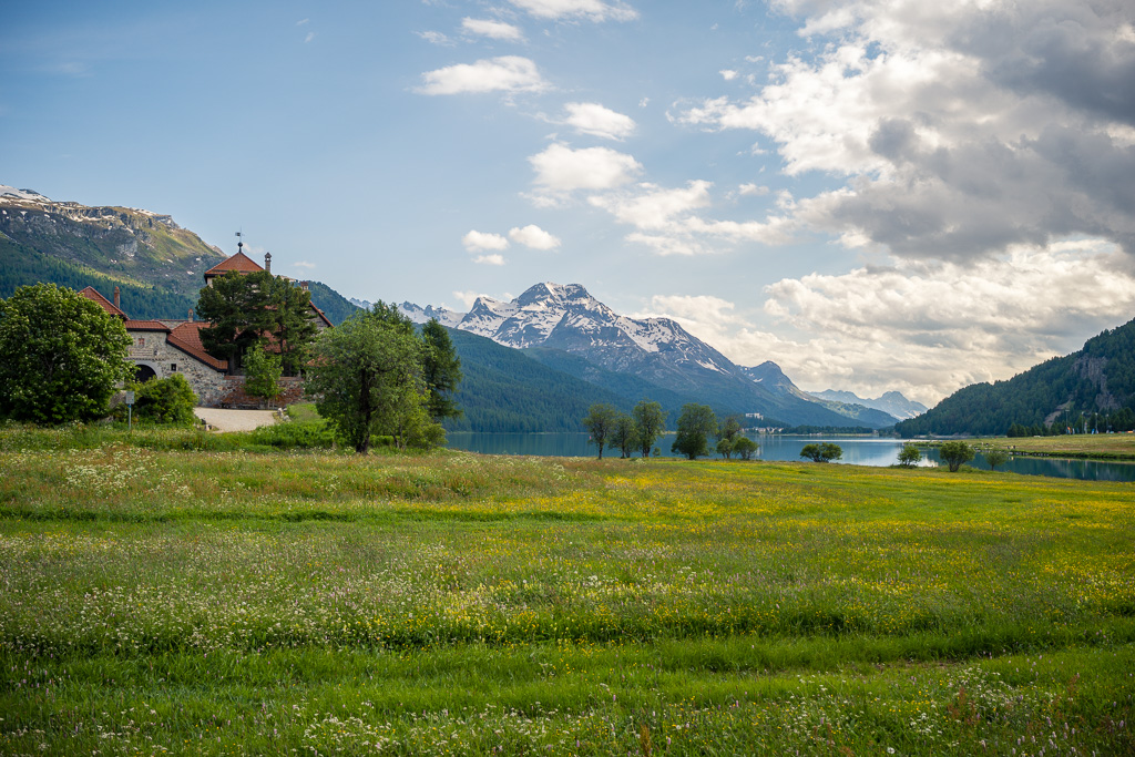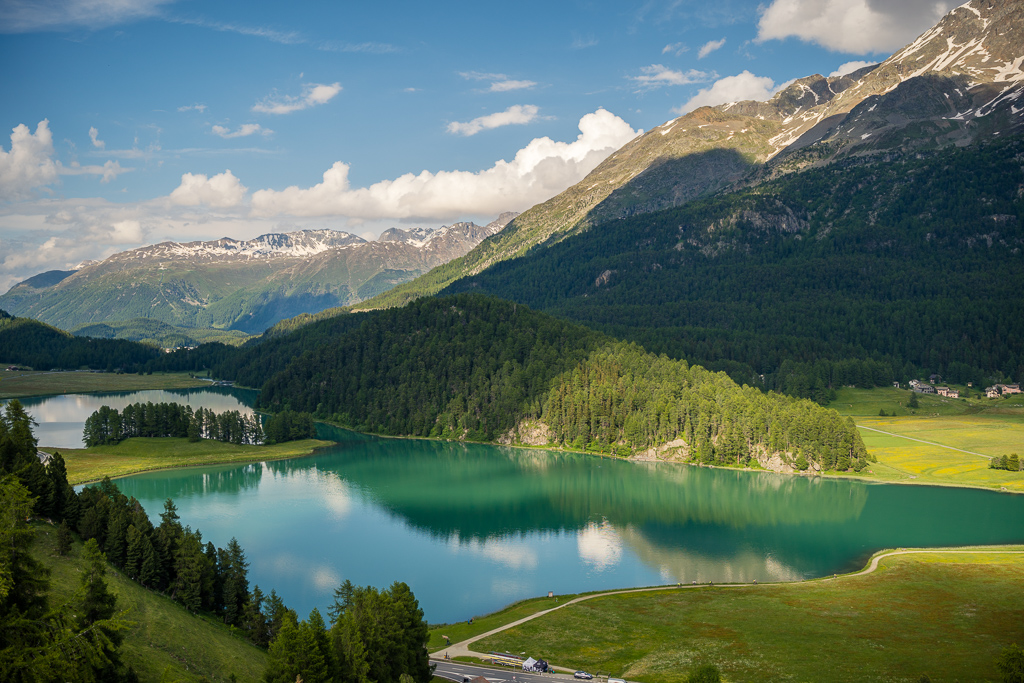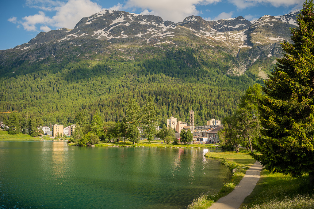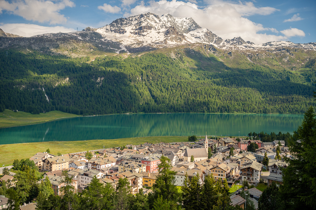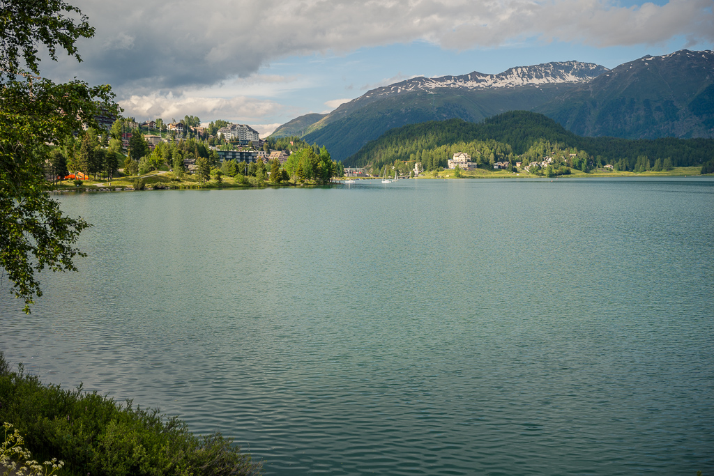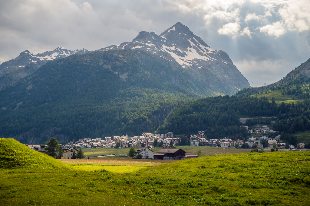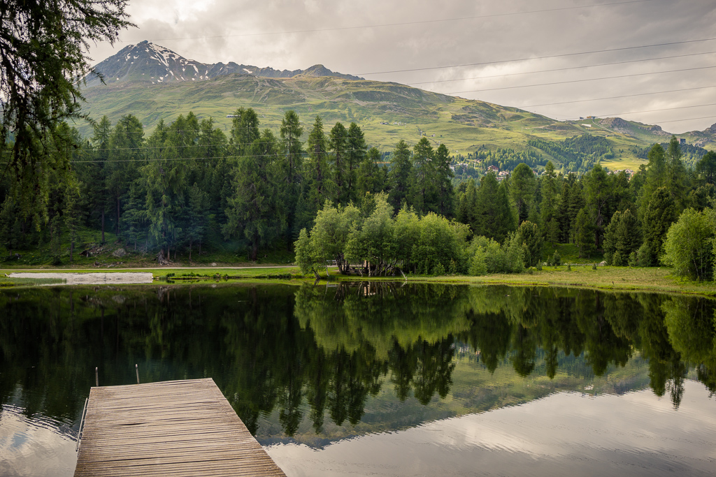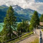 Die Abfahrt vom Julierpass nach Silvaplana war ein Genuss. In langen Geraden und weiten Kurven mit nicht allzuviel Bremsbedarf fuhr ich in der Abendsonne ins Engadin, einen herrlichen Blick auf Silvaplana, den Silvaplanersee und den Lej da Champfèr vor Augen. Vor Silvaplana bog ein Radweg ins Ortszentrum ab. Über einen Kreisel und eine Brücke gelangte ich nach Silvaplana-Surlej auf der anderen Seeseite, wo ein wunderschöner Waldtrail durch God Surlej und an zwei kleinen, im Wald versteckten Badeseen (Lej Nair und Lei Marsch) vorbeiführte. Ich kam am Campingplatz von St. Moritz Bad wieder aus dem Wald heraus und fuhr das letzte Stück dann entspannt auf dem Uferweg des St. Moritzersees zum Bahnhof.