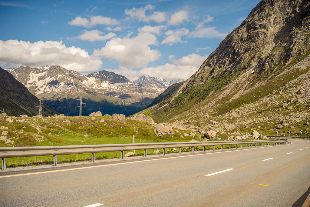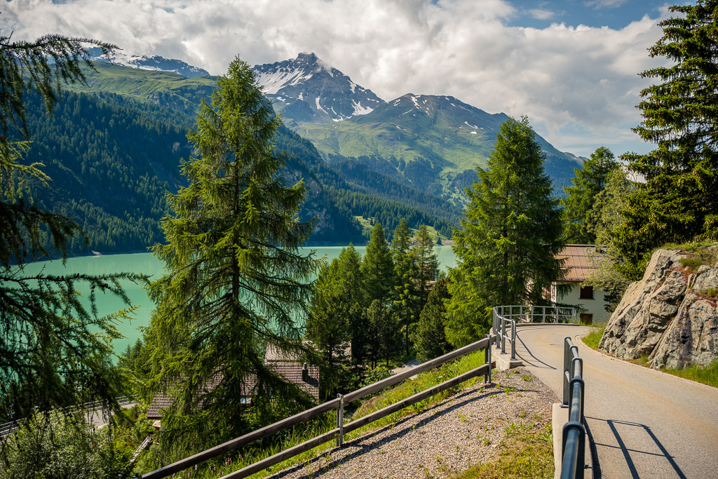 Nach einem kleinen Fotostopp auf der Mauerkrone vom Stausee, von wo aus wir auch schon eine Wanderung über dem Westufer nach Stalveder unternommen hatten, machte ich mich wieder ans Werk. Ich entdeckte jenseits der Leitplanken am Strassenrand noch einen kleinen Wanderweg, auf dem man den Strassenabschnitt bis Marmorera noch um die Hälfte hätte verkürzen können. Da aber gerade nicht sehr viel Verkehr unterwegs war, blieb ich auf der Strasse und erreichte die Abzweigung nach Marmorera.