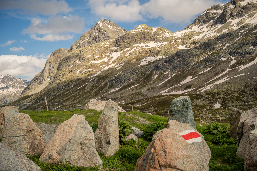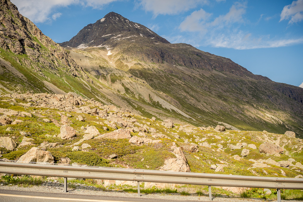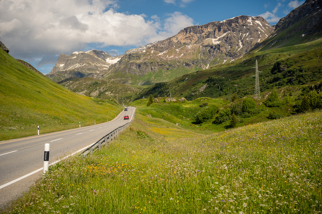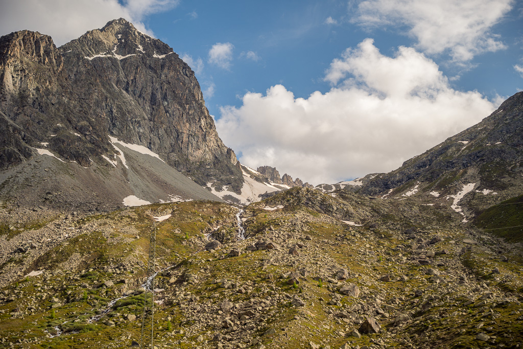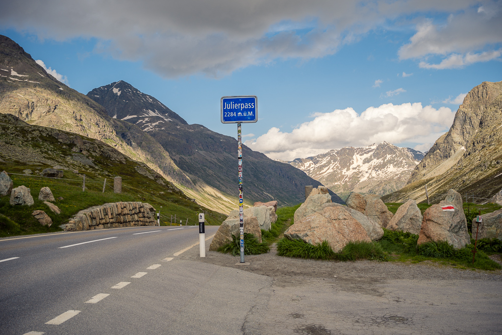 Hinter La Veduta stieg die Euphorie und kurz darauf war auch schon der Julierpass in Reichweite. Ich lag nun absolut komfortabel in der computerberechneten Zeit und genoss oben auf der Passhöhe die eindrückliche Bergkulisse und die Erinnerungen an verschiedene Ski- und Wandertouren (Piz Surgonda, Piz Lagrev, Piz Julier), die von hier aus starteten.