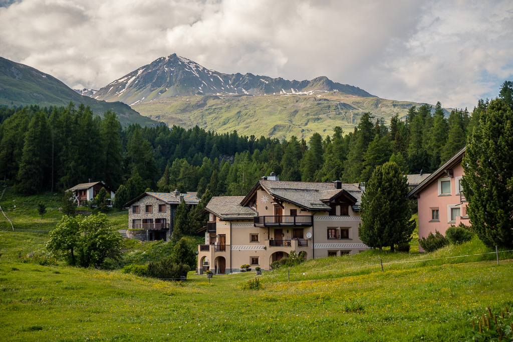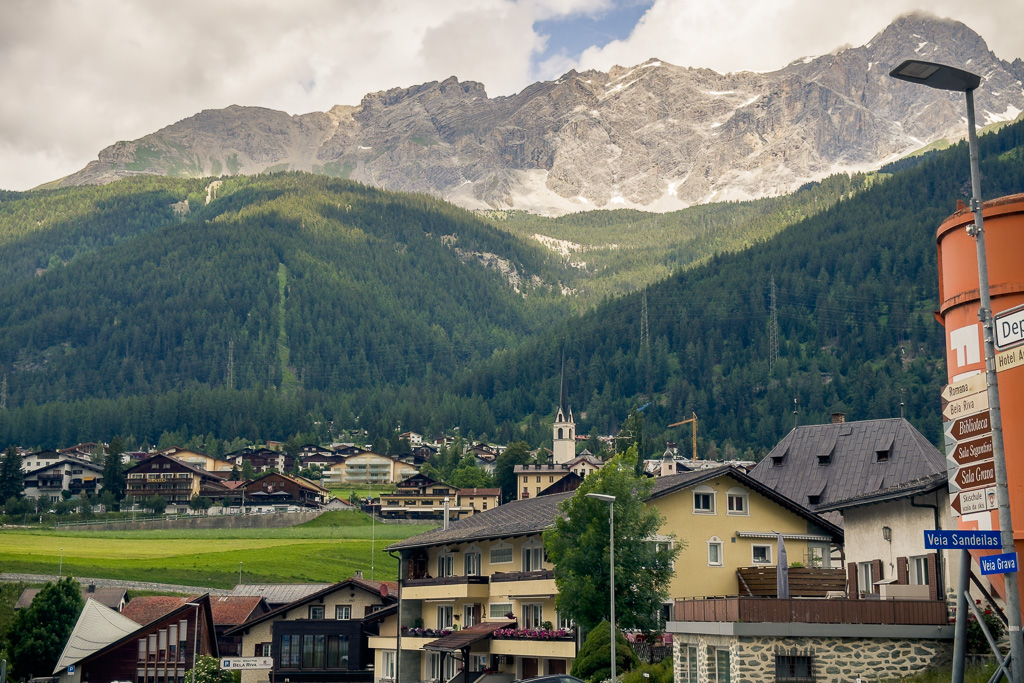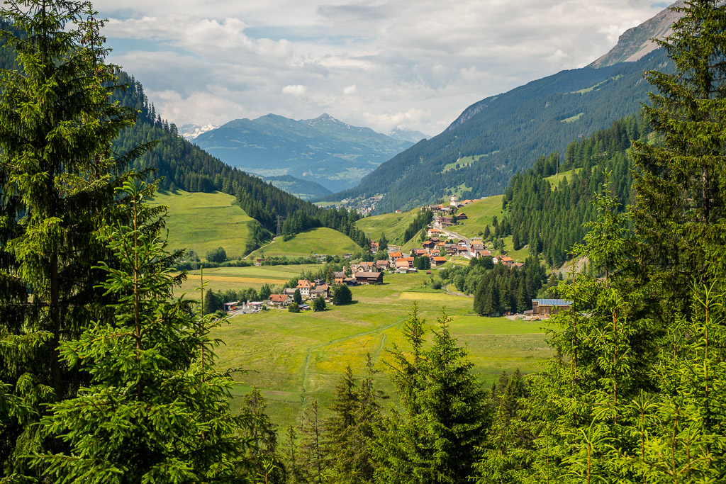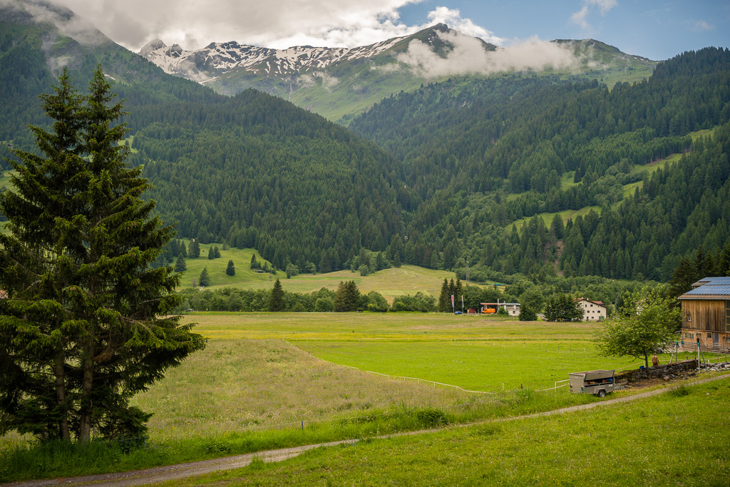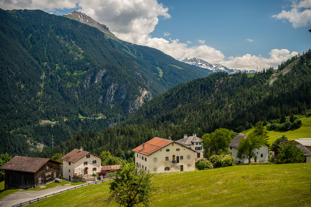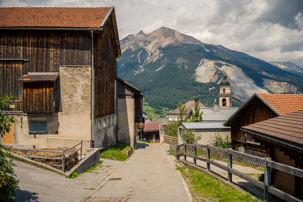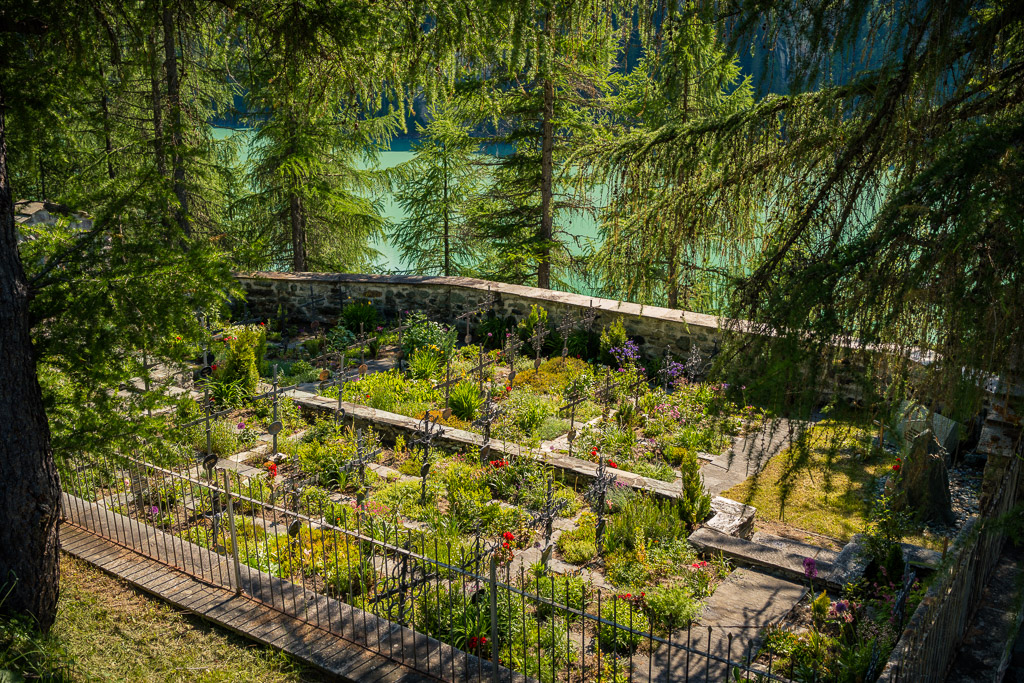 Hier ging es nun in engen Schlangenkurven zwischen den Häusern von Marmorera empor. Das Dorf hat ja eine etwas zwiespältige Geschichte – es wurde als Ersatz für die Überflutung vom ursprünglichen Dorf durch den Stausee gebaut, die nicht ohne Kontroversen stattfand – es ist aber landschaftlich wirklich idyllisch und ruhig gelegen. Der kleine, von Bäumen überschattete Friedhof vom Dorf mit dem Stausee im Hintergrund war für mich einer der schönsten Friedhöfe, die ich bisher gesehen hatte.