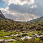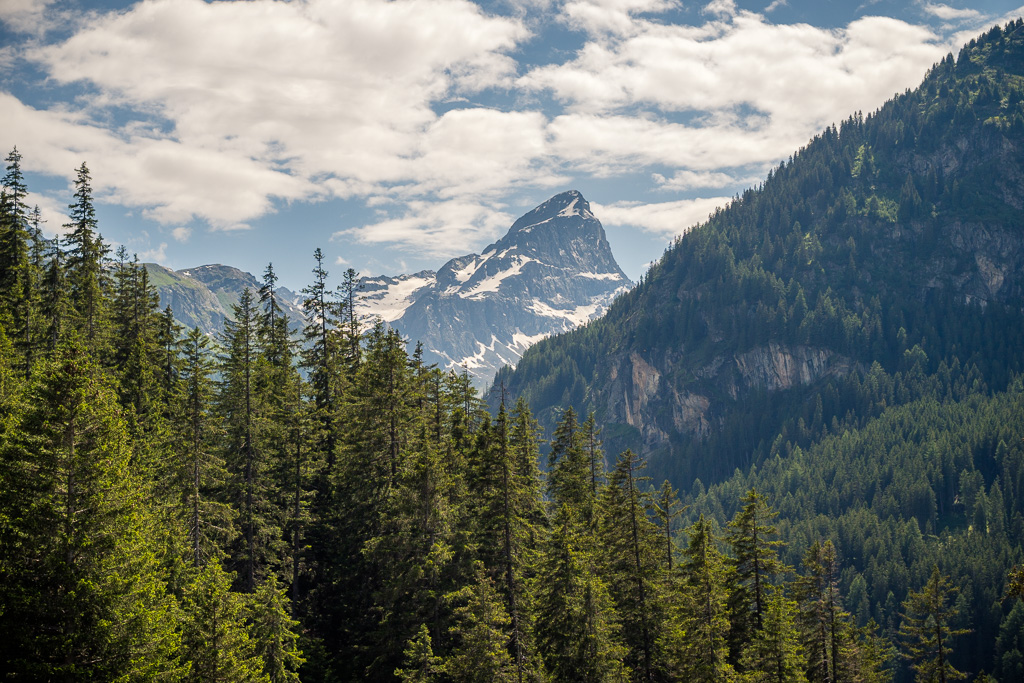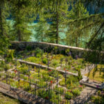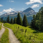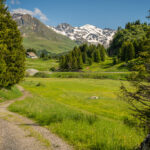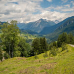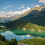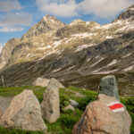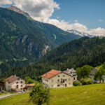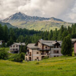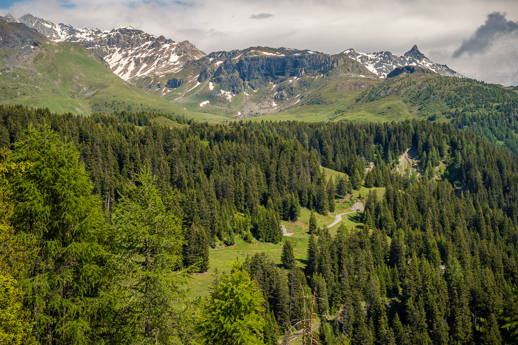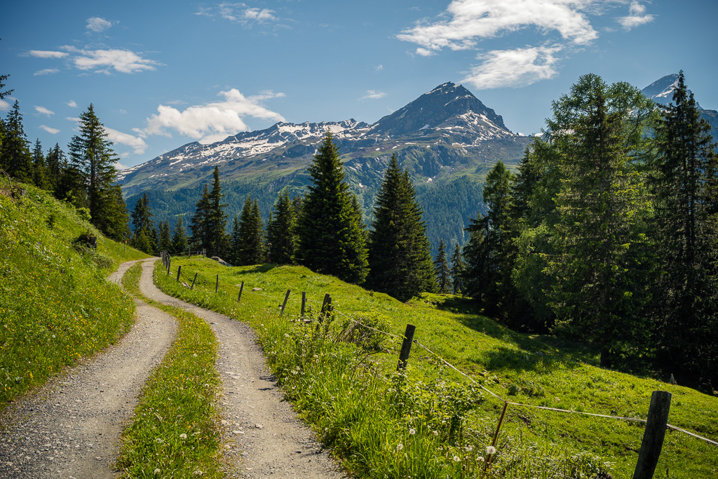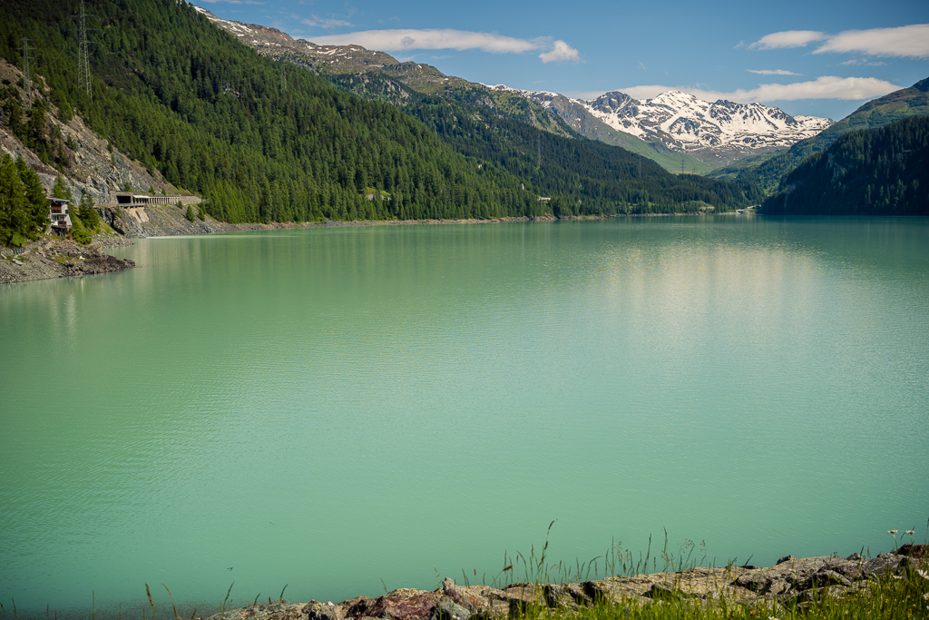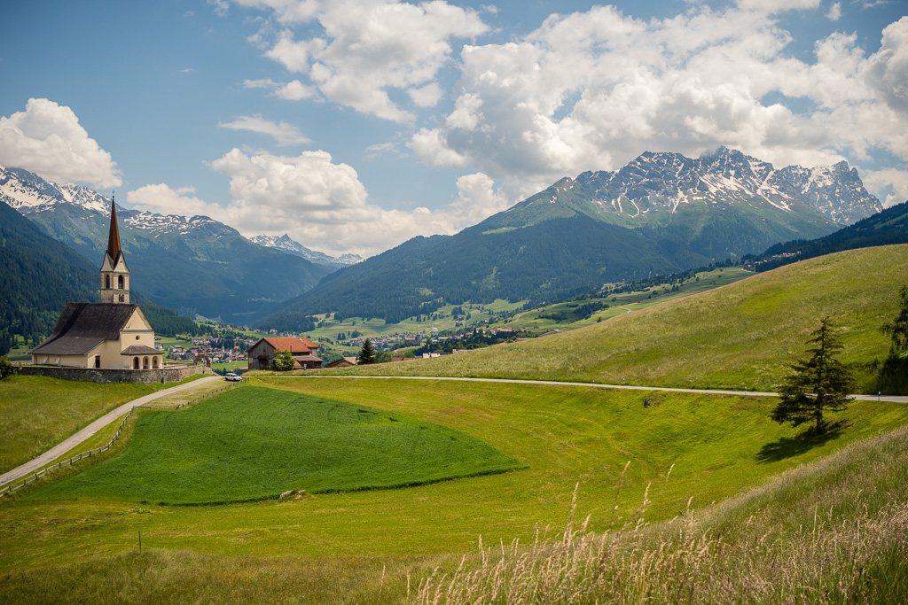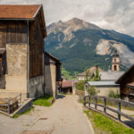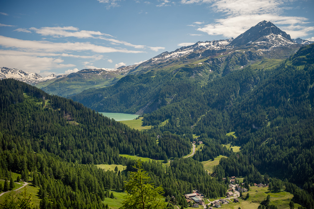 Hier ging es nun in engen Schlangenkurven zwischen den Häusern von Marmorera empor. Das Dorf hat ja eine etwas zwiespältige Geschichte – es wurde als Ersatz für die Überflutung vom ursprünglichen Dorf durch den Stausee gebaut, die nicht ohne Kontroversen stattfand – es ist aber landschaftlich wirklich idyllisch und ruhig gelegen. Der kleine, von Bäumen überschattete Friedhof vom Dorf mit dem Stausee im Hintergrund war für mich einer der schönsten Friedhöfe, die ich bisher gesehen hatte.