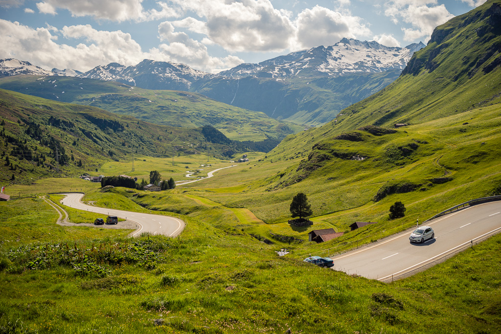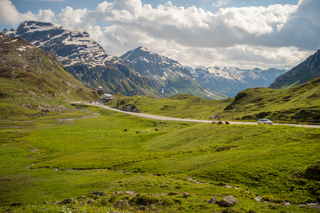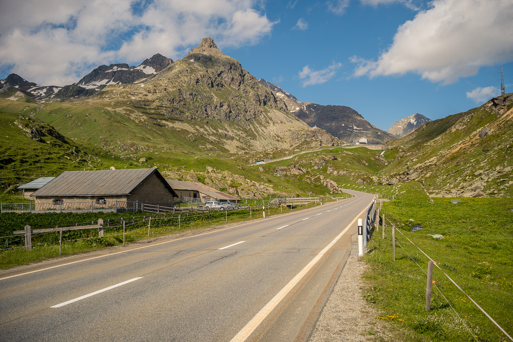 Ich fuhr also los. Die Passstrasse zeigte sich im ersten Teil sehr gutmütig, mit nur wenig Steigung erreichte ich die ersten Haarnadelkurven bei Bögia. Sie waren bald überwunden und in den breiten Kurven gab es stets auch ein paar flache Meter, um zwischendurch wieder durchzuatmen. Dann folgte ein weiteres relativ flaches Stück und bald konnte ich schon das Hospiz bei La Veduta weiter oben sehen. Von bisherigen Autofahrten wusste ich, dass die Passhöhe von La Veduta aus nicht mehr weit war.
