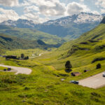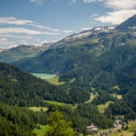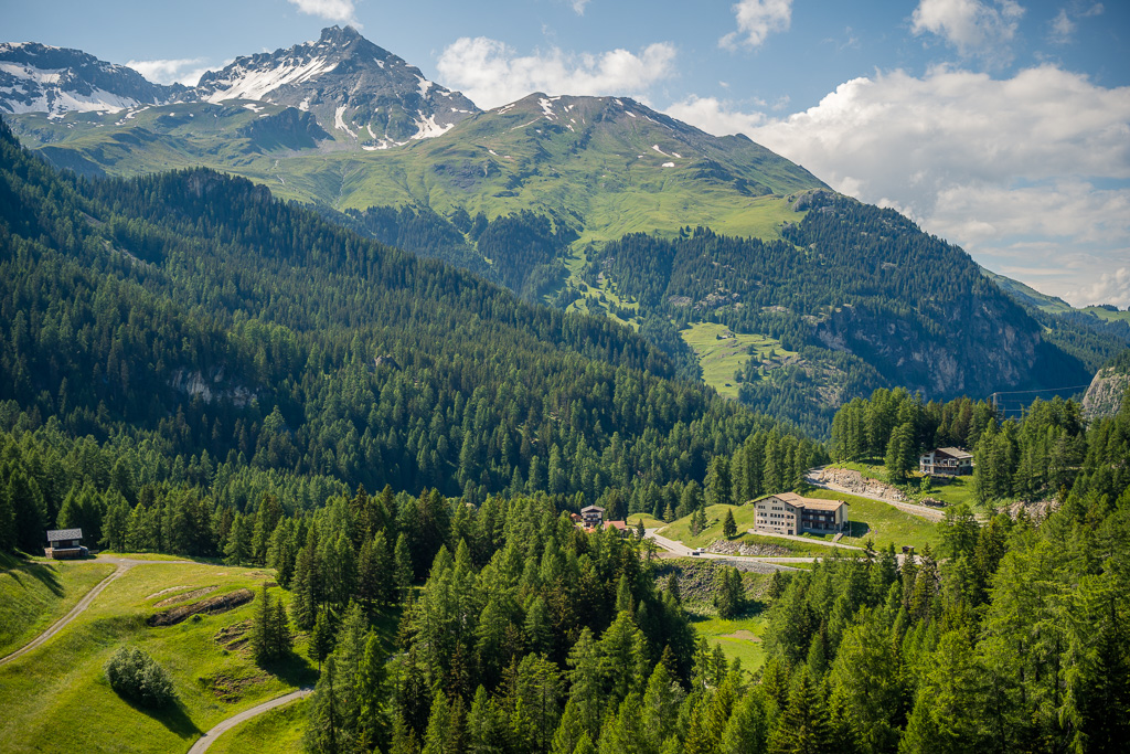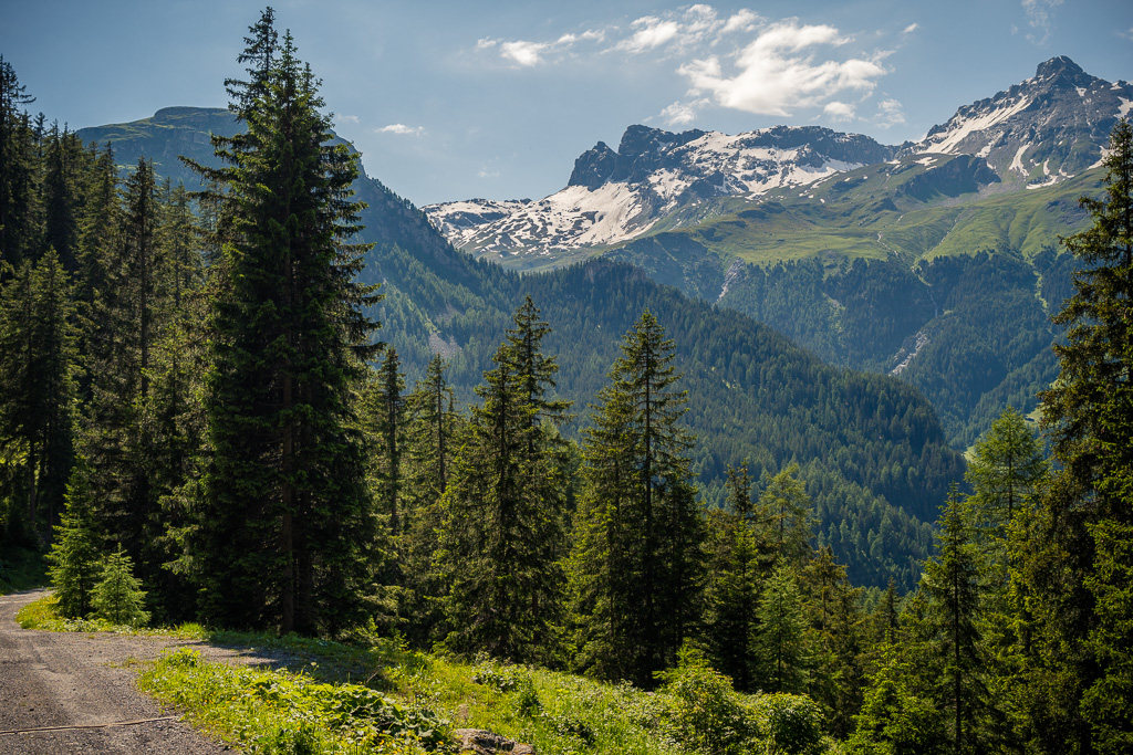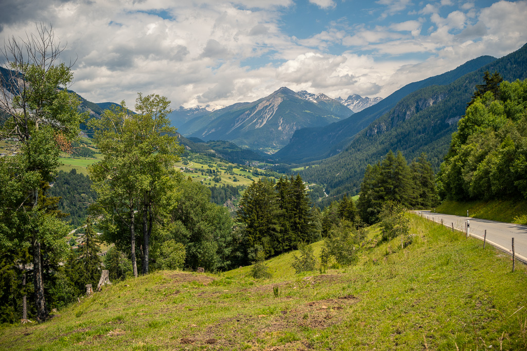 Ich machte mich nun also an den Aufstieg in Richtung Alp Flix. Schon während den ersten Minuten vom Aufstieg kam die Sonne wieder hinter den Wolken hervor und noch etwas später war es wieder sommerlich warm und hell, als ob nichts geschehen wäre. Ich kurbelte stetig weiter nach Pale Radonda hoch, von wo aus ich zum ersten Mal die türkisblaue Wasserfläche vom Marmorera-Stausee in der Ferne sehen konnte. Danach ging es bergab bis zur Einmündung in die Alpstrasse, die von Sur hinauf zum Gasthof auf der Alp Flix führt.