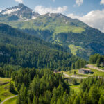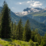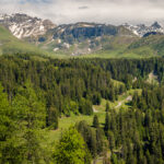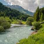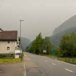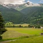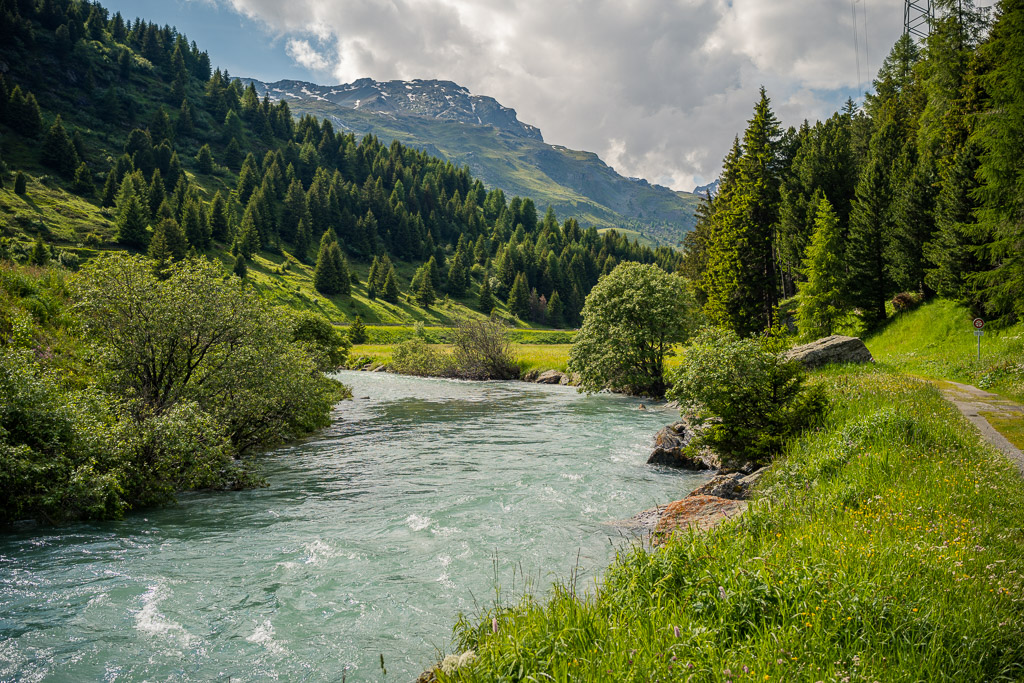 Auch diese Wegetappe folgte zunächst unserer letztjährigen Tour zur Alp Flix. Ein schöner Radweg führte von Savognin weiterhin am Fluss Gelgia entlang zum Kraftwerk Burs. Auf der Höhe von Tinizong bog der Weg dann aber in den Wald ab und ein weiterer Aufstieg in Richtung Rona nahm seinen Anfang. Ich hatte diesen viel steiler und anstrengender in Erinnerung; stattdessen ging es aber in einer komfortabler Steigung zügig voran und ich erreichte den Campingplatz in Rona schneller als gedacht. Allerdings sah es hier aus, als ob die Tour an dieser Stelle ein vorzeitiges Ende nehmen würde: ein düstere Regenfront baute sich auf und beim Campingplatz fielen schon die ersten Tropfen mit einer Deutlichkeit, die mich auf schnellstem Weg einen trockenen Unterstand bei der Bushaltestelle in Rona suchen liess. Es prasselte sodann erheblich, während ich auf dem Handy nach Eingebungen für das weitere Vorgehen suchte. Der nächste Bus nach Tiefencastel würde in einer Viertelstunde eintreffen. Andererseits zeigte das Radarbild von SwissMeteo aber auch an, dass ich mich nur unter einer kleinen Regenzelle befand, die sich rasch nach St. Moritz weiterbewegen würde. Auch wenn es um mich herum im Moment überhaupt nicht nach Wetterbesserung aussah, beschloss ich daher zu warten. Und tatsächlich: nach etwa 10 Minuten wurden von Savognin her kommend erste Flecken von blauem Himmel sichtbar und der Wolkenbruch liess langsam nach.