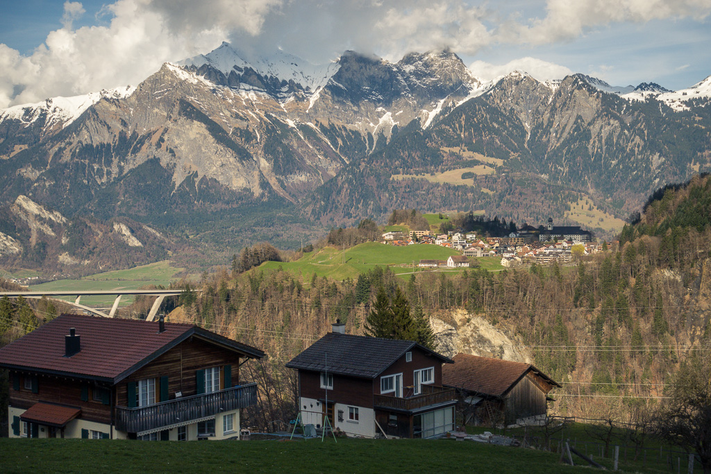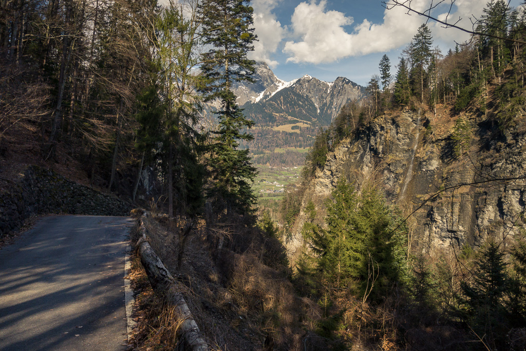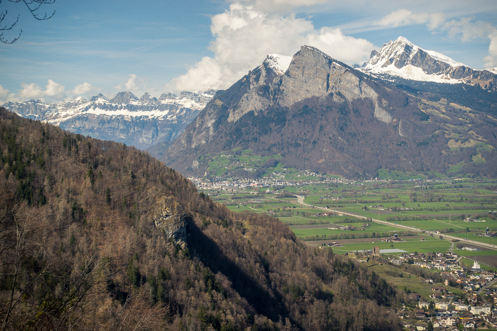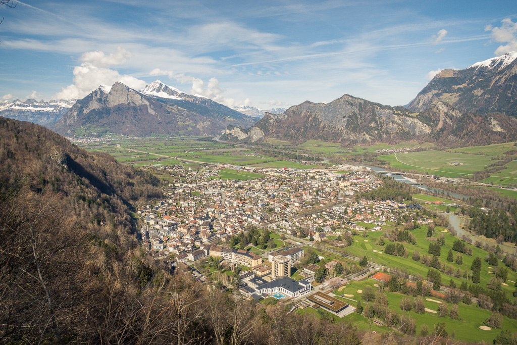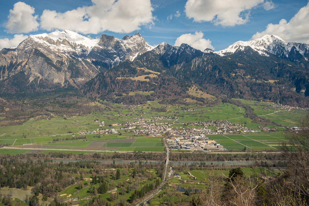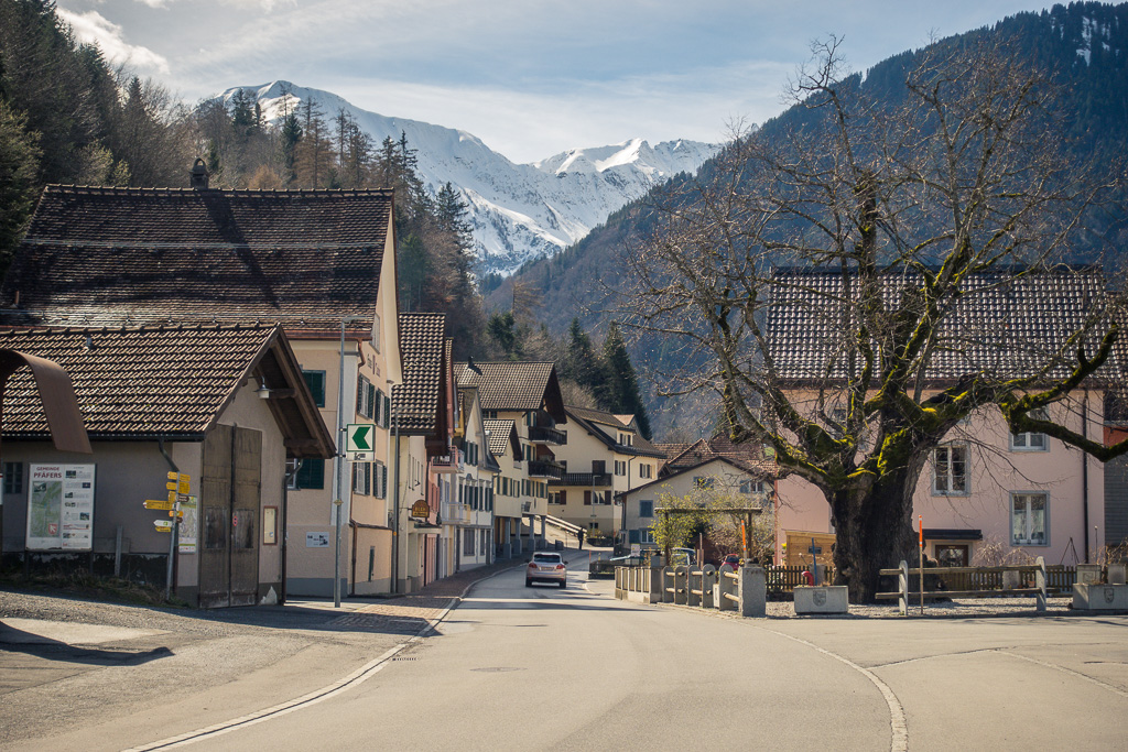 Der Anfang der Pfäferserstrasse war nicht auf Anhieb zu finden und führte etwas versteckt hinter der grossen Thermenanlage in Bad Ragaz und dem Casino in den Wald hinauf. Das kleine Dorf Pfäfers war nach einem nicht allzu langen Anstieg bald erreicht. Noch vor dem eigentlichen Dorfzentrum wurde ich auf einen Wegweiser zum Aussichtspunkt Tabor aufmerksam und beschloss, ihn gleich zu erkunden. Diese Anhöhe am Dorfrand bot einen weitläufigen Blick über das Rheintal und das Sarganserland.