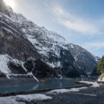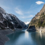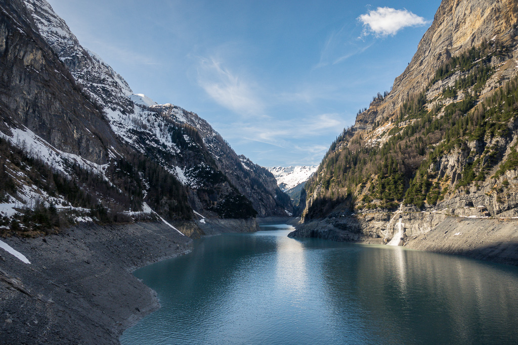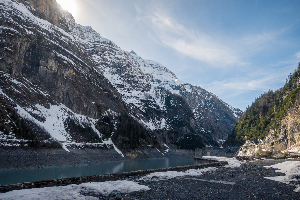 Auf der Staumauer angelangt, konnte ich dann einen herrlichen Blick auf den schon ziemlich abgelassenen Stausee und die Schneeberge weit dahinter erlangen. Dorthin – zum Gasthaus in St. Martin am westlichen Seeende und zur Sardonahütte SAC noch weiter hinten über dem Talschluss – würde man im Sommer über die Strasse am südlichen Seeufer gelangen. Mit einem Blick war mir jedoch klar, dass dies heute (leisen Hoffnungen zum Trotz) absolut ausgeschlossen sein würde. Die Strasse war auf weiten Teilen vom Lawinenschnee verschüttet, ebenso auch schon die ersten sichtbaren Tunnelportale auf der Strecke.