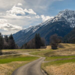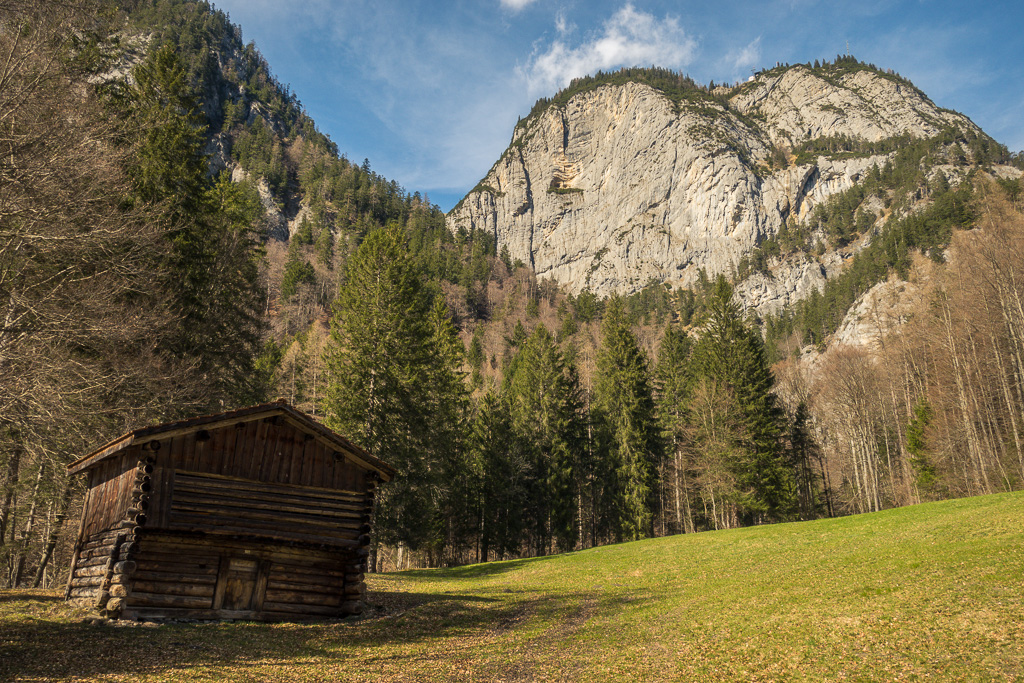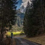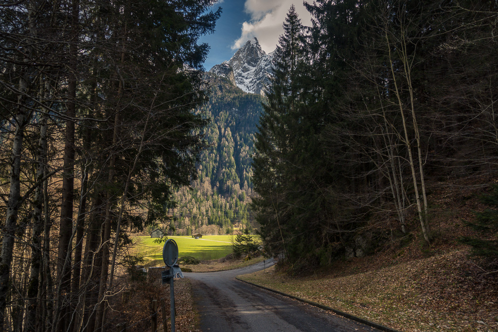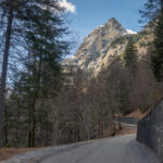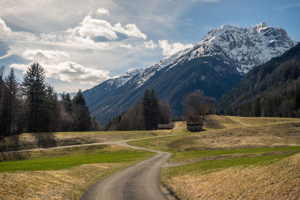 Die Strasse folgte nun dem rauschenden Fluss der Tamina etwa 3 km, bis rechts ein Waldweg abzweigte. Diesen hatte ich beim letzten Mal noch nicht entdeckt; er führte aber durch Wald und über offene Wiesen abseits des Autoverkehrs ebenfalls bis nach Vättis und war landschaftlich so idyllisch, dass ich ihn auch für die Rückfahrt wählte. Unterwegs bekam man noch den hoch aufragenden Vättnerberg zu sehen, auf den offenbar eine öffentliche Seilbahn fährt.