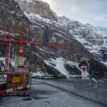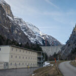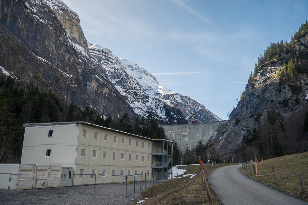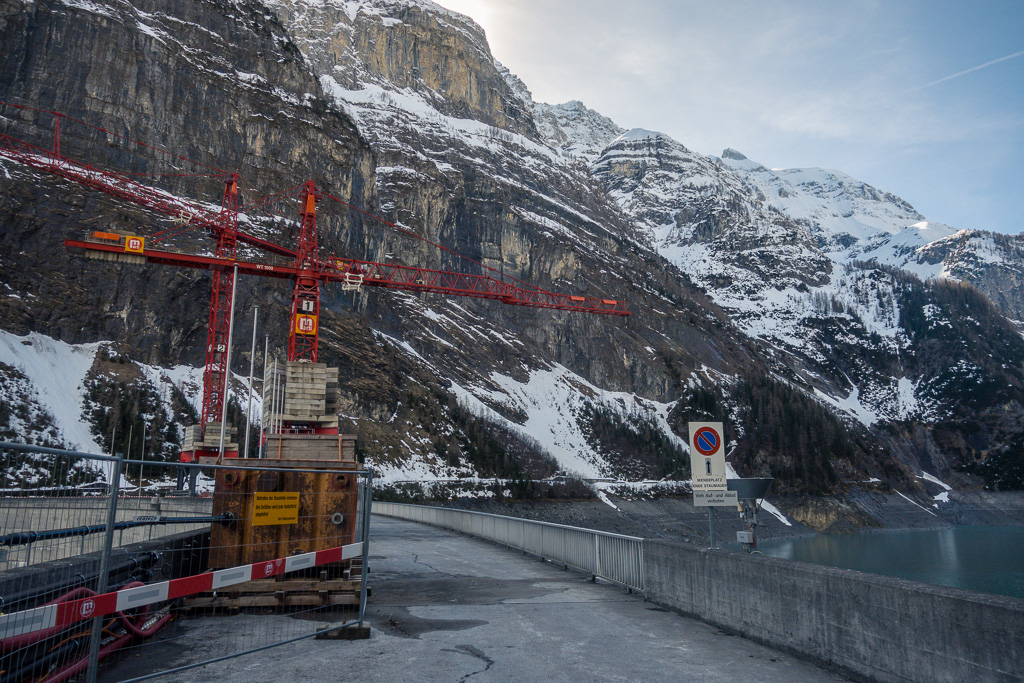 Nach einiger Zeit erreichte ich eine offene Anhöhe, auf der das Berggasthaus Gigerwald stand. Von hier aus war bereits die Staumauer des Gigerwaldsees zu sehen. Baukräne auf der Mauerkrone, Gerüste und Mannschaftsunterkünfte deuteten an, dass offenbar grosse Bauarbeiten im Gang waren. In der Tat war eine Sanierung der Staumauer für diesen Winter vorgesehen. Wegen dem Ukrainekrieg wurden die Bauarbeiten aber unterbrochen und auf den Winter 2024/25 verschoben, sodass die bereits begonnene Baustelle völlig verlassen war. Dies zum Glück für mich, da die Fahrt zur Staumauer sonst definitiv unmöglich gewesen wäre (und im nächsten Frühling vor Saisonbeginn wohl auch immer noch sein wird).