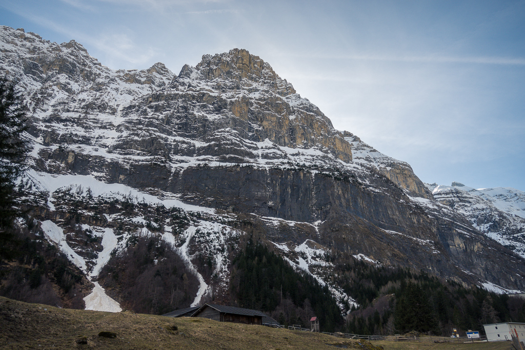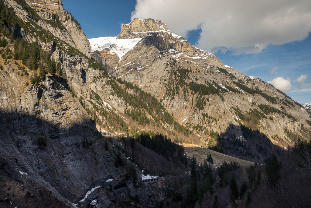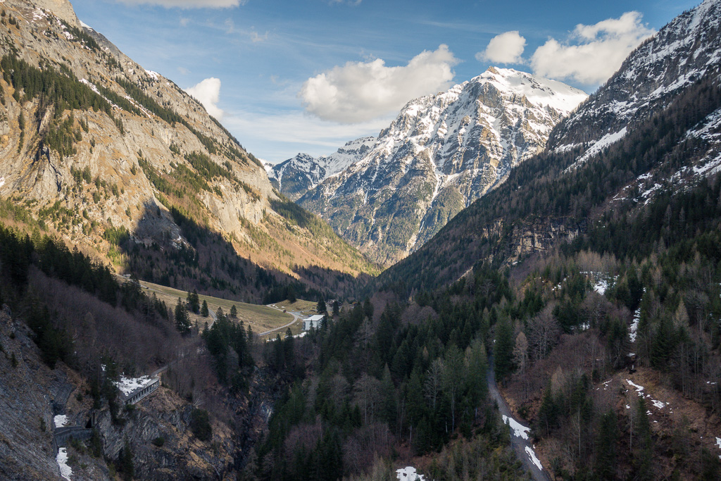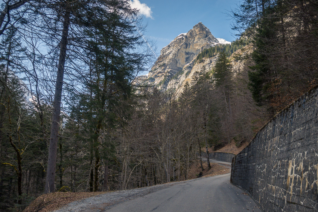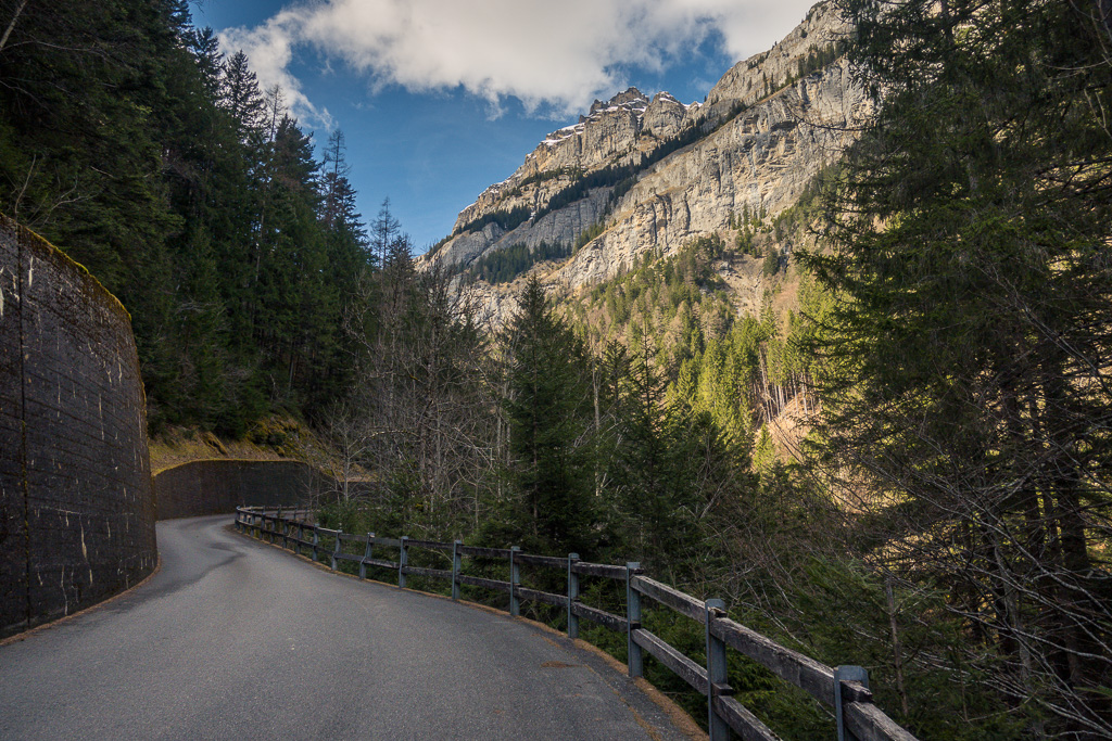 Vom Zentrum vom Vättis ging es dann nach Westen auf der mittels Schranke gesperrten Autostrasse ins Calfeisental hinein. Die Strasse ist jeweils ab Oktober bis Ende Mai wegen Lawinengefahr geschlossen. Woher diese Lawinen kommen, wird im Verlauf von weiteren Aufstieg bald einmal klar: Strasse und Tal werden auf beiden Seiten durch mächtige und sehr steile Bergflanken eingeschlossen. Während die südseitigen Hänge auf der rechten Strassenseite in der Sonne schon ziemlich ausgeapert waren (wie auch die Strasse selber), waren die Nordhänge noch tief verschneit. Im Aufstieg zur Staumauer verlief die Strasse jedoch unter den Südhängen und hoch über dem Bachbett der Tamina, sodass die andere Hangseite mit ihren weit herabreichenden Lawinenkegeln in sicherer Entfernung war.