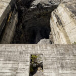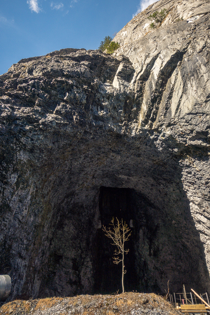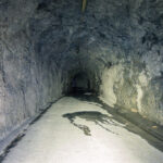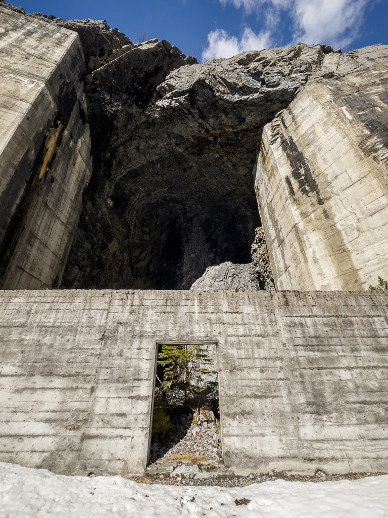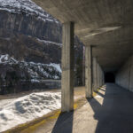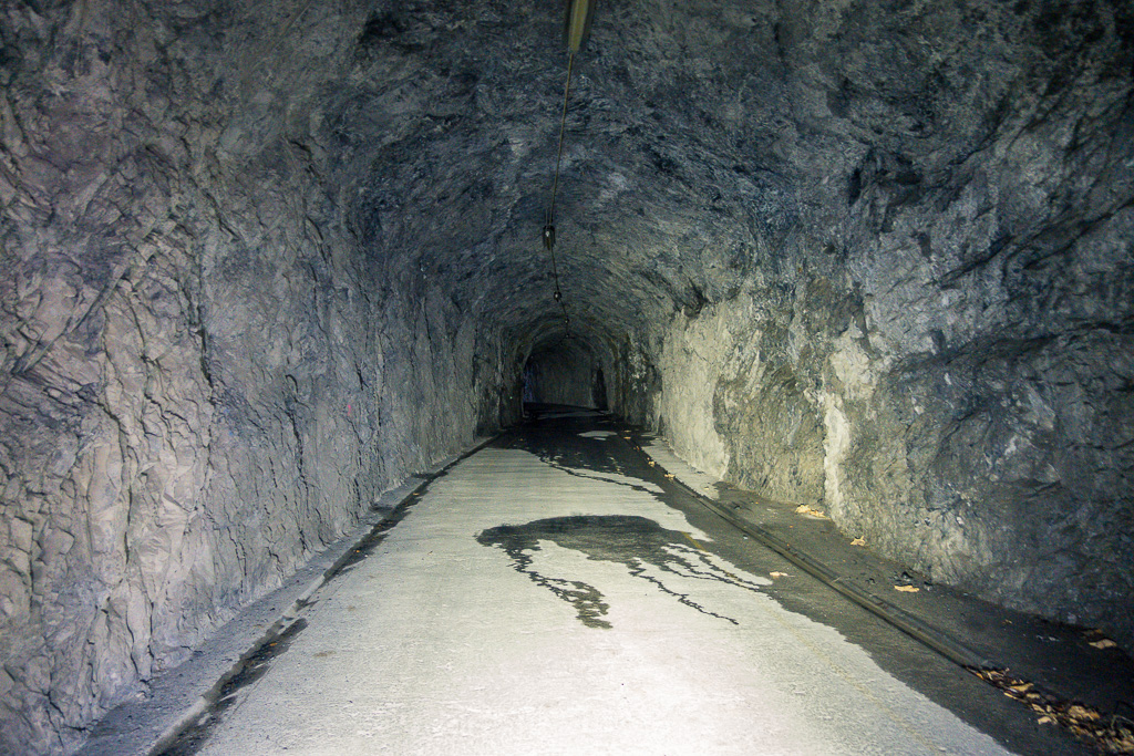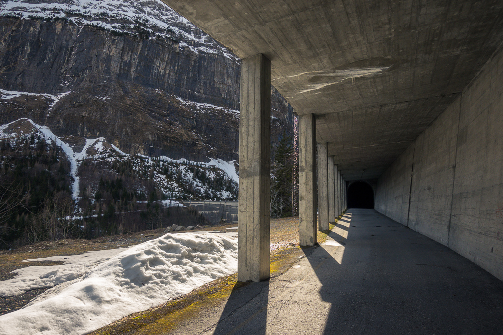 Vom Berggasthaus fuhr ich in einigen Serpentinen weiter hoch bis zur Höhe der Mauerkrone. Zwischen mir und der Staumauer lag nun das letzte kleine Hindernis: eine Galerie gefolgt von einem stockdunklen, unbeleuchteten und länger als erwarteten Tunnel durch den Felshang zur Mauer. Zum Glück hatte ich mir vor einiger Zeit ein starkes Frontlicht für das Gravelbike angeschafft, sodass ich zügig und ohne Kollisionen in der Finsternis zum anderen Ende gelangen konnte.