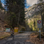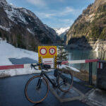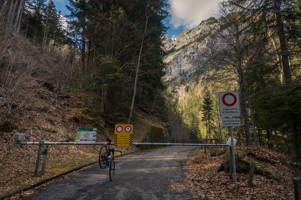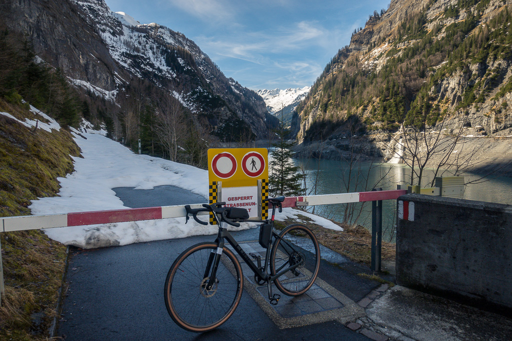 Mit dem Gravelbike auf der im Winter gesperrten Zufahrtsstrasse zum einsamen Gigerwaldsee im Calfeisental, bevor der grosse Touristenansturm Anfang Juni beginnt.