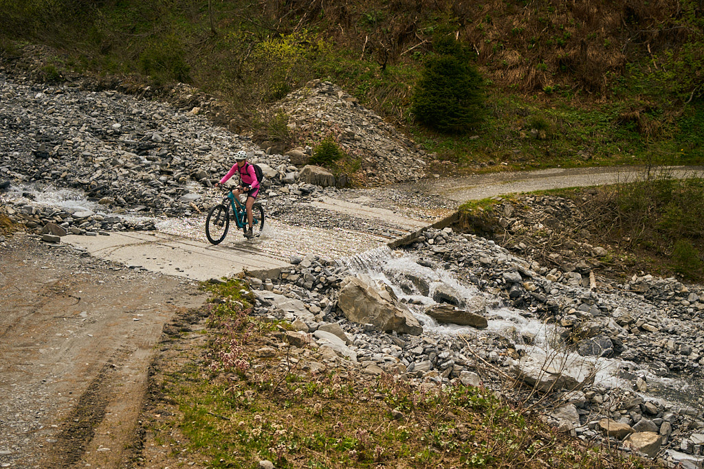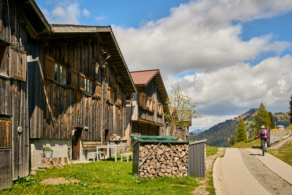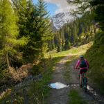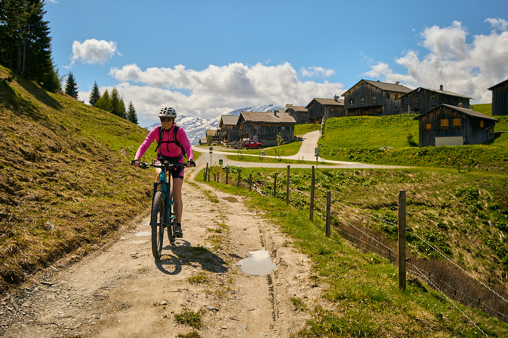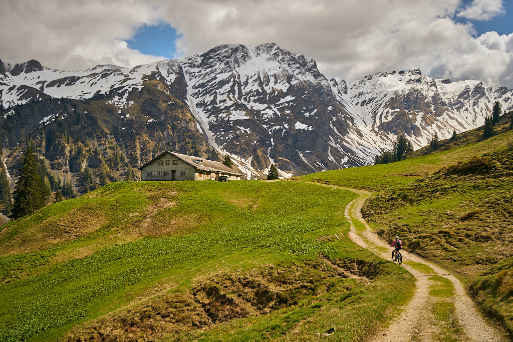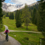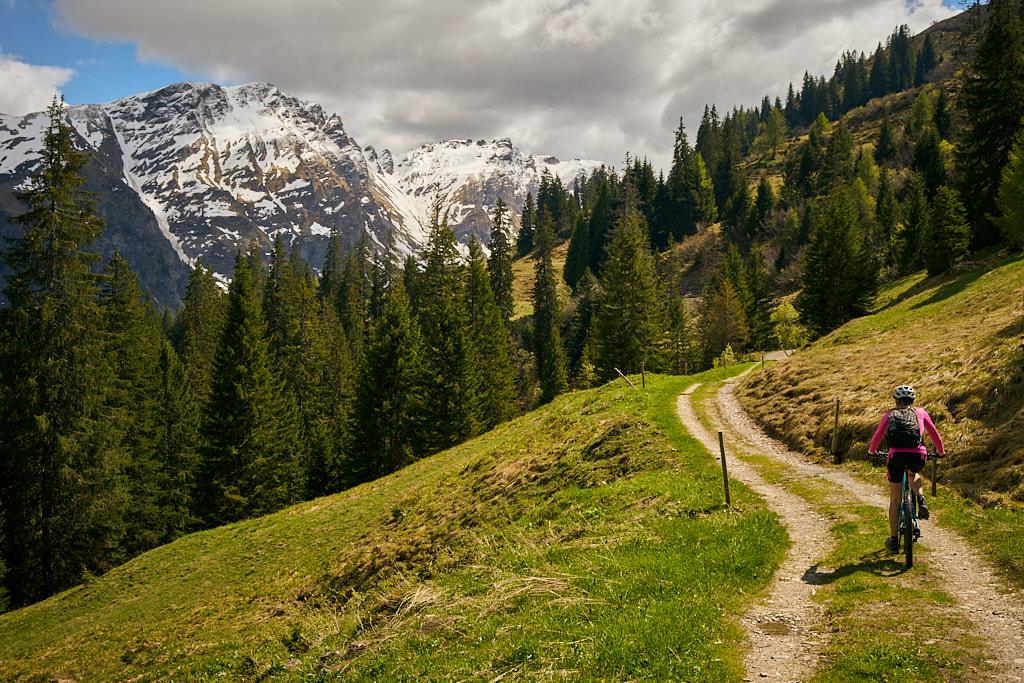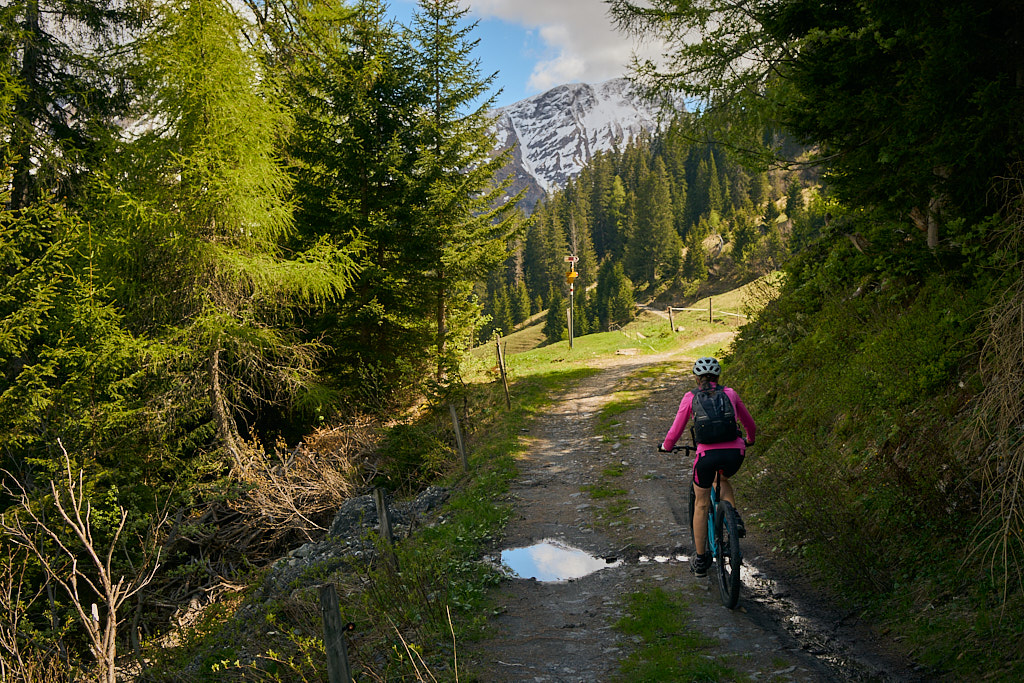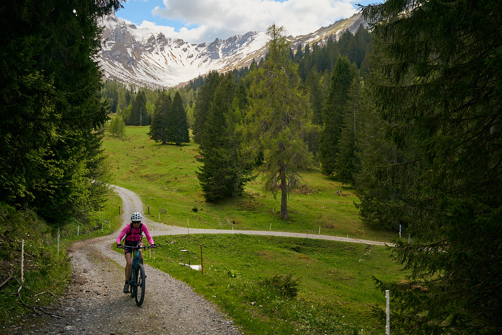 Von Vordersäss schlängelte sich der Alpweg in Kurven hinab zur Alp Falsch. Ein Name, der schon auf der Zunge merkwürdig klang. Von hier aus könnte man sogar nach Ober Falsch wandern. Wir verzichteten auf weitere topografische Namensspiele und rollten stattdessen weiter bergab in die Schlucht von Hinter Valzeina. Hier erwartete uns der nächste Prüfstein: Ein unangenehm starker und überraschend kalter Gegenwind, der die Abfahrt zu einem eher kühlen Vergnügen machte. Nach dieser erfrischenden Erfahrung folgte ein gemächlicher Gegenanstieg nach Clavadätsch, bevor wir dem Hang entlang zum Ortseingang des kleinen, aber ausgesprochen malerischen Dorfes Valzeina fuhren.
