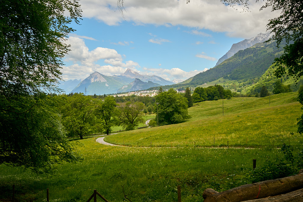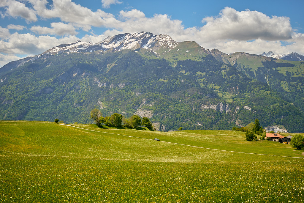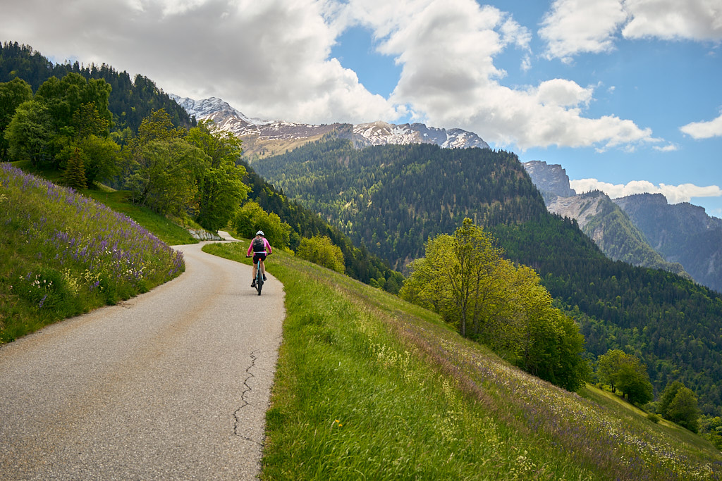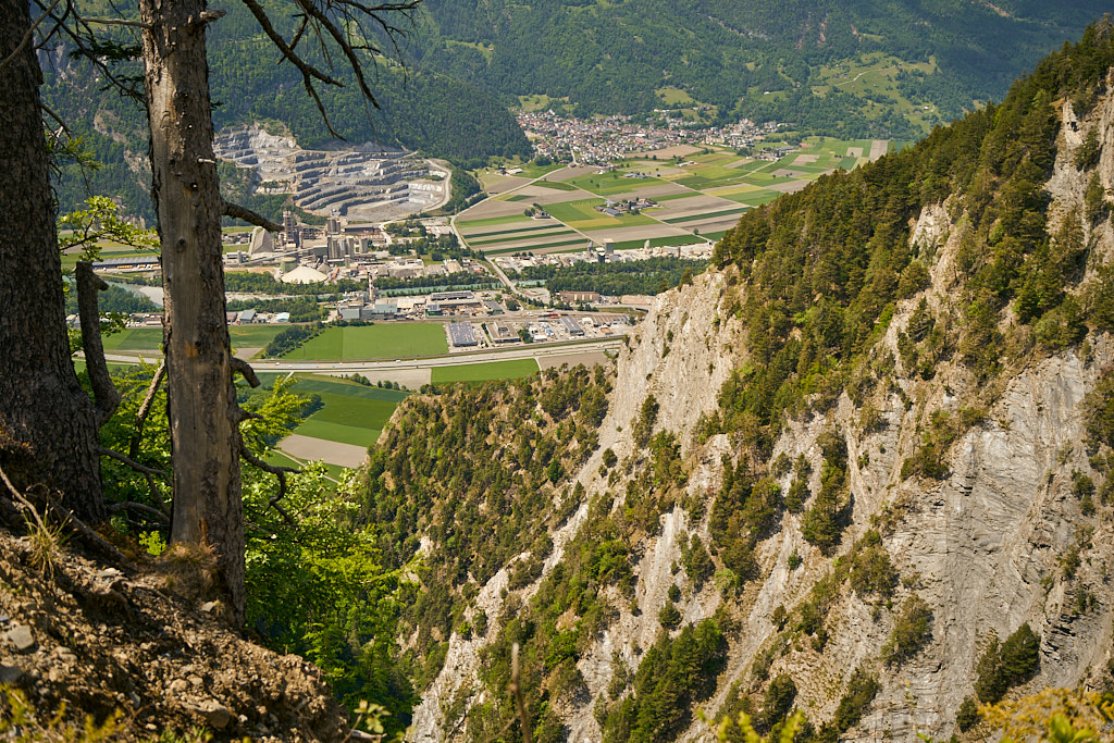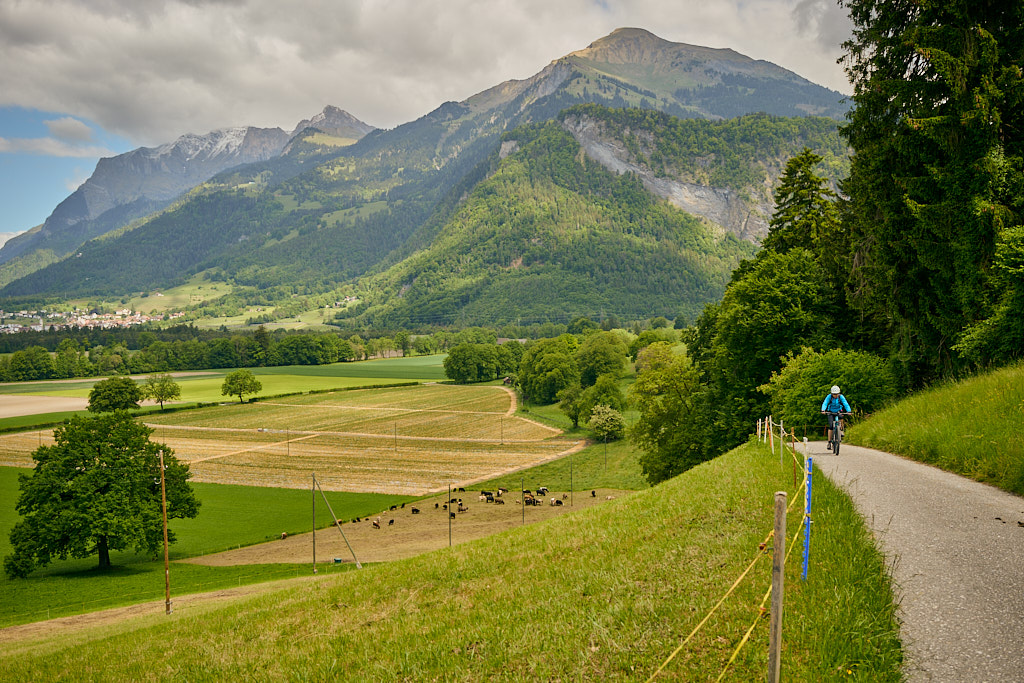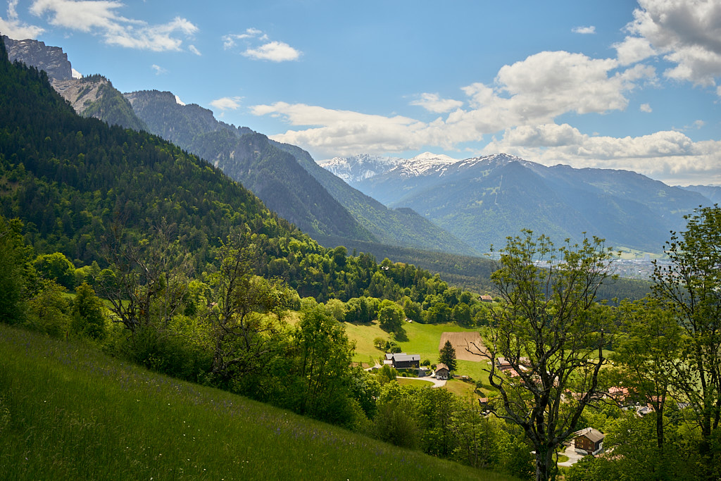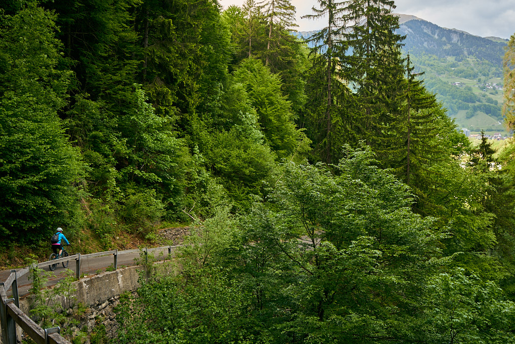 In Trimmis begann dann der ambitioniertere Teil der Tour. Vor uns türmten sich die Bergflanken östlich des Rheintals auf, eine schier abweisende Wand, die es auf über 1000 Höhenmetern Strasse zu bezwingen galt. Der Anstieg zu den Dörfern Says und Obersays fühlte sich, um es vorsichtig auszudrücken, unendlich an. Monotonie machte sich breit, einzig unterbrochen von der schieren Anstrengung. Immerhin, die Tiefblicke auf das Rheintal waren prächtig (sofern man noch die Kraft hatte, sie zu registrieren), und das Konzert der blühenden Wiesen, zirpenden Grillen und zwitschernden Vögeln versuchte redlich, uns über die mühsame Plackerei hinwegzutäuschen.