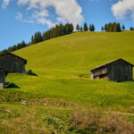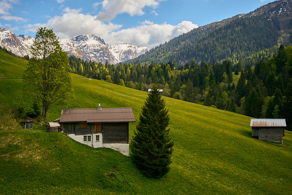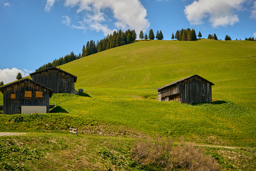 Von Obersays führte eine Alpstrasse weiter, vorbei an zahlreichen abgelegenen Ferienhütten, deren Bewohner uns wahrscheinlich aus sicherer Distanz beobachteten, zu einer Ansammlung alter Hütten in Stams. Dieser passähnliche Übergang, eingebettet zwischen Cyprianspitz und Scammerschpitz, markierte den Wechsel auf die Ostseite der Bergkette.
