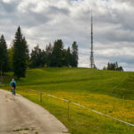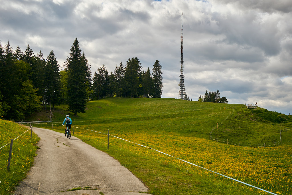 Kurz vor Valzeina stach sie uns ins Auge: eine schmale, gewundene Privatstrasse, die sich zum markanten Fernsehturm auf dem Mittagsspitz emporschlängelte. Der Turm, vom Rheintal aus weithin sichtbar, suggerierte eine grandiose Rundumsicht. Trotz spürbar müder Beine und der Aussicht auf zusätzliche 250 Höhenmeter entschieden wir uns für den Abstecher.