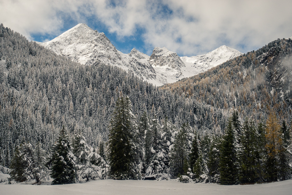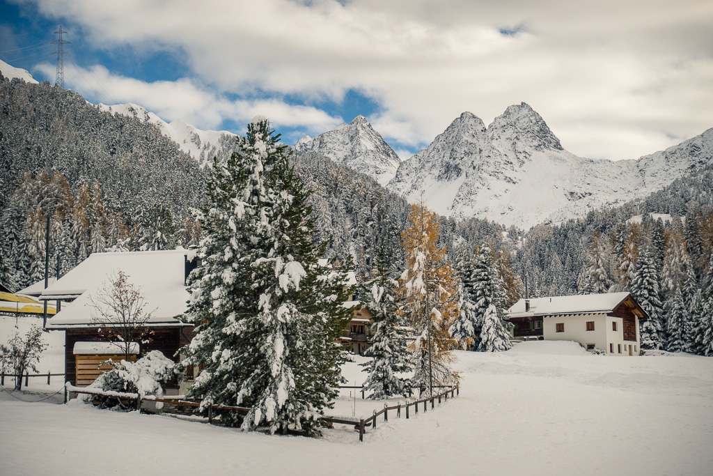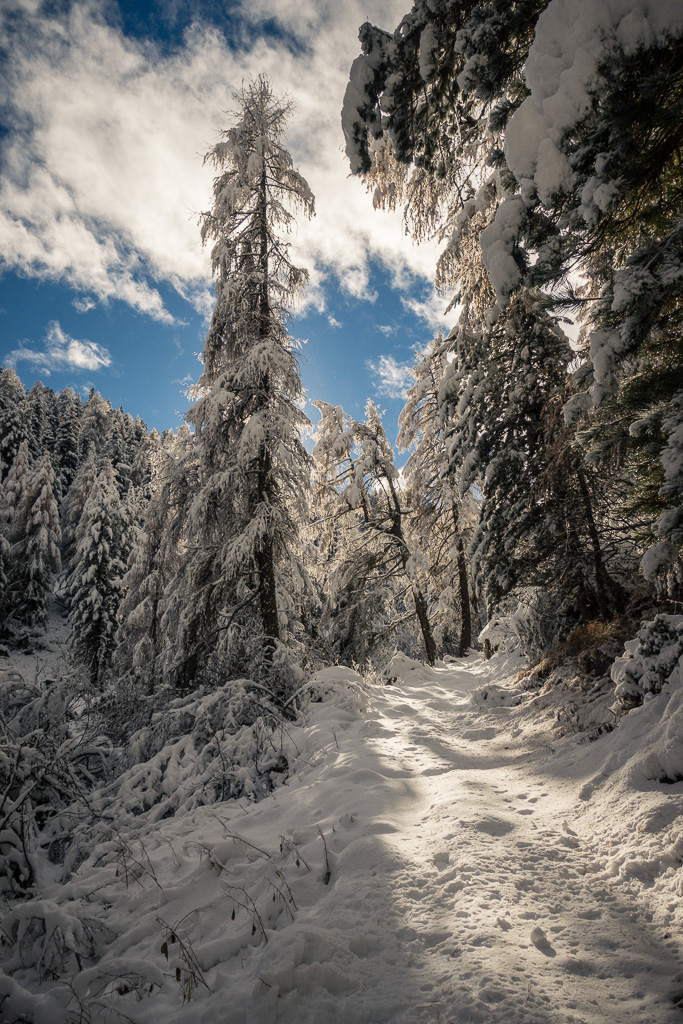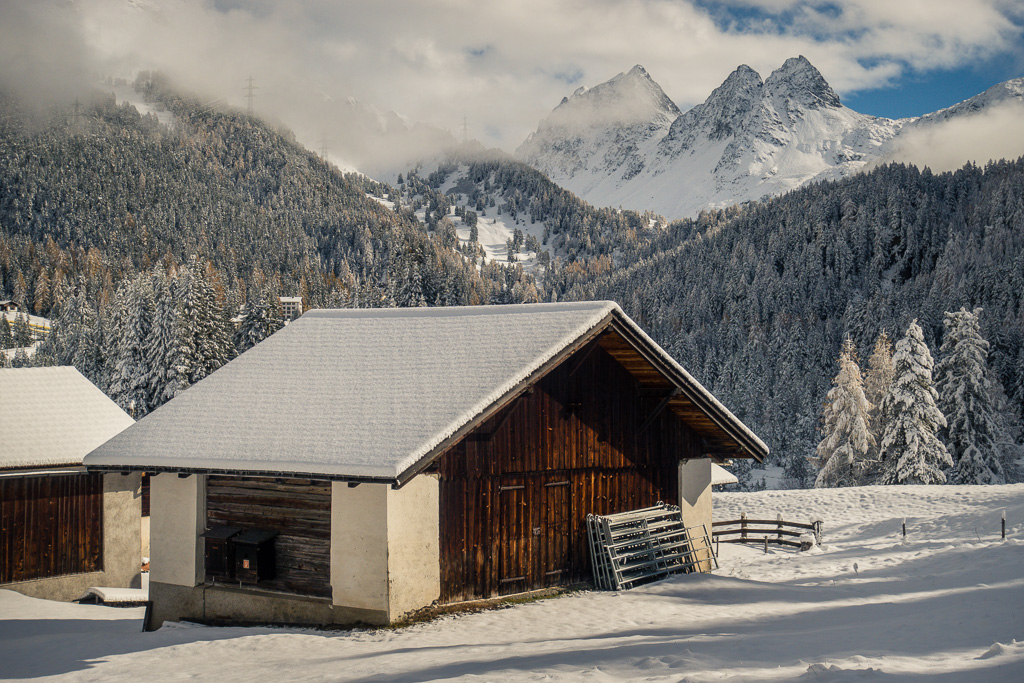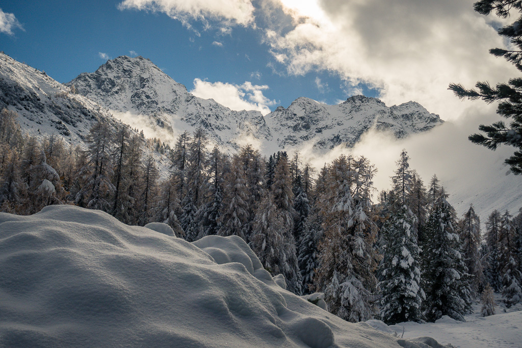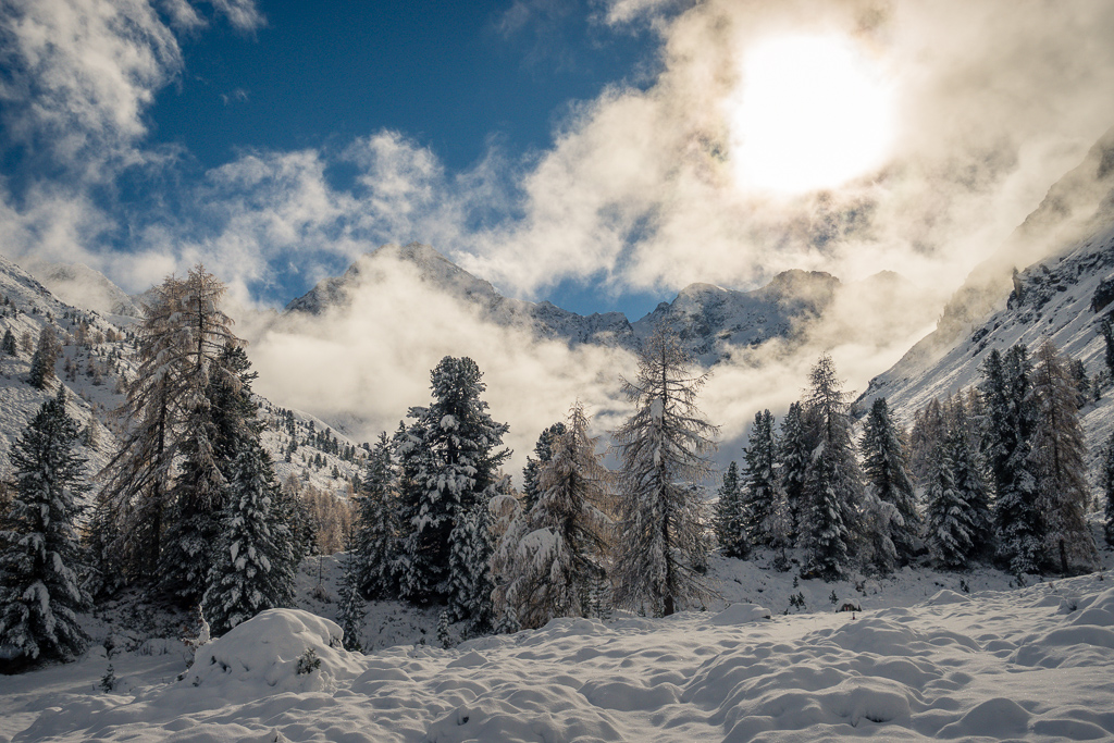 Von Preda der Bahnlinie entlang bis zu den Hütten von Naz. Zwischen diesen hinauf und dahinter auf einem Waldweg ins Val Mulix aufsteigen. Wir sind bei frühwinterlichen Verhältnissen im Schnee bis zur kleinen Hütte auf der Alp Mulix vorgedrungen und danach auf gleichem Weg wieder abgestiegen.