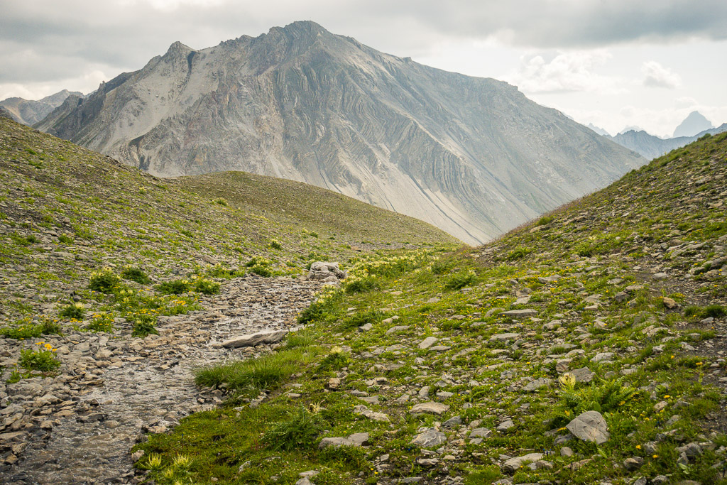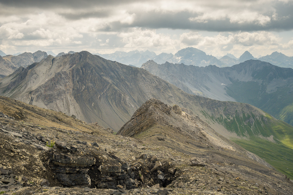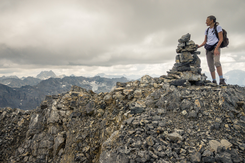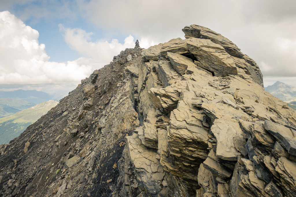 Über Grashänge ins Mitteltälli aufsteigen zu P.2414. Auf zunehmend mühsamen Blockgeröllfeldern und -hängen und ab 2600m sehr mühsam zum Mitteltälligrat, dem Südwestausläufer des Älplihorns. Auf dem Gratrücken wird das Gelände viel einfacher und man erreicht relativ bequem auf Wegspuren den Vorgipfel, von dem aus man den Steinmann auf dem Hauptgipfel sehen kann.