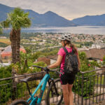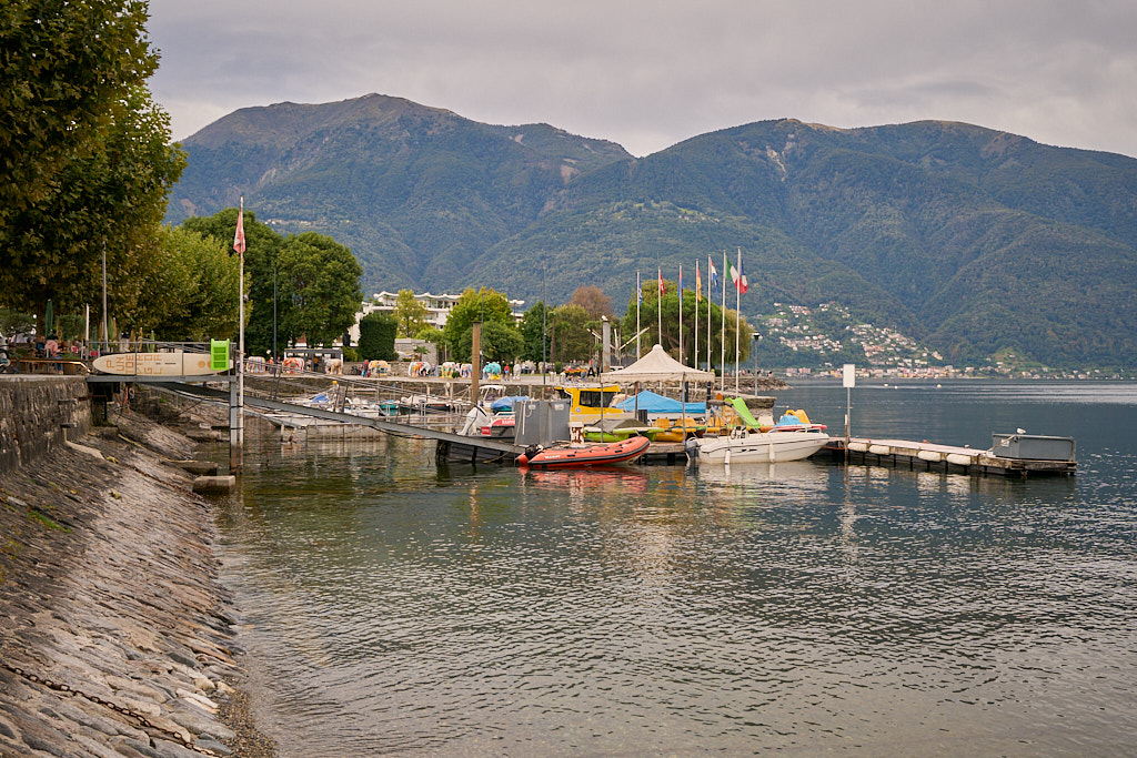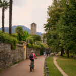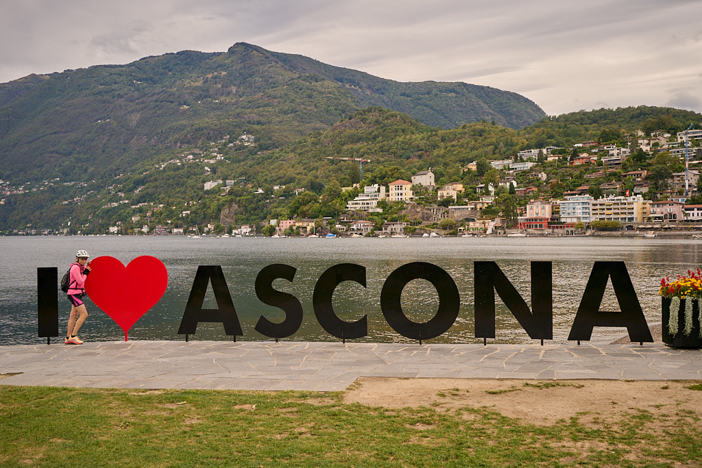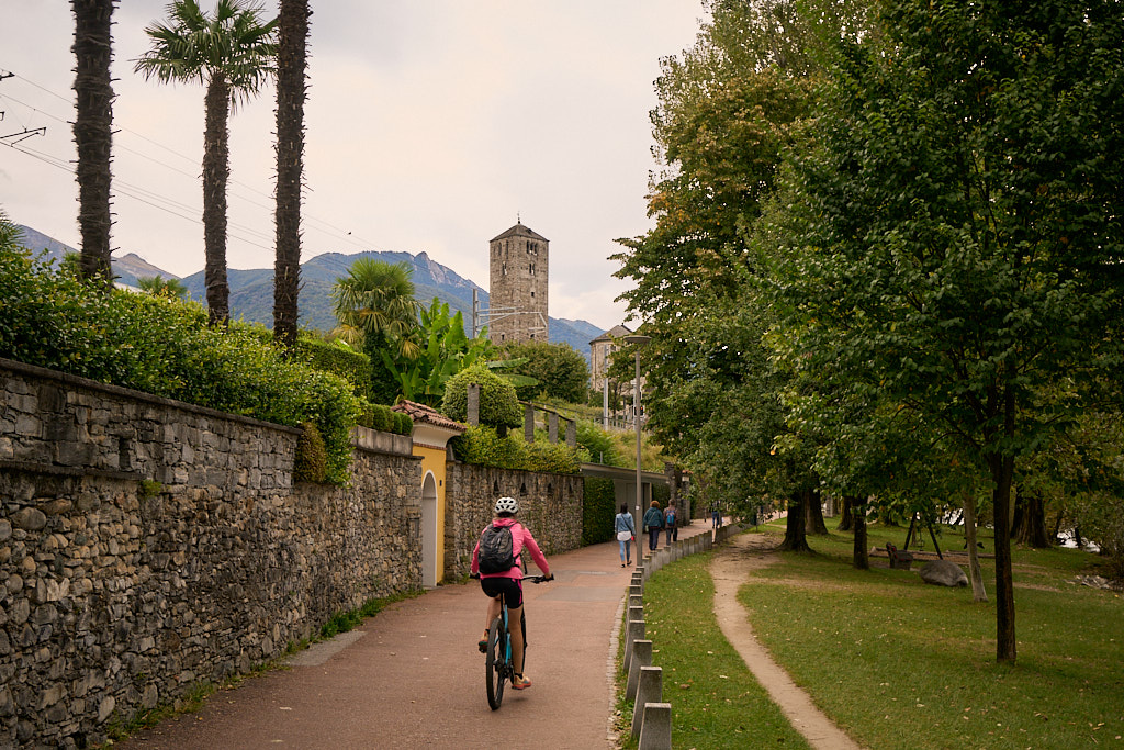 Auf der gegenüberliegenden Seite der Mauerkrone führte ein Wanderweg in den steilen Bergwald hinein. Wir folgten ihm mit unseren Bikes unter den Armen bis zu seinem Ende am Rand der Strasse von Contra zum Bergdorf Mergoscia. Von hier aus fuhren wir hinunter nach Contra und dem Hang entlang weiter durch Brione und Orselina. Diese Dörfer an den Hängen über Locarno waren gespickt mit teuersten Villen, einige davon abgeschottet wie Festungen, andere mit ihrem kubischen, gegen die Strasse hin fast fensterlosen Baustil mit schweren Eisentoren geradezu bunkerartig. Unterwegs kamen wir an der Talstation der Seilbahn von Madonna del Sasso vorbei, an der reger Betrieb herrschte. Danach fuhren wir in zahlreichen Kurven hinunter ins Stadtzentrum von Locarno, wo wir ein wenig die Orientierung verloren. Meine Routenplanung hatte verschiedene Einbahnstrassen nicht berücksichtigt und der Bikecomputer kannte sich bei seinen Vorschlägen für Umfahrungen leider auch nicht viel besser aus als ich, wie es schien. Nach einer kleinen Irrfahrt durch verwinkelte Gassen fanden wir aber dann doch den richtigen Weiterweg und landeten am Schluss zielgenau auf der Uferpromenade von Ascona.