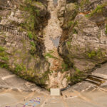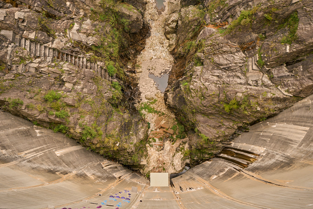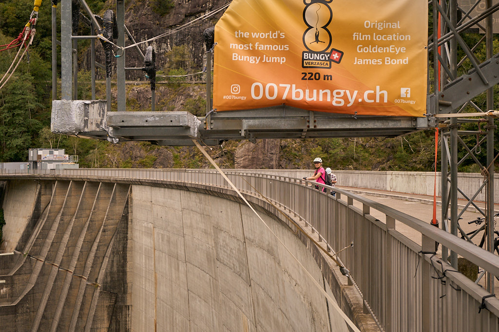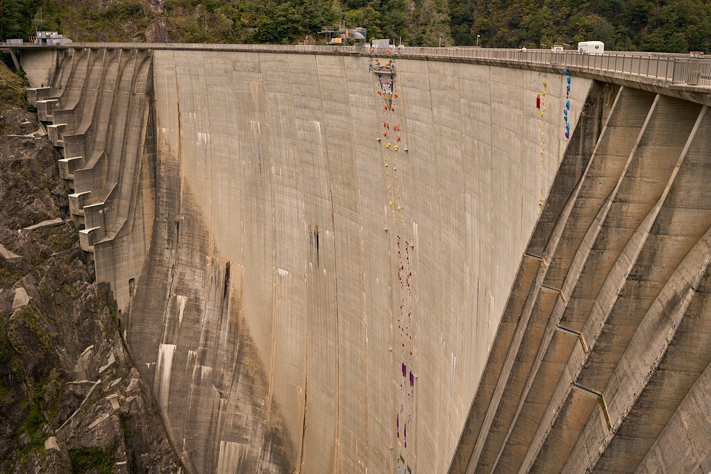 Wir erreichten den Parkplatz am östlichen Ende der Staumauer und fuhren weiter auf die Mauerkrone. Die Staumauer und die Aussicht über den See ins Verzascatal auf der einen und auf Bellinzona auf der anderen Seite waren noch so, wie ich sie vom letzten Besuch in Erinnerung hatte. Auch das 007-Bungyjumping-Angebot war an Wochenenden immer noch in Betrieb. Neu waren hingegen die beiden künstlichen Simultan-Kletterrouten in der Mitte der Mauer, auf denen im November ein Red Bull-Kletterwettkampf stattfinden würde. Die Routen machten einen sehr anstrengenden Eindruck auf mich, schliesslich waren sie genauso hoch wie die Staumauer und zudem wurde es zum Schluss hin aufgrund der Mauerwölbung immer überhängender.